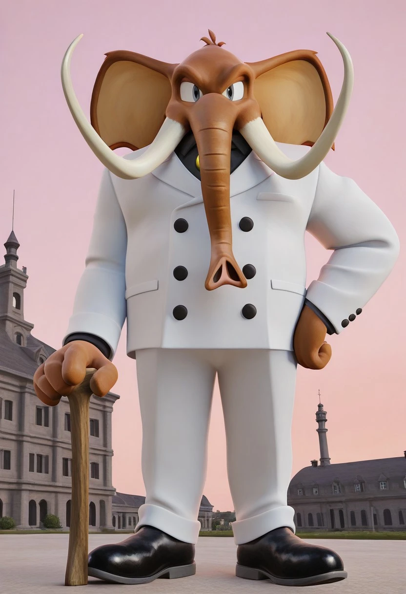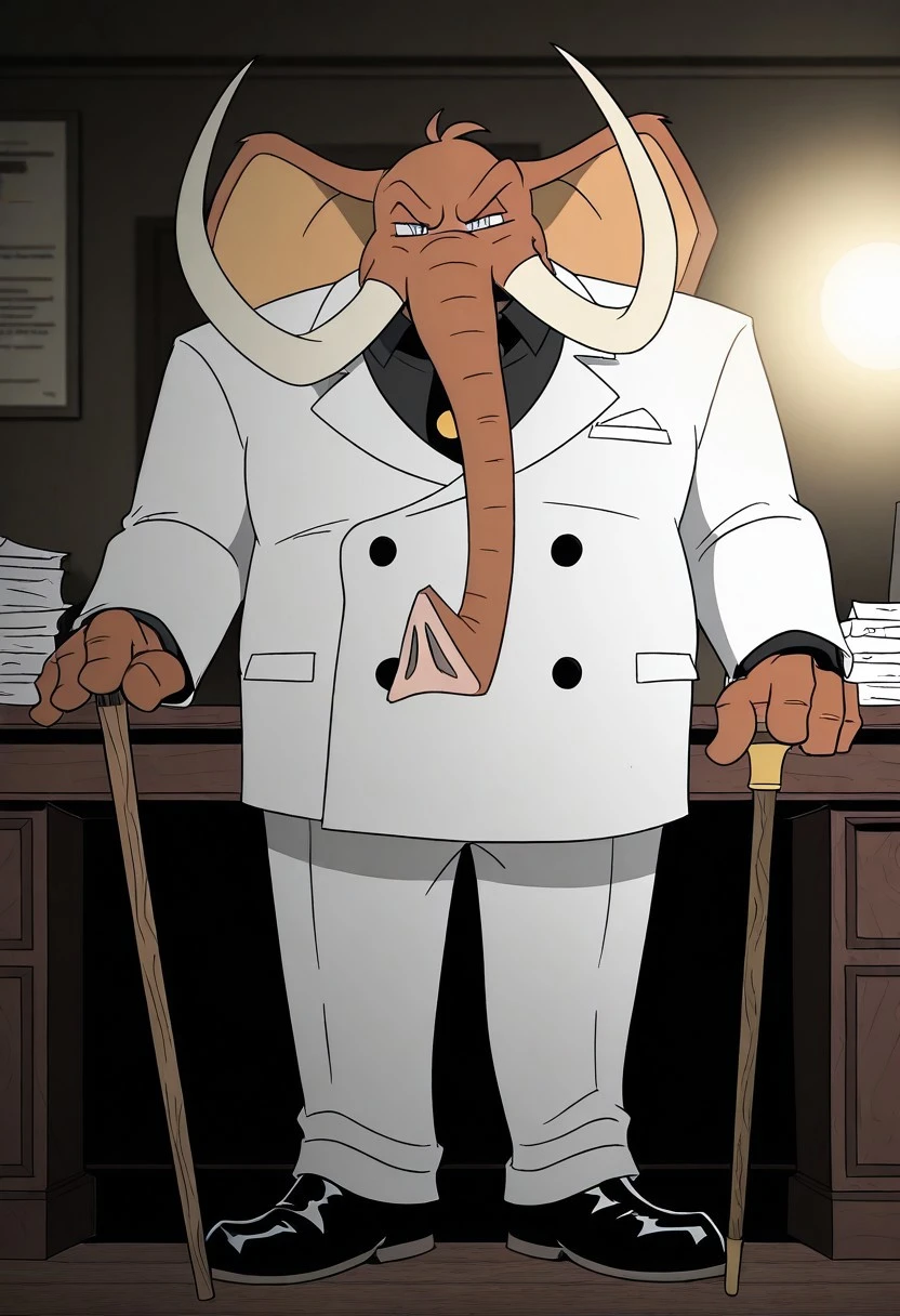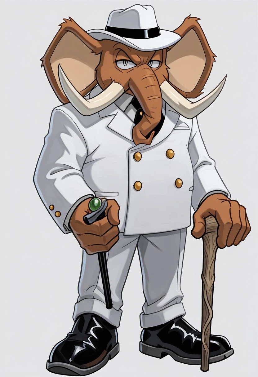 Mammoth Mogul, brown fur, big ears, gray eyes, large white tusks, long brown trunk, white fedora, white suit, black tie, golden buttons, white pants, black shoes