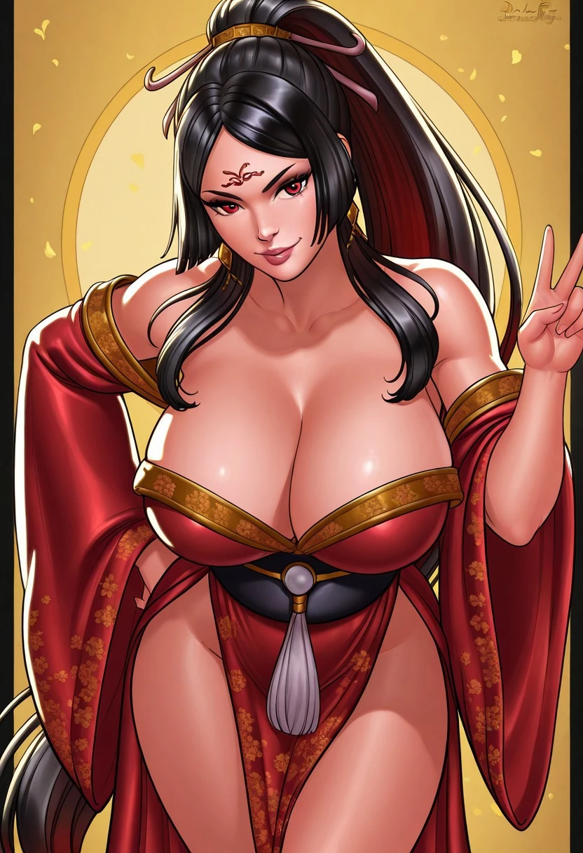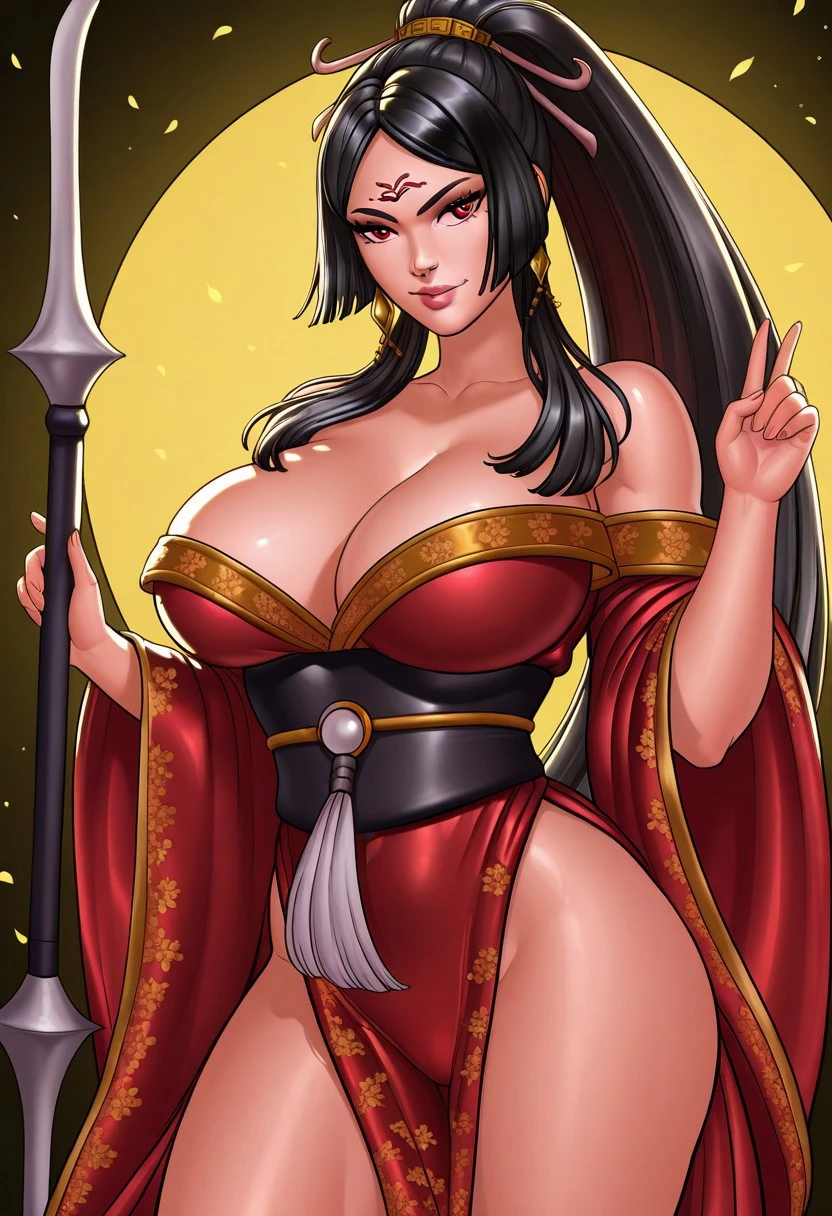 1girl,lara, red eyes, facial mark, black hair, ponytail, kimono, red kimono, yellow details on kimono,