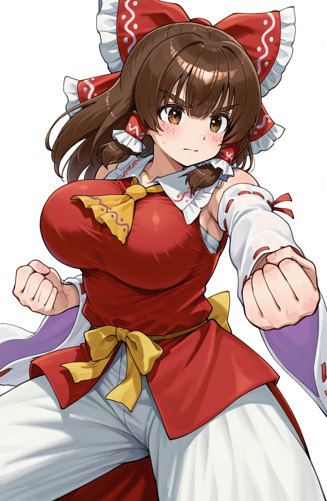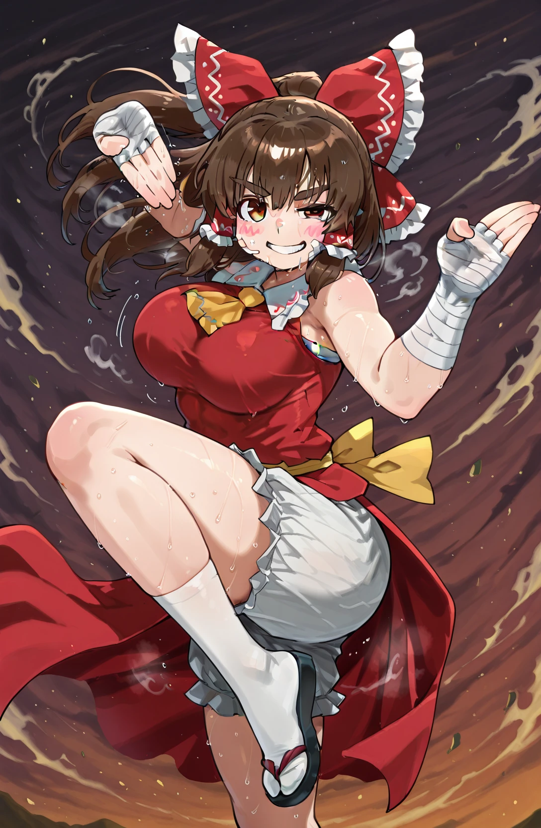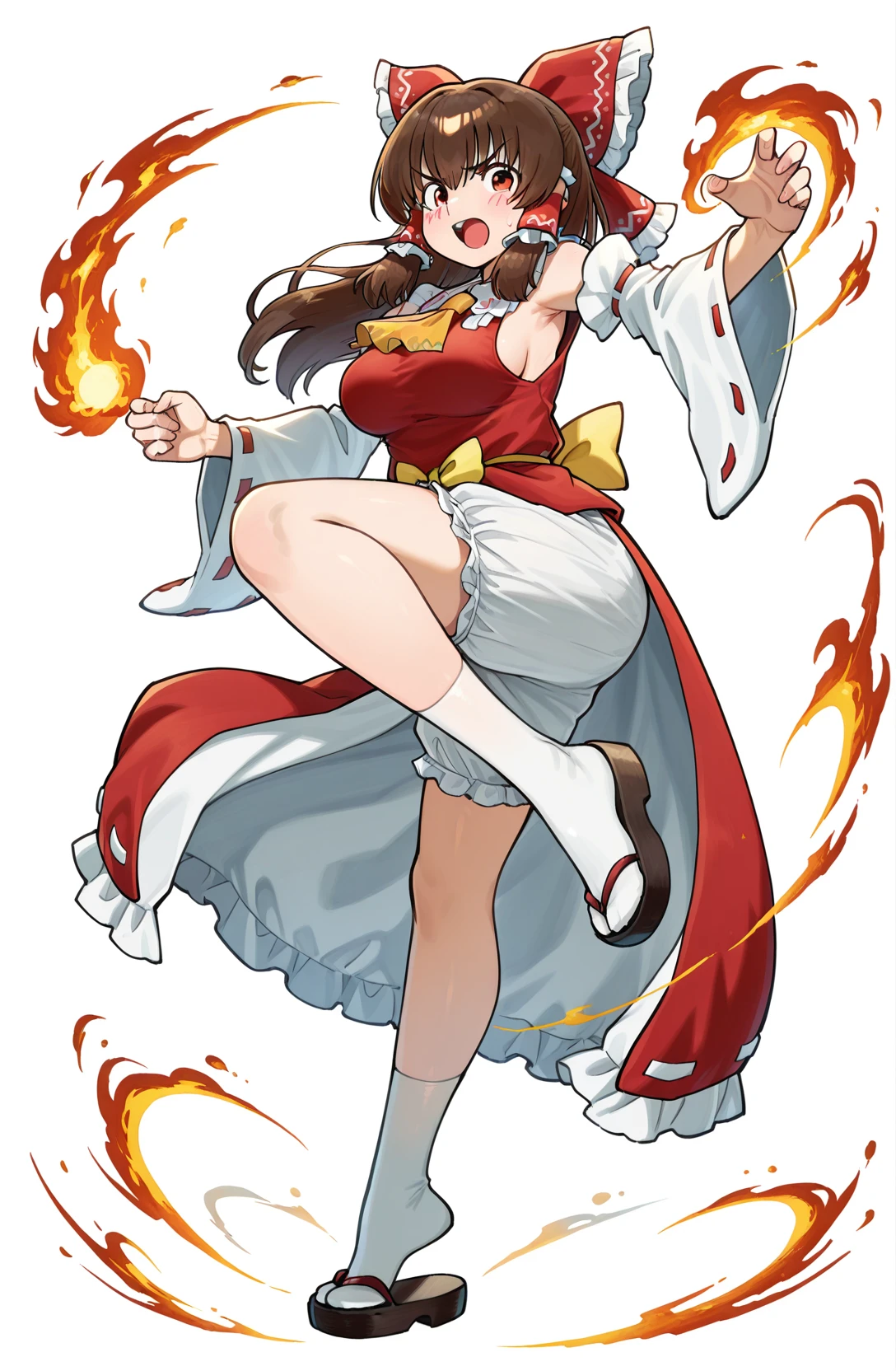 [ red shirt,red skirt,bloomers, ribbon trim, ribbon-trimmed sleeves, sleeveless shirt, yellow ascot, frilled bow, white sleeves, showgirl skirt, yellow waist bow, yellow string belt ,sarashi,white socks ,zouri]