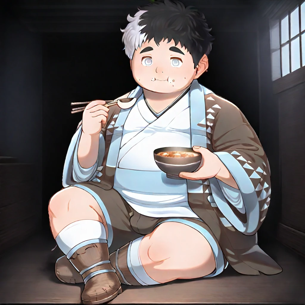 1boy, male focus, solo, fair skin, round face, short hair, messy hair, black hair, white hair, two-tone hair, cloudy blind eyes, light grey eyes, chubby, thick thighs