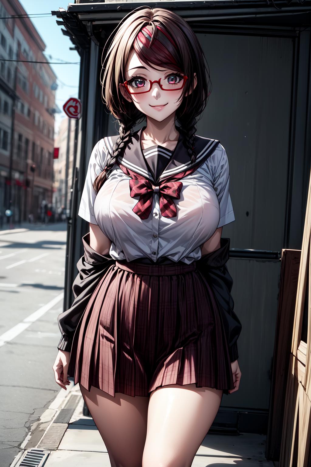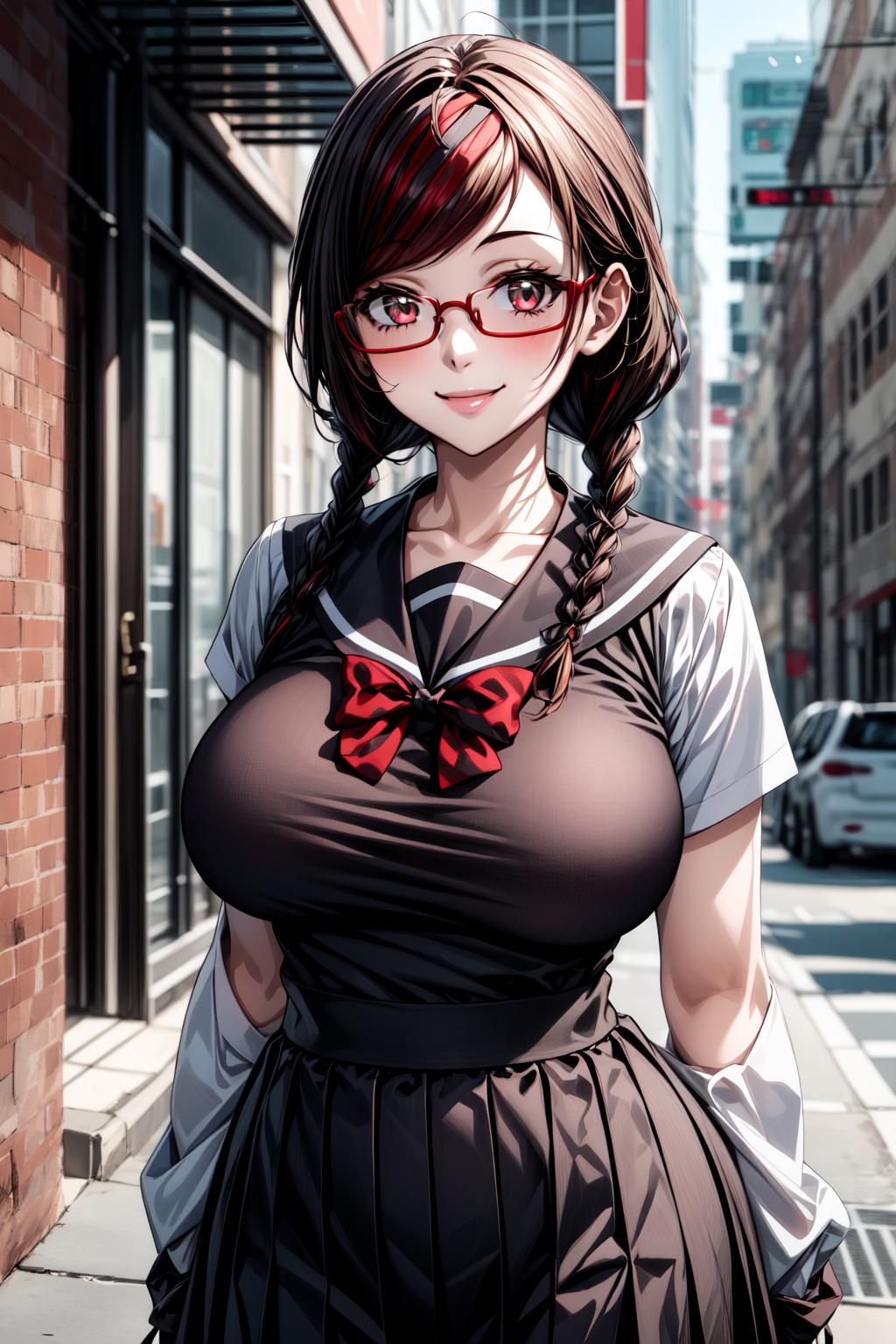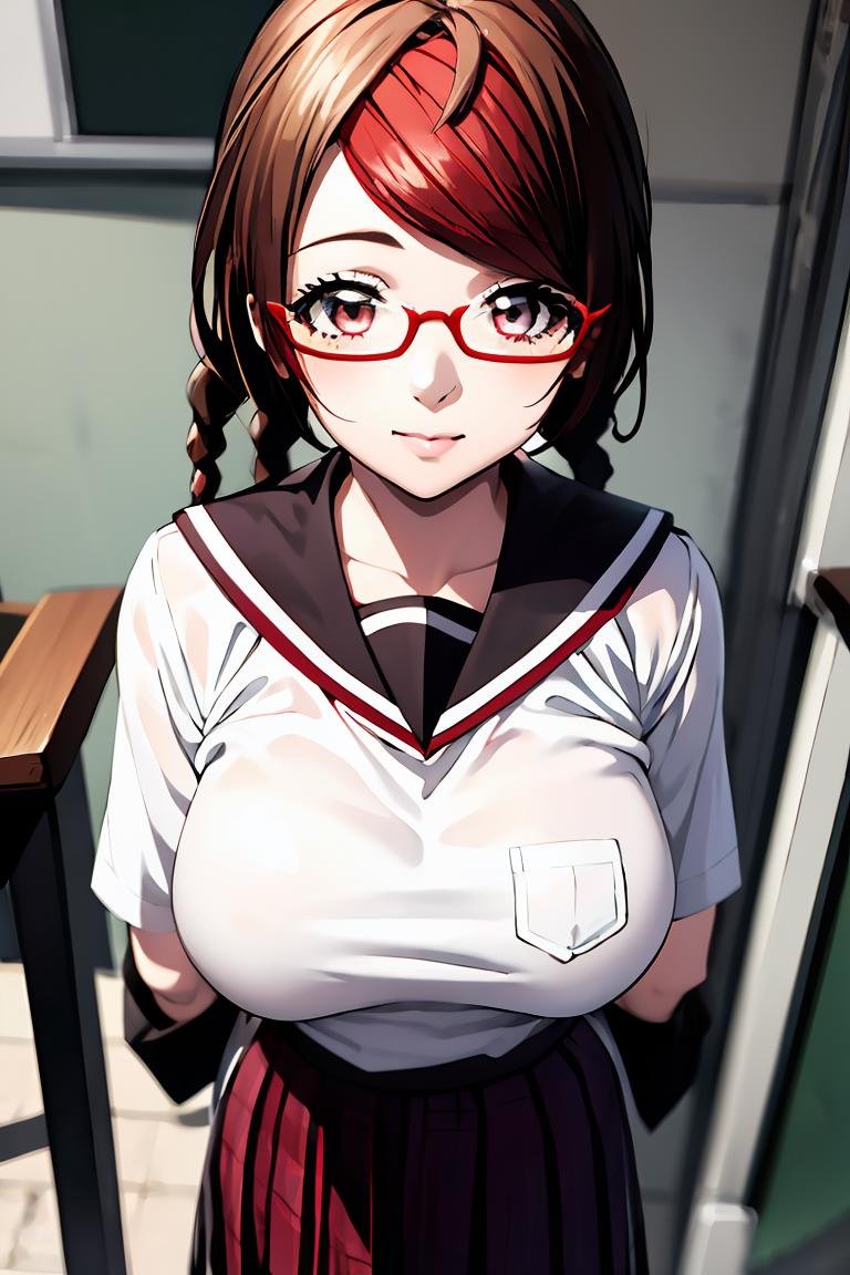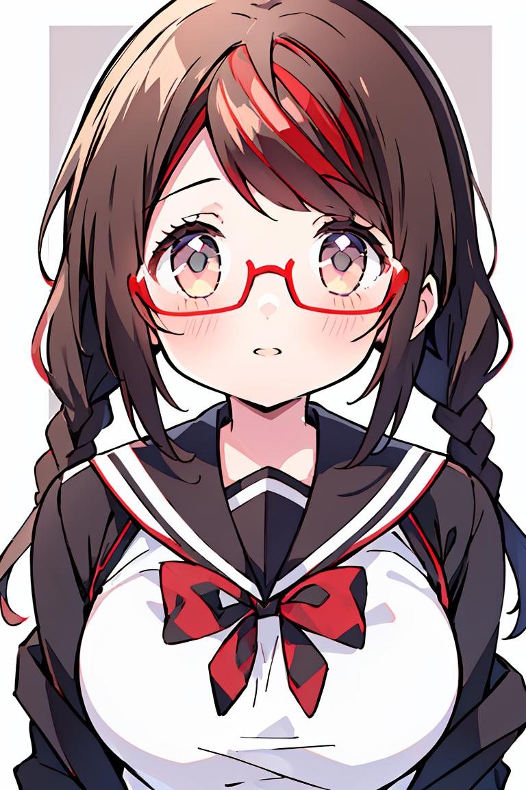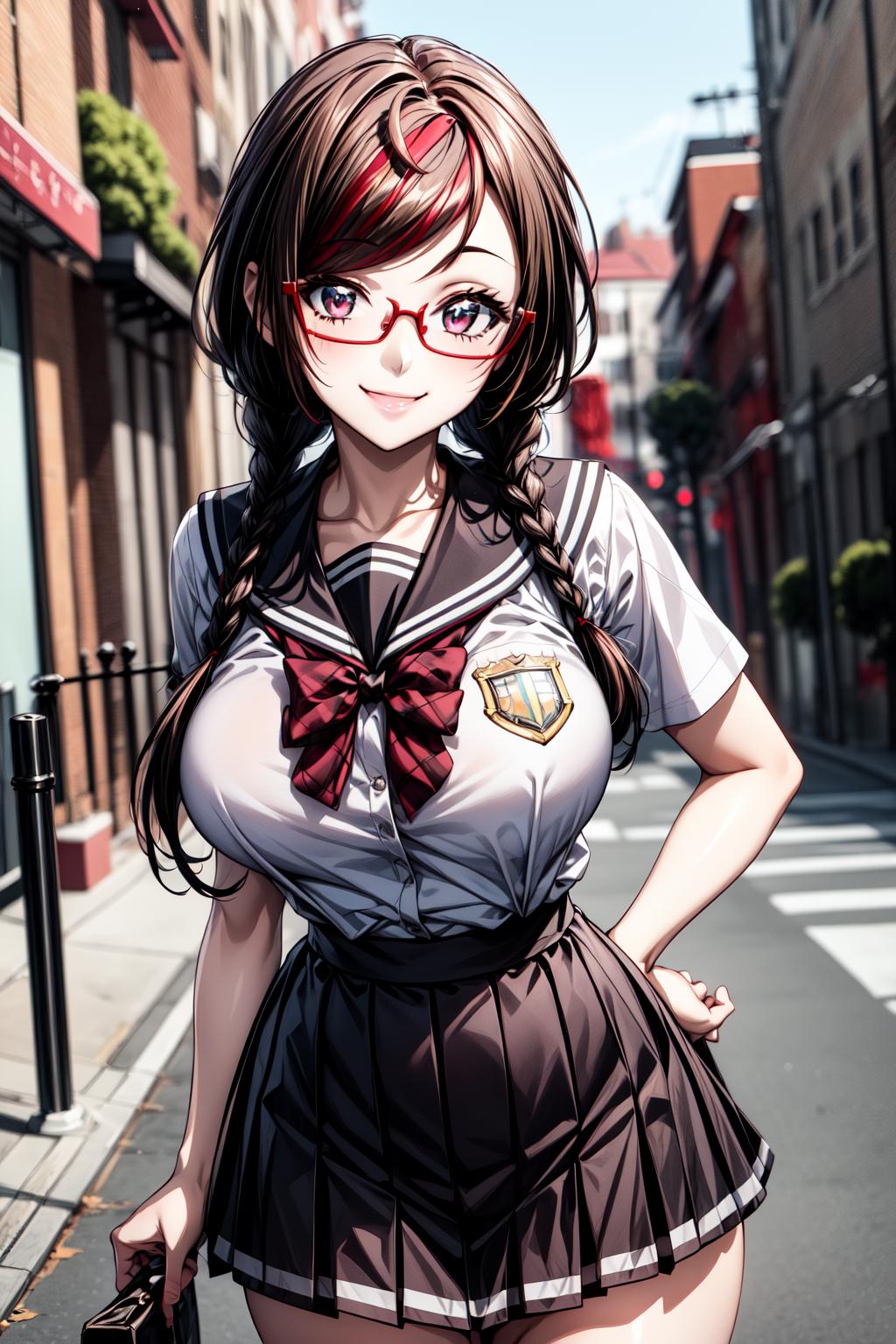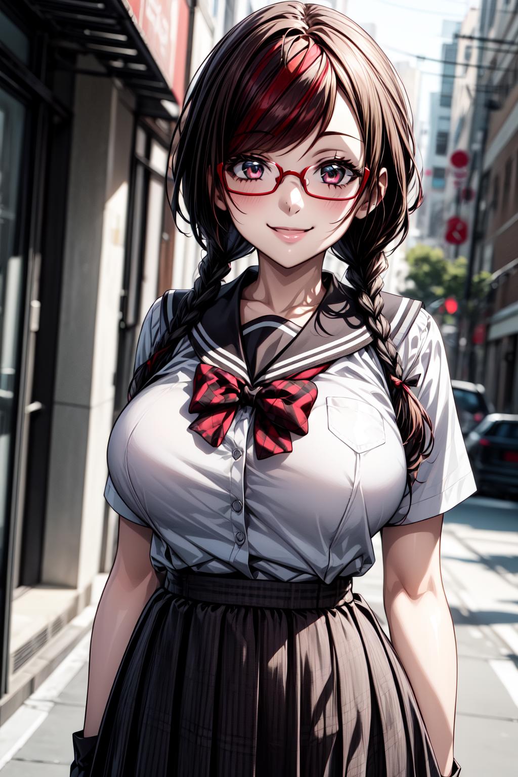MisakiSakimiyaNDV, 1girl, large breasts, glasses, streaked hair, twin braids, school uniform, red-framed eyewear, looking at viewerBest weight: 0.6-0.8