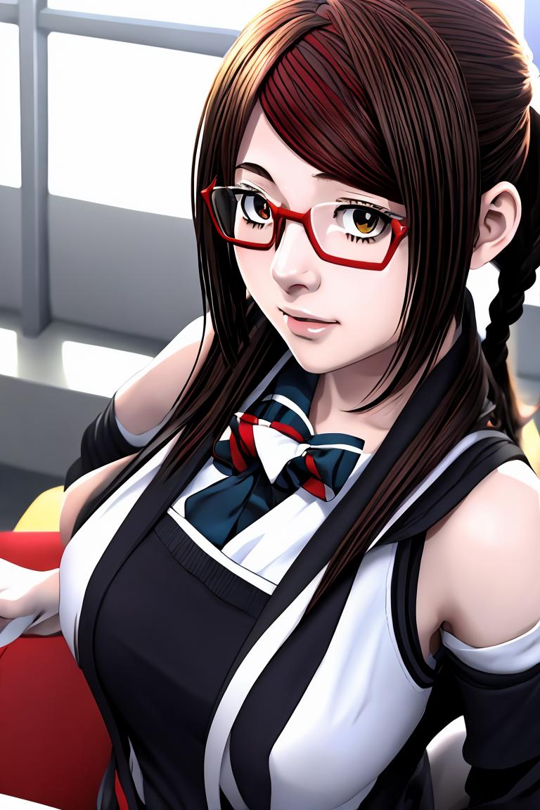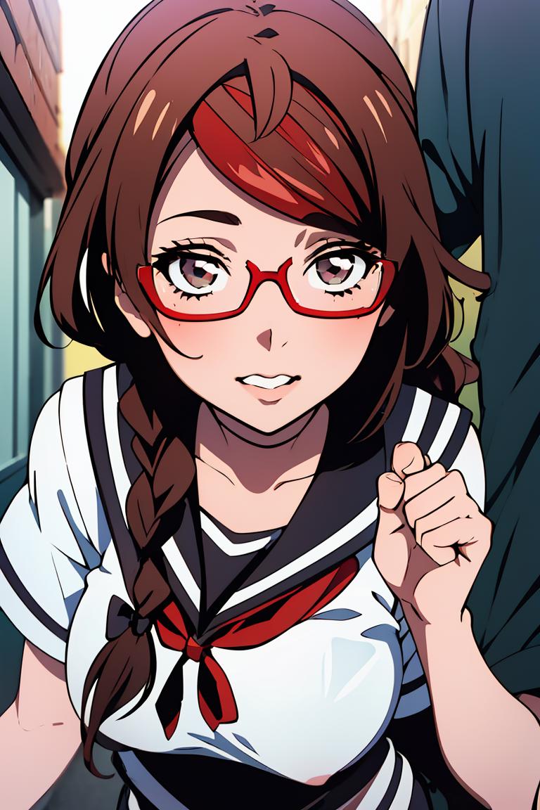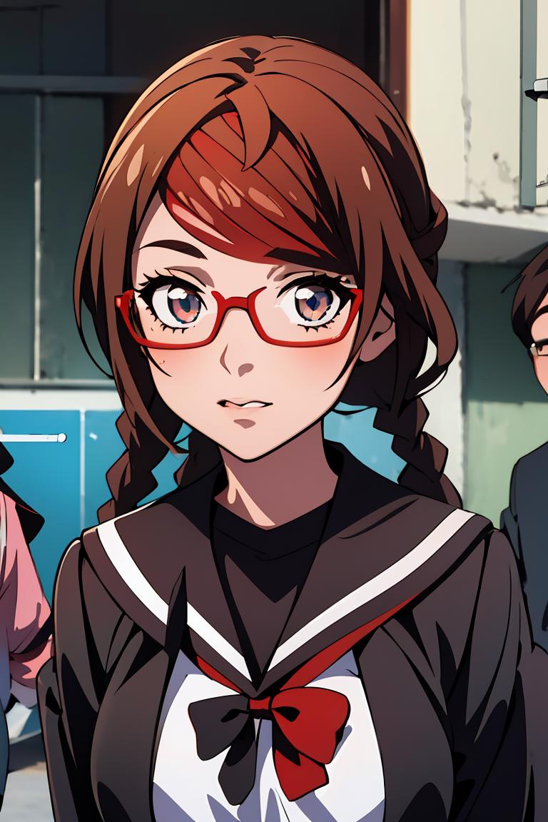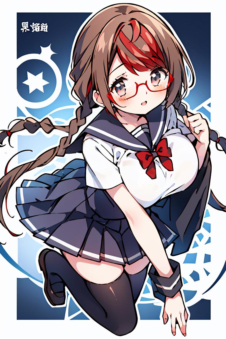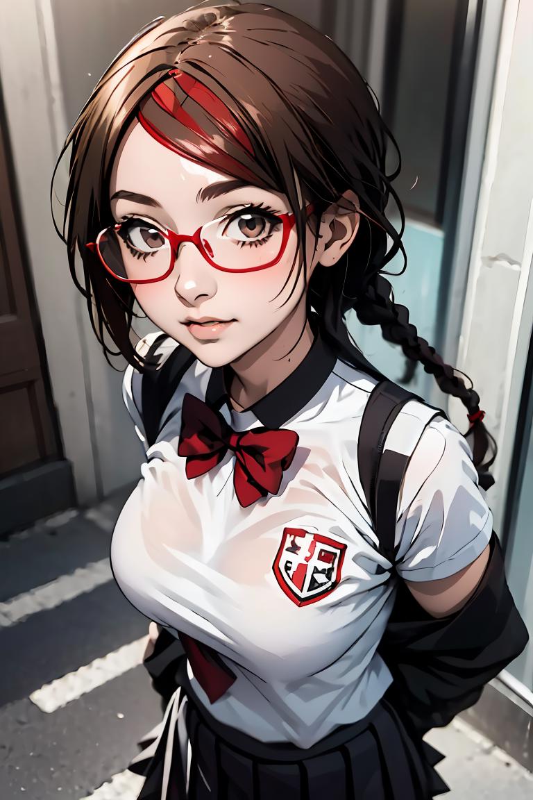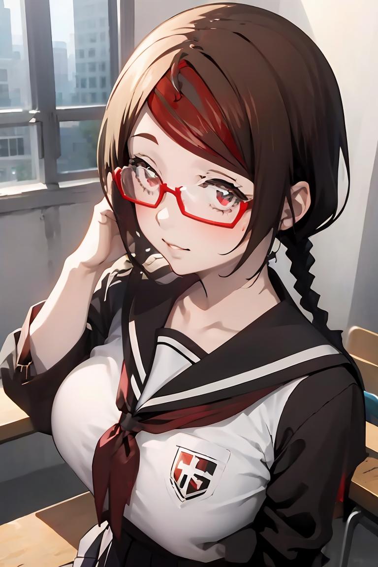 MisakiSakimiyaNDV, 1girl, large breasts, glasses, streaked hair, twin braids, school uniform, red-framed eyewear, looking at viewerBest weight: 0.6-0.8
