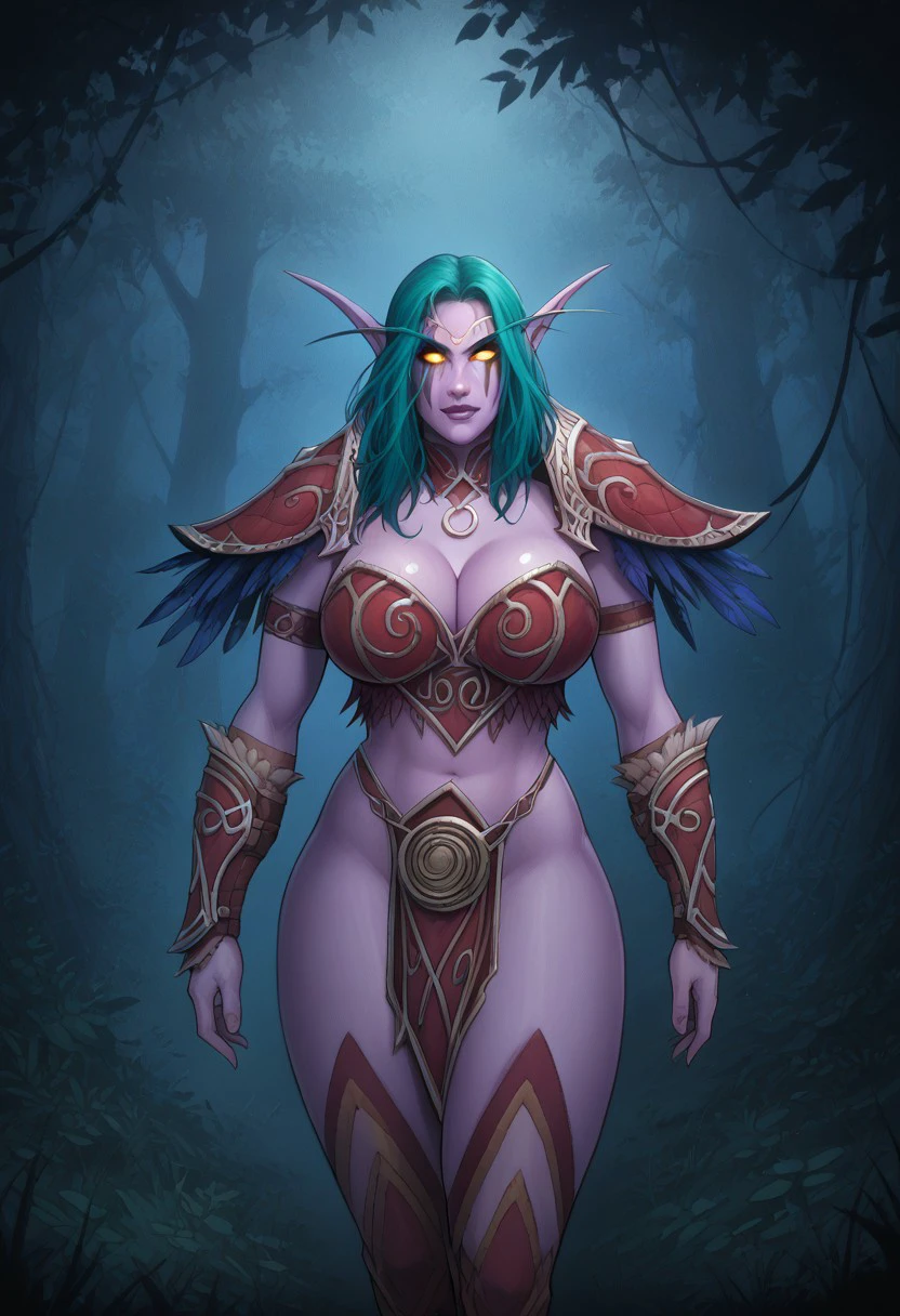 IlandraWildsong, purple skin, orange eyes, glowing eyes, long elf ears, long eyebrows, face markings,
