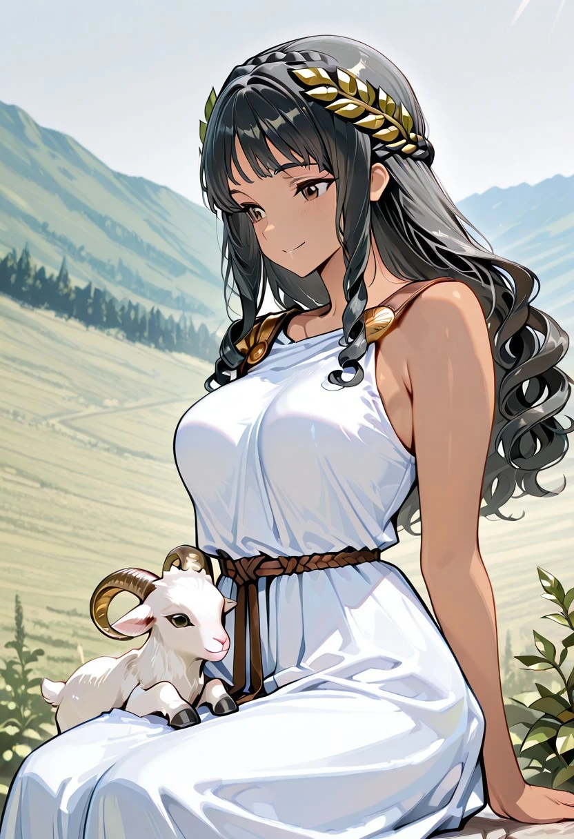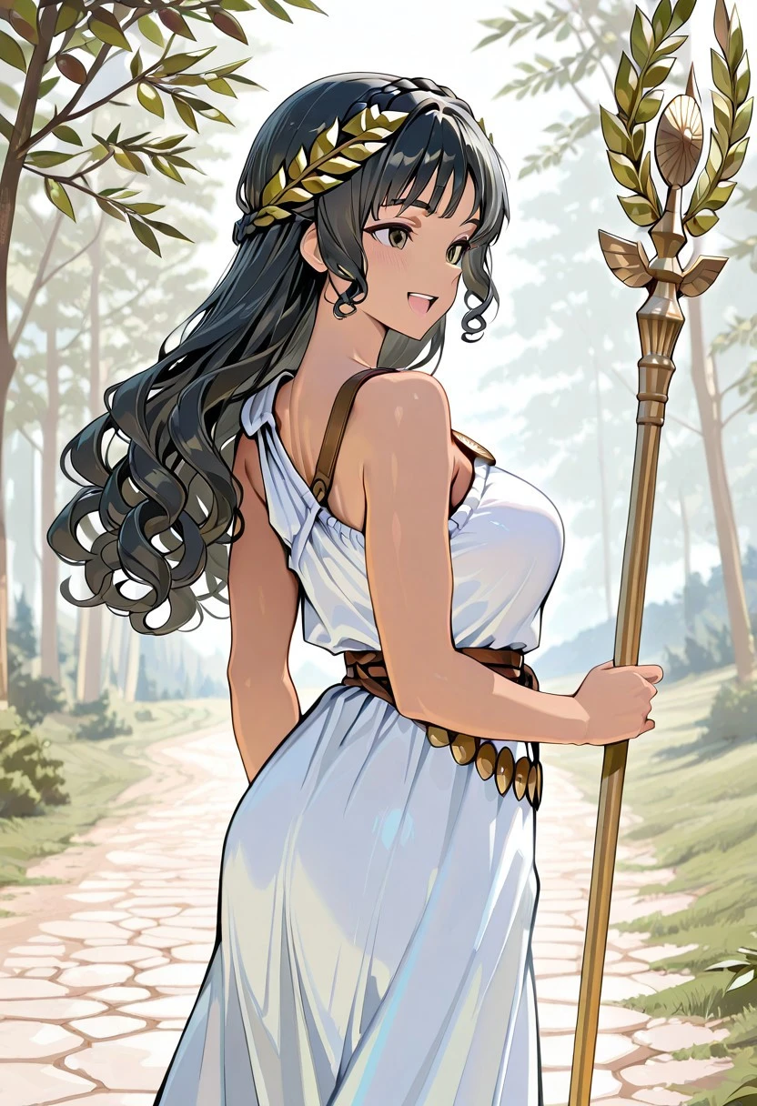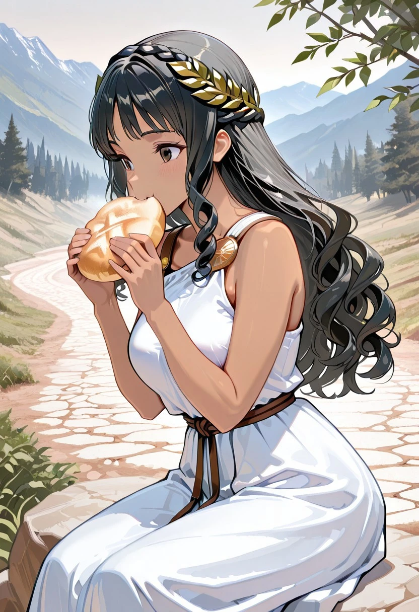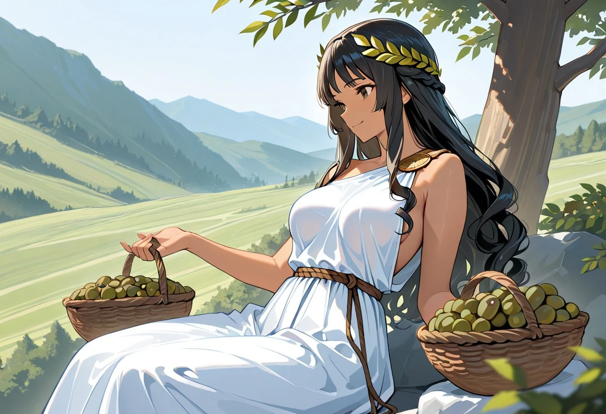 Tags Ex: white toga, long dress:1.3), covered breasts, 1 shoulder strap, bronze shoulder pins, brown string belt, green leafy laurel,