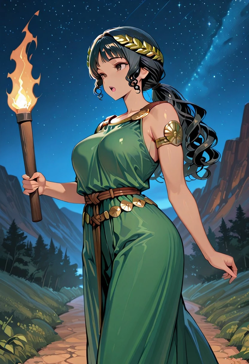 Trigger words: Toga, Chiton, brown string belt, Bronze shoulder pins, green leafy laurel