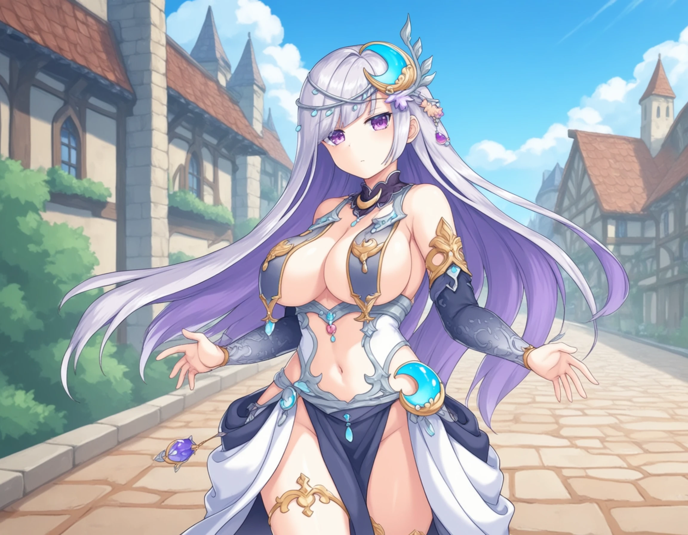 sideboob, underboob, revealing clothes, breast curtains, navel, silver diadem, hair ornament, crescent hair ornament, crescent on neck, flower ornament, thigh crescent, thighlet, jewelry, gem, purple gem, cleavage, center opening, bare shoulders, detached collar, detached sleeves, pelvic curtain, loincloth, ankle lace-up, high heels,