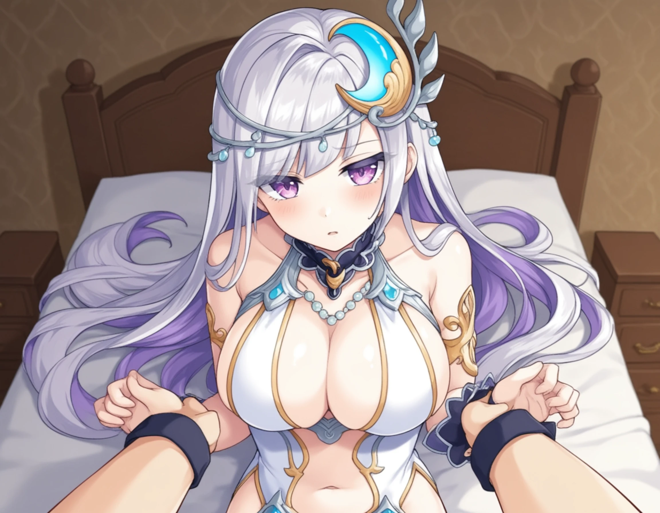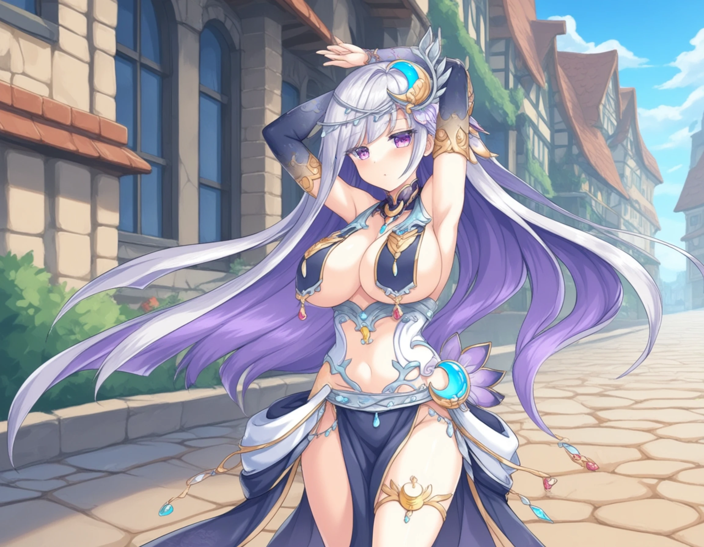 legendartm, 1girl, white skin, very long hair, silver hair, light purple inner hair, purple eyes, large breasts,