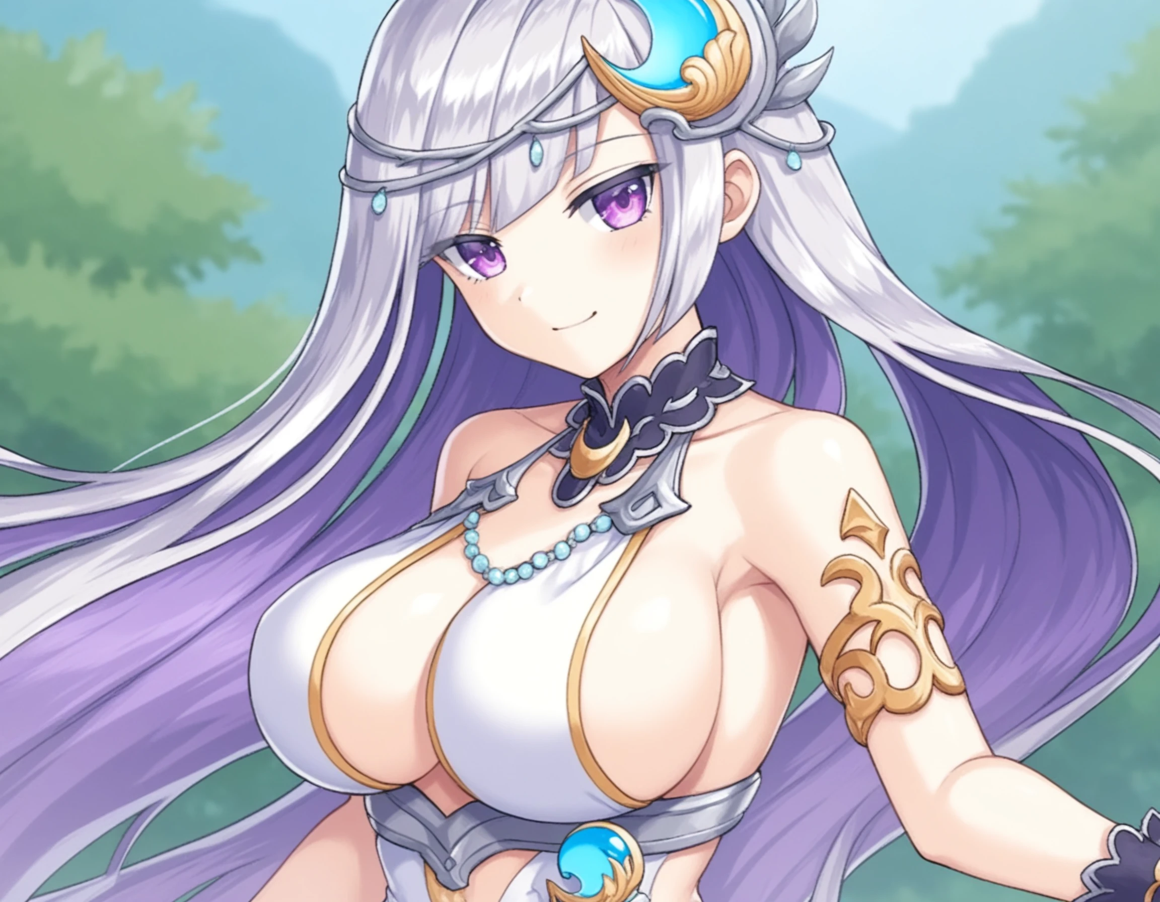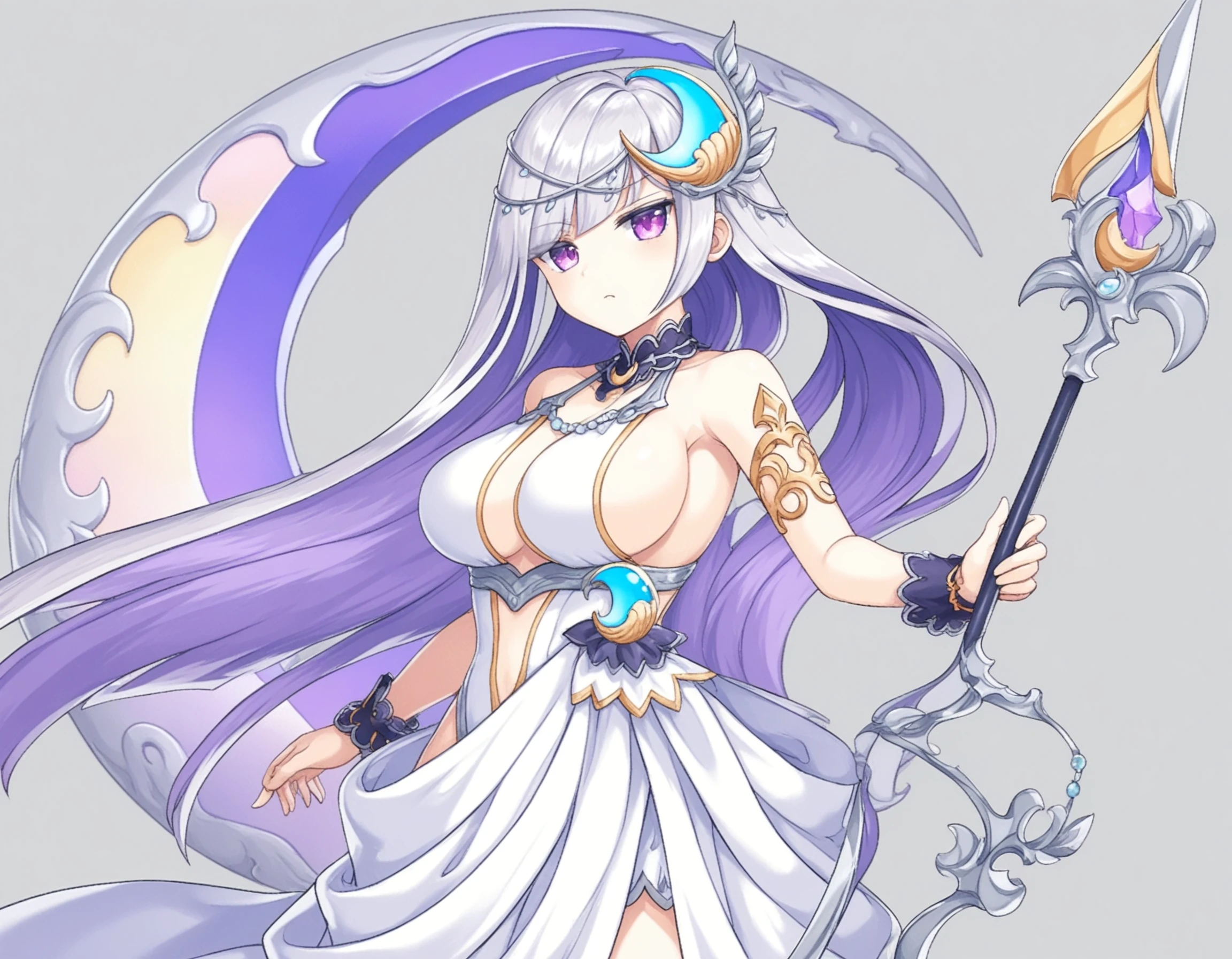 legendartm, 1girl, white skin, very long hair, silver hair, light purple inner hair, purple eyes, large breasts