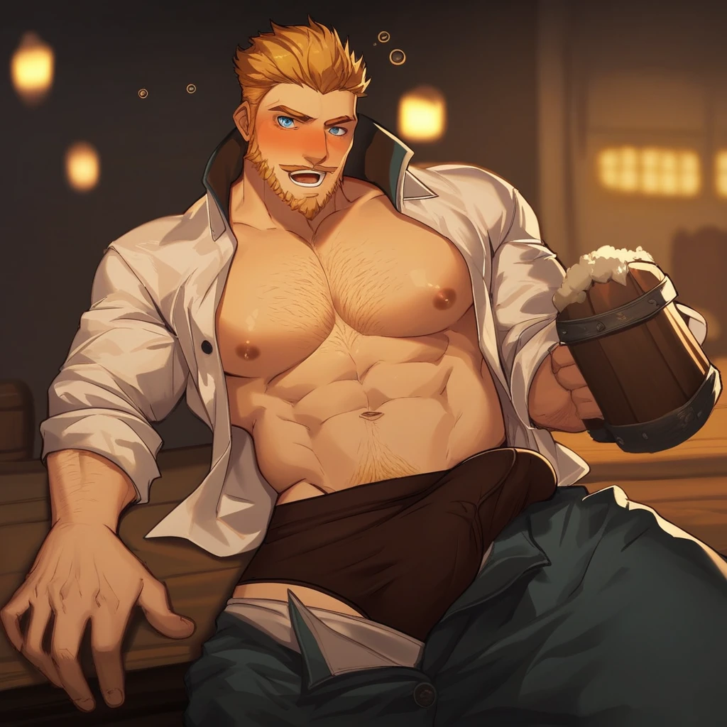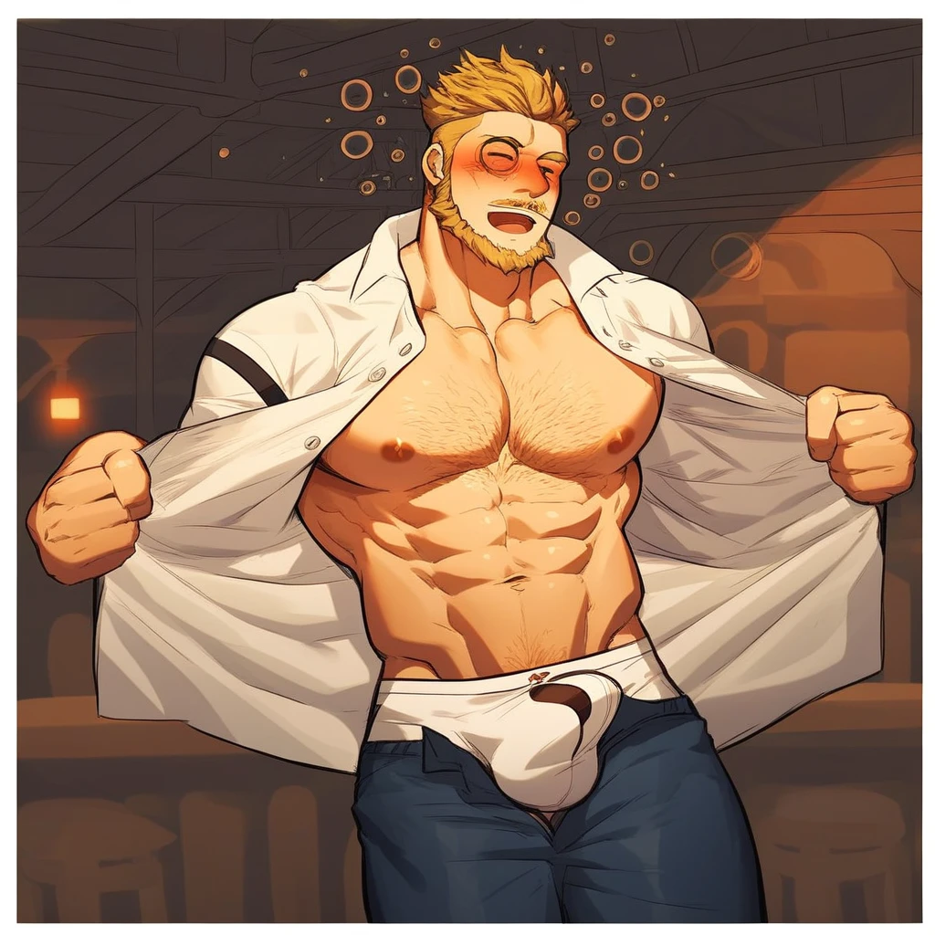 Cyrus, bara, muscular male, blue eyes, facial hair ,beard, mustache, blond hair,short hair,
