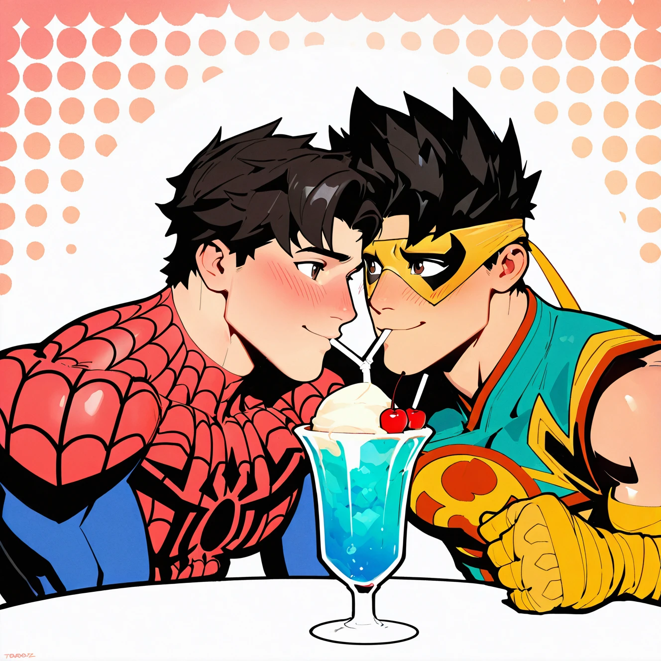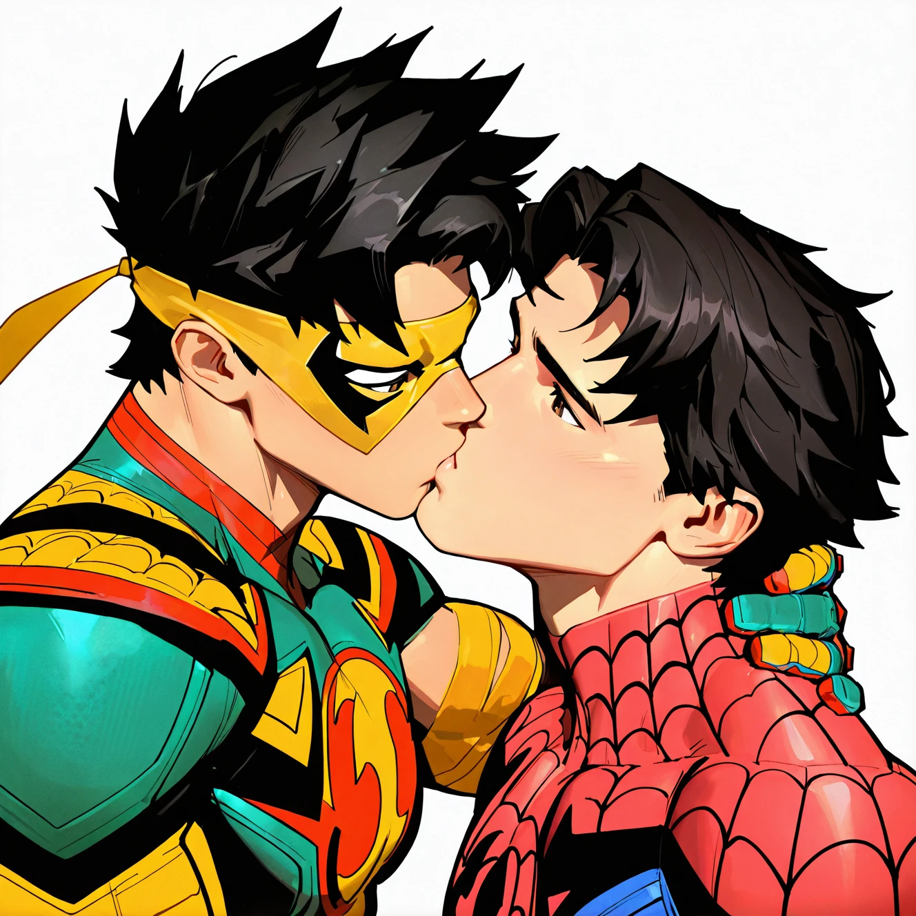 <lora:SPIDERFIST-05:1> spiderfist, short hair, male focus, multiple boys, 2boys, muscular, black hair, muscular male, yaoi, bara, pectorals, large pectorals, looking at another, mask, blush, bodysuit, domino mask, brown hair, ???????, ????, smile, ????????, superhero, abs