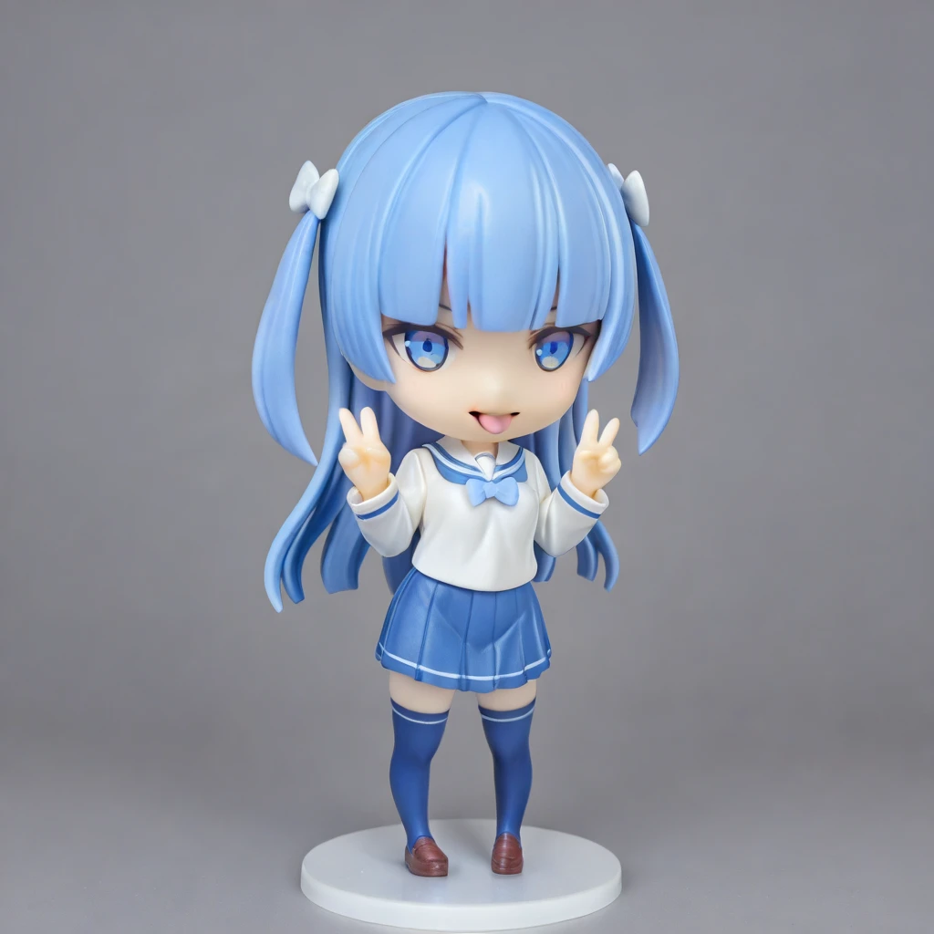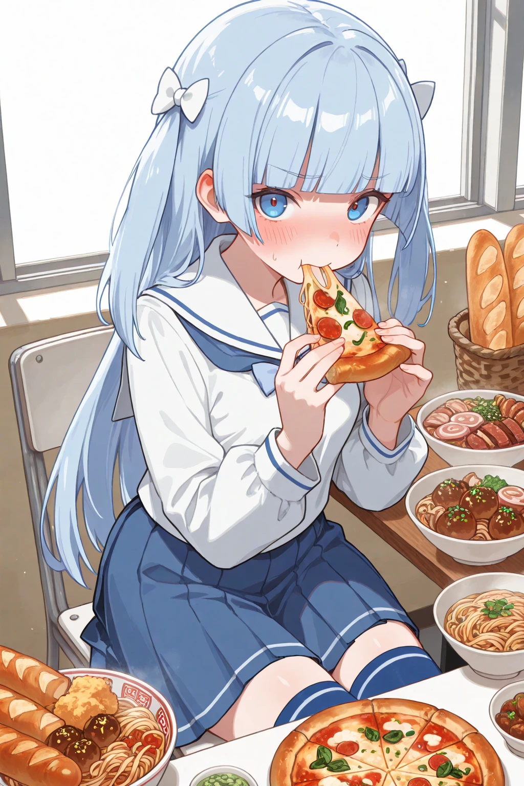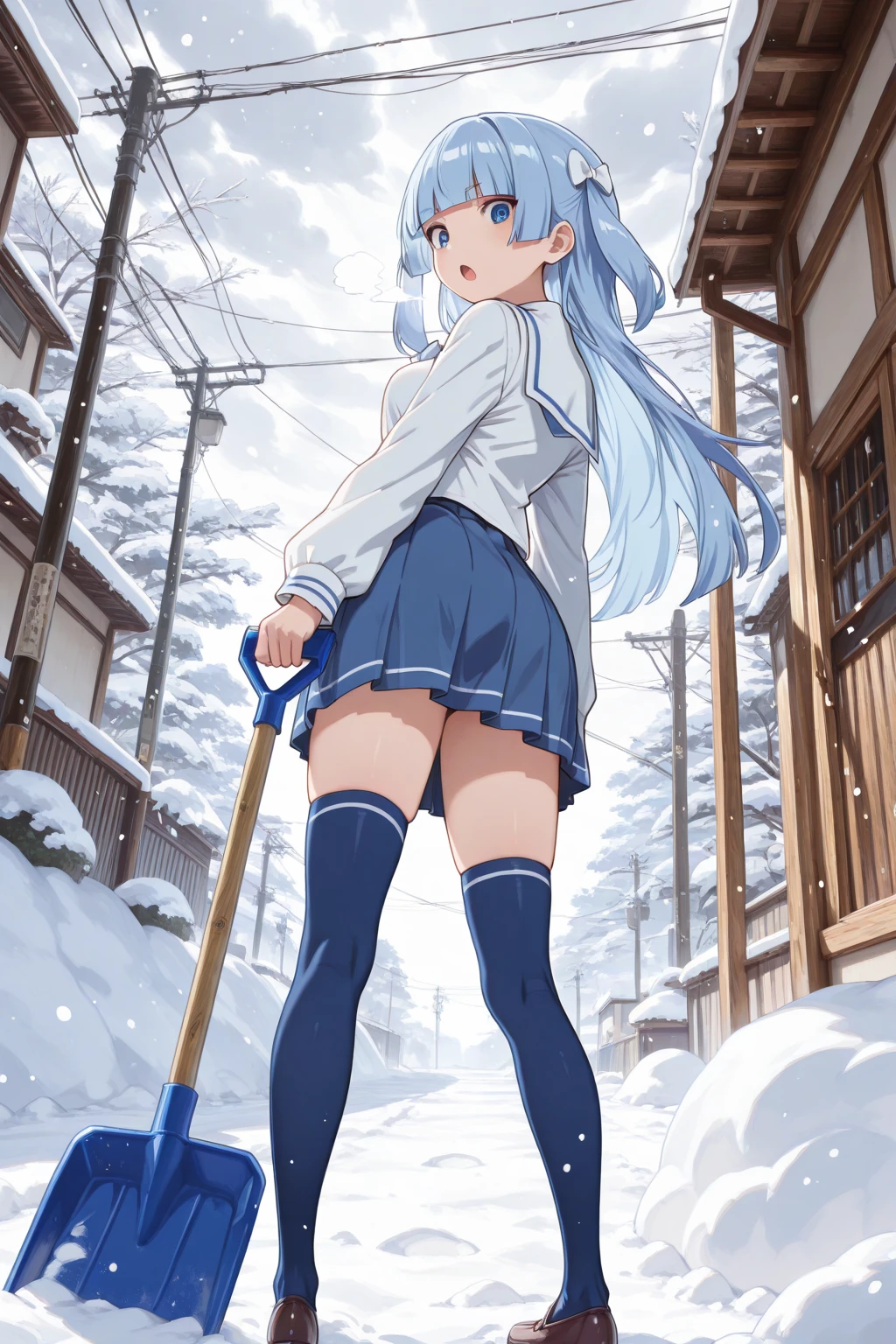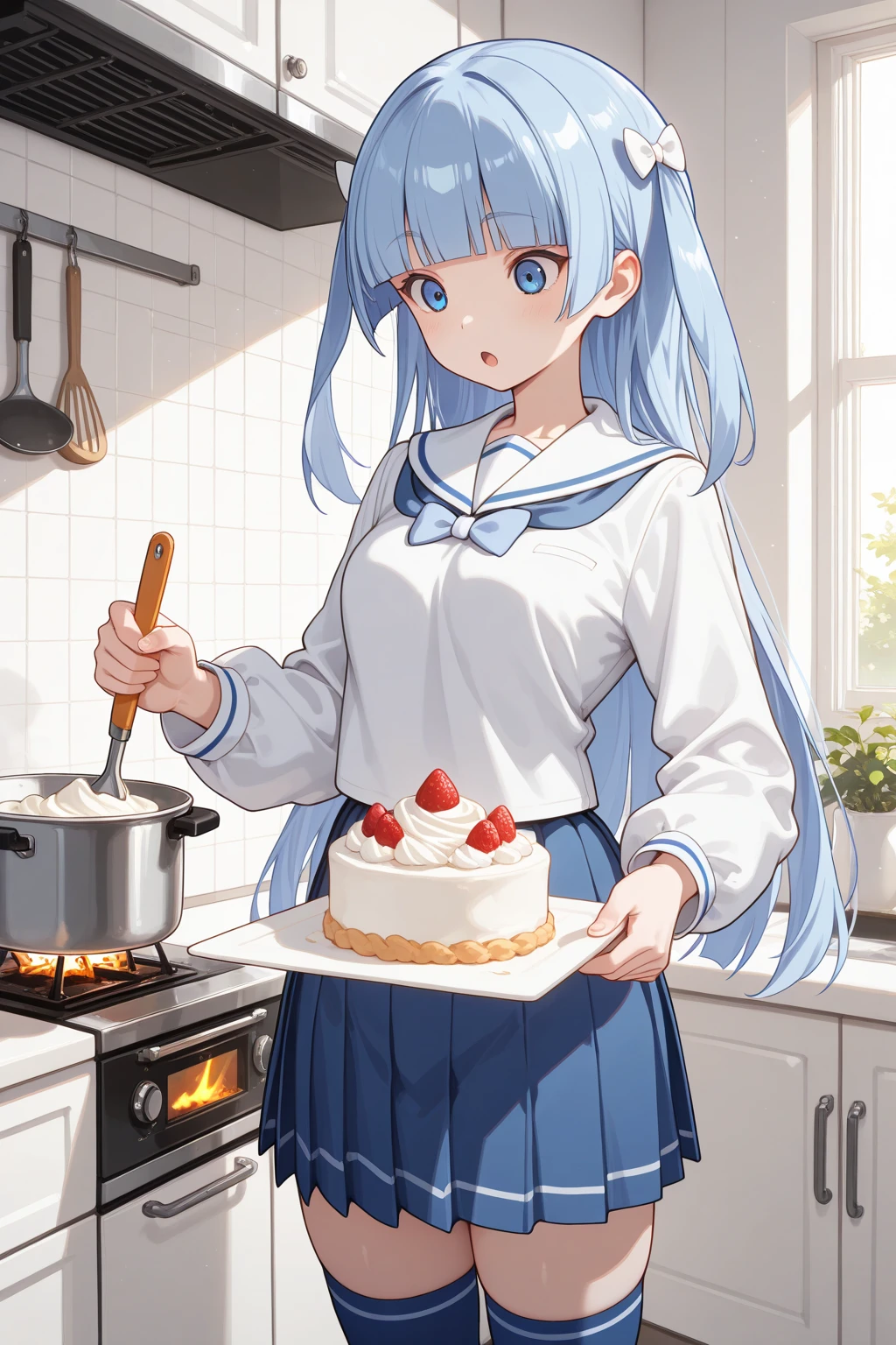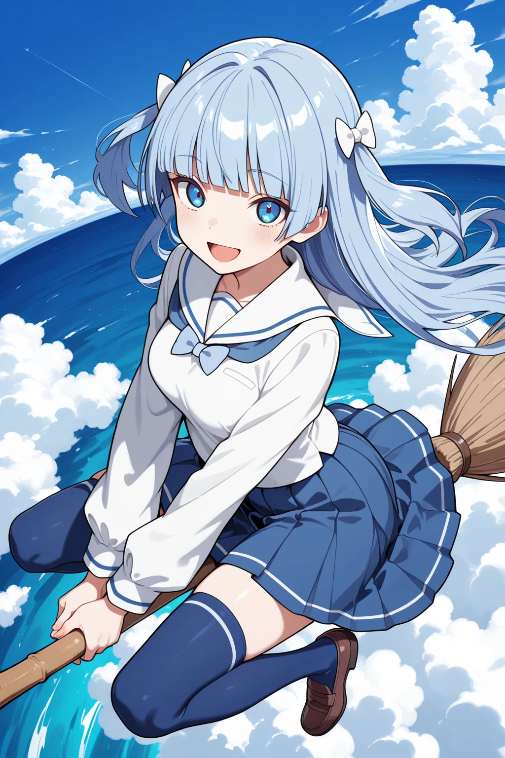 Trigger word: K_Tokiwa, blue hair, long hair, two side up, white hair bow, blunt bangs, blue eyes, school uniform, serafuku, white shirt, white sailor collar, blue bowtie, long sleeves, blue skirt, pleated skirt, zettai ryouiki, blue thighhighsAddition: brown loafers