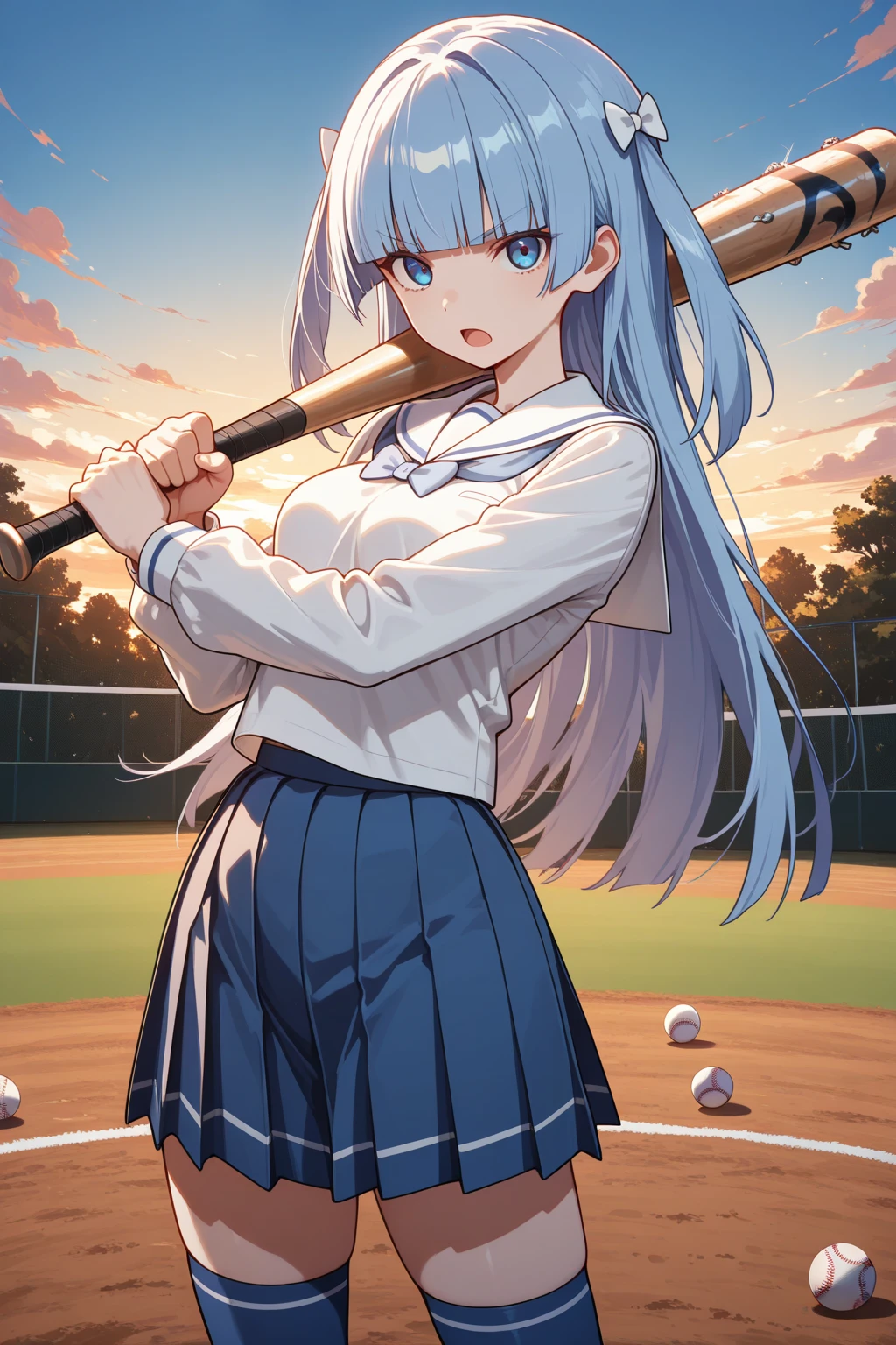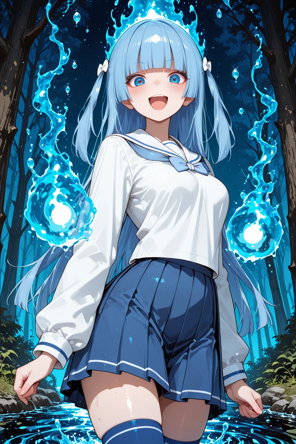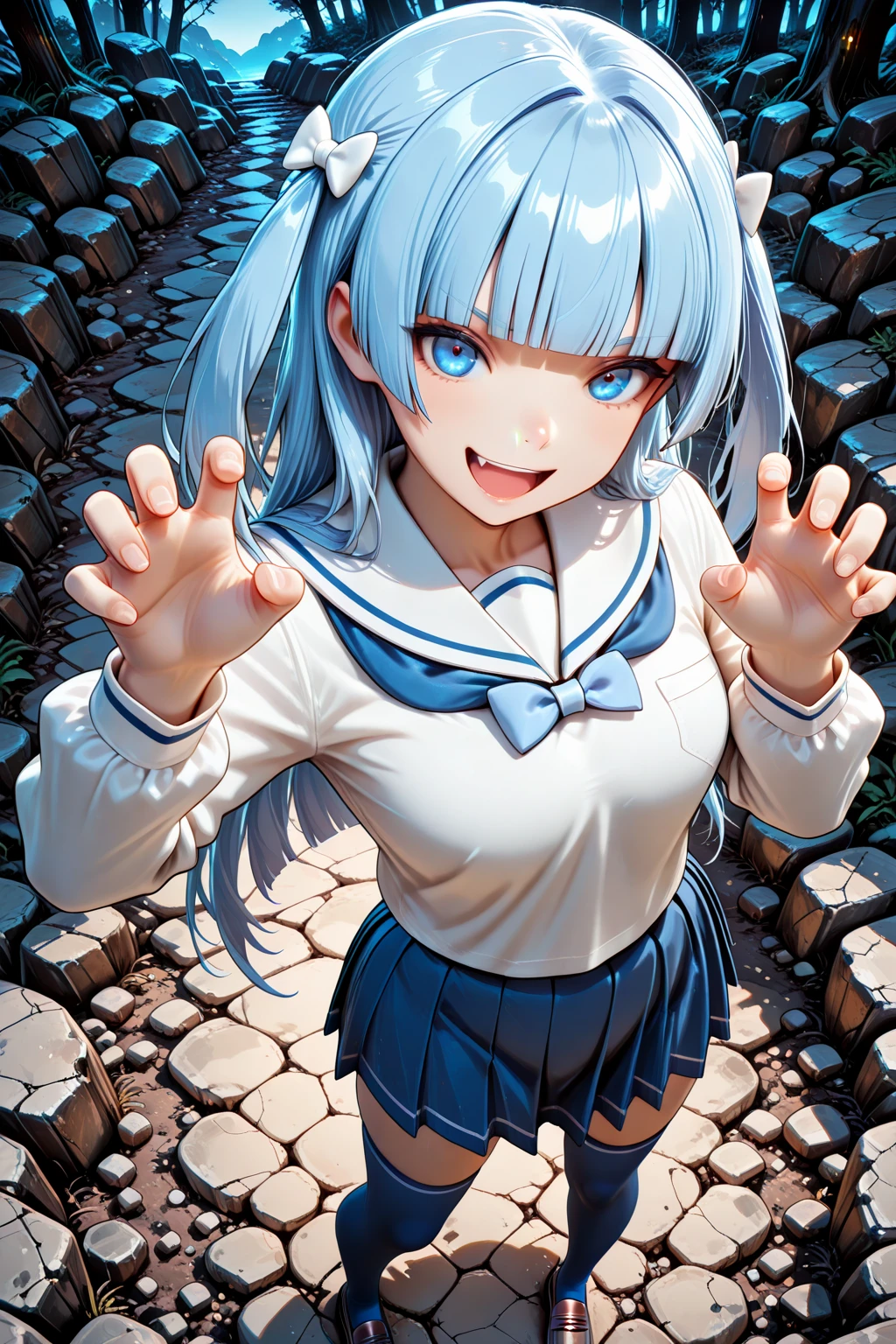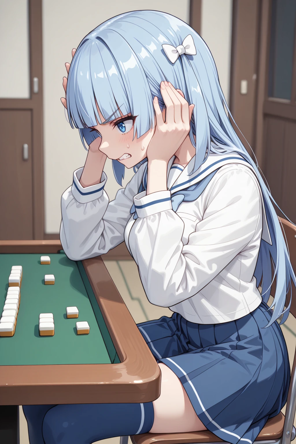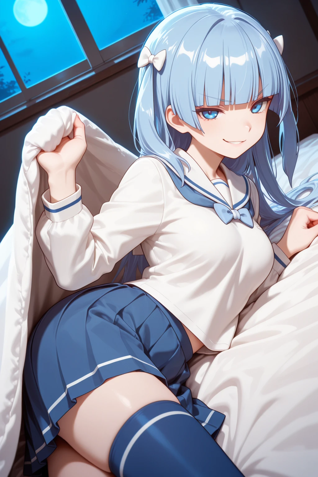 Trigger word: K_Tokiwa, blue hair, long hair, two side up, white hair bow, blunt bangs, blue eyes, school uniform, serafuku, white shirt, white sailor collar, blue bowtie, long sleeves, blue skirt, pleated skirt, zettai ryouiki, blue thighhighsAddition: brown loafers