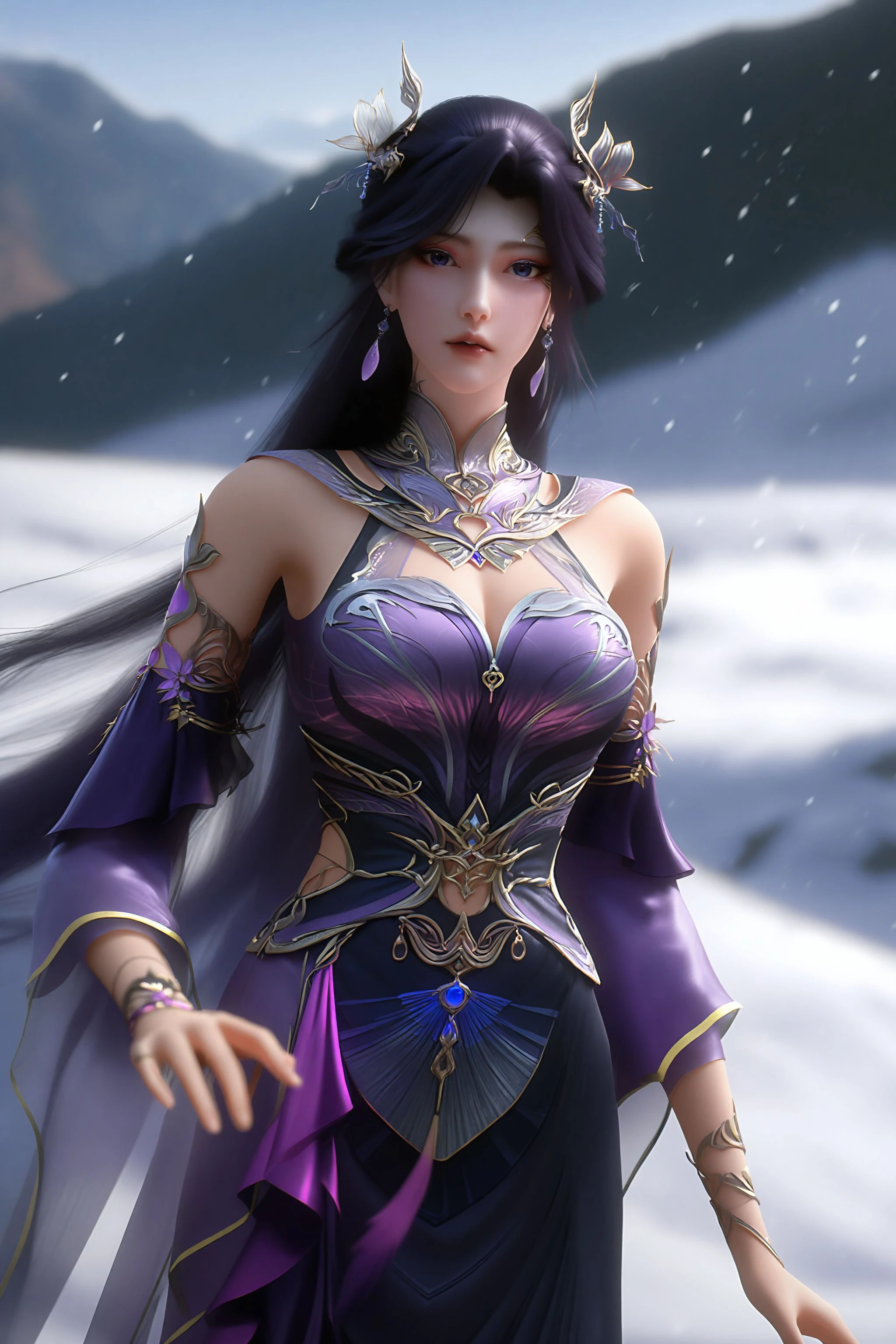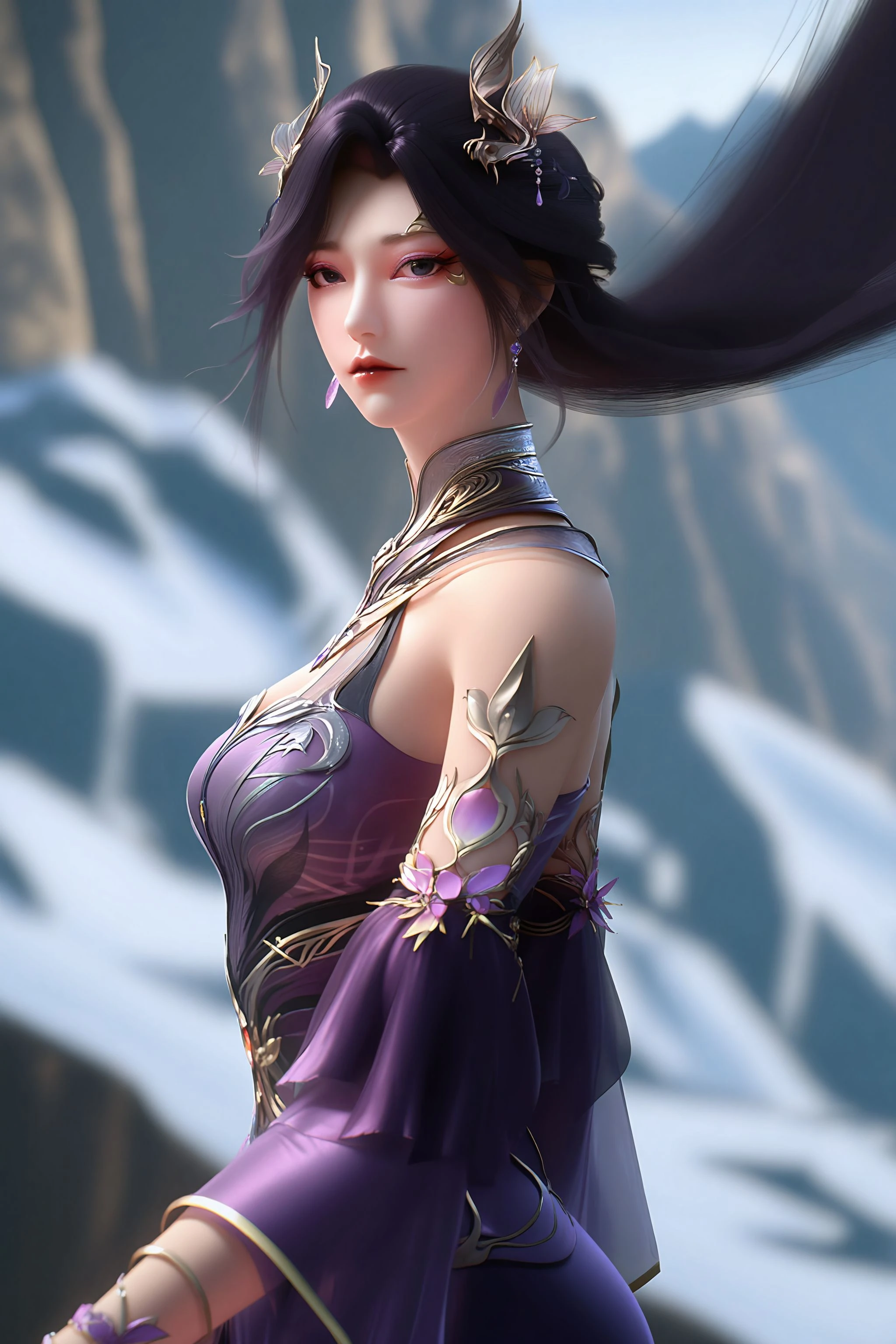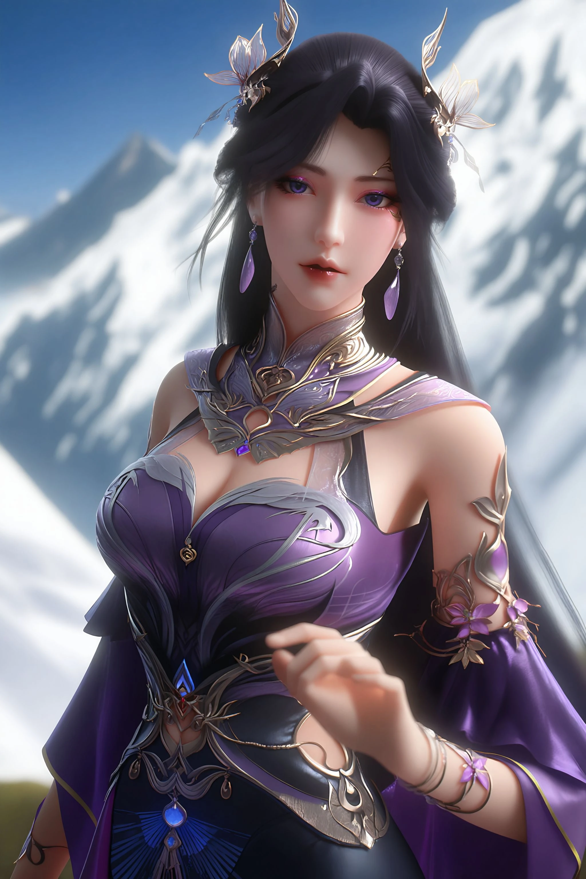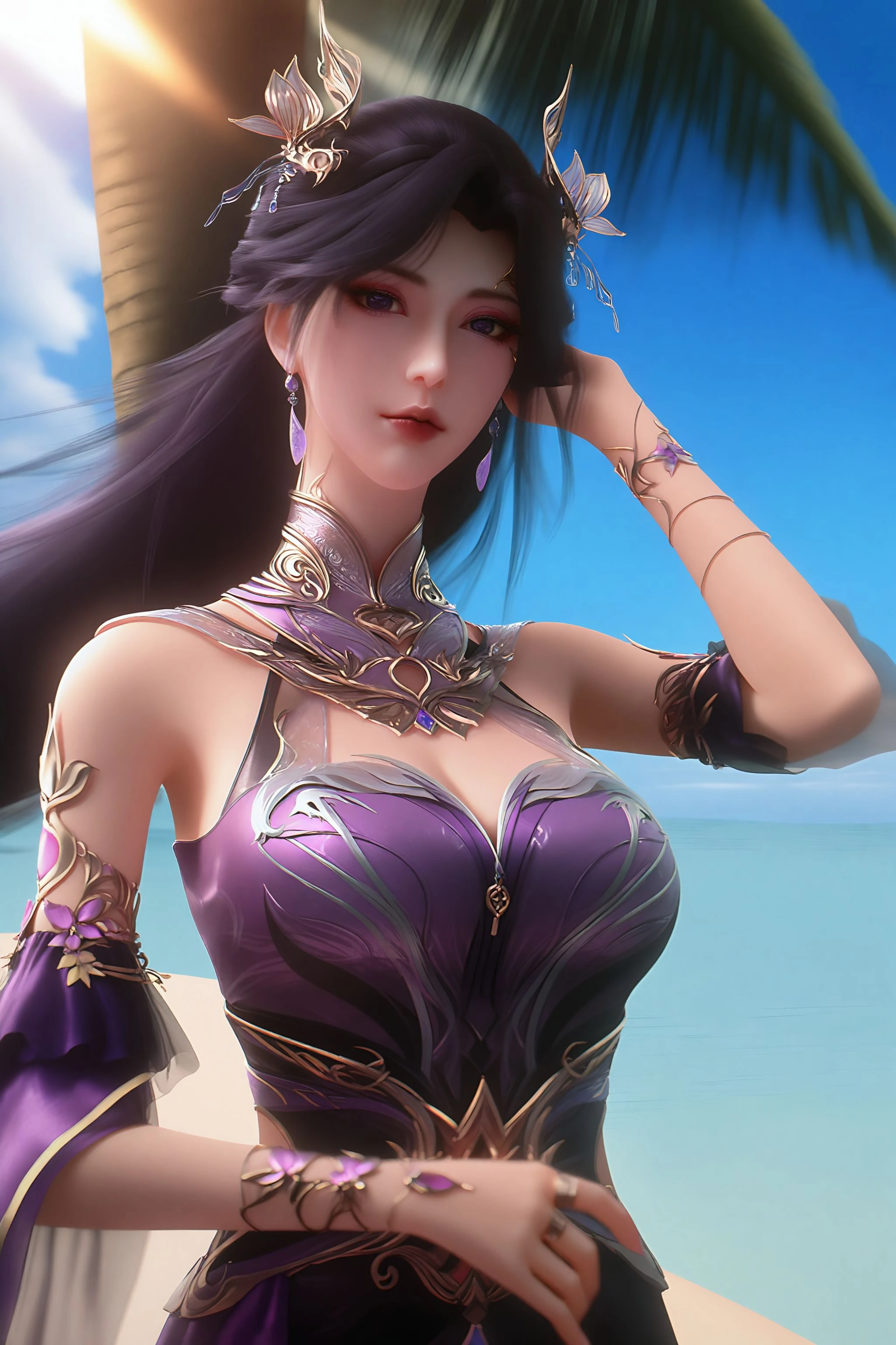 1girl,solo,dress,hair ornament,long hair,jewelry,bare shoulders,purple dress,detached sleeves,black hair,clothing cutout,earrings,bracelet,parted lips,