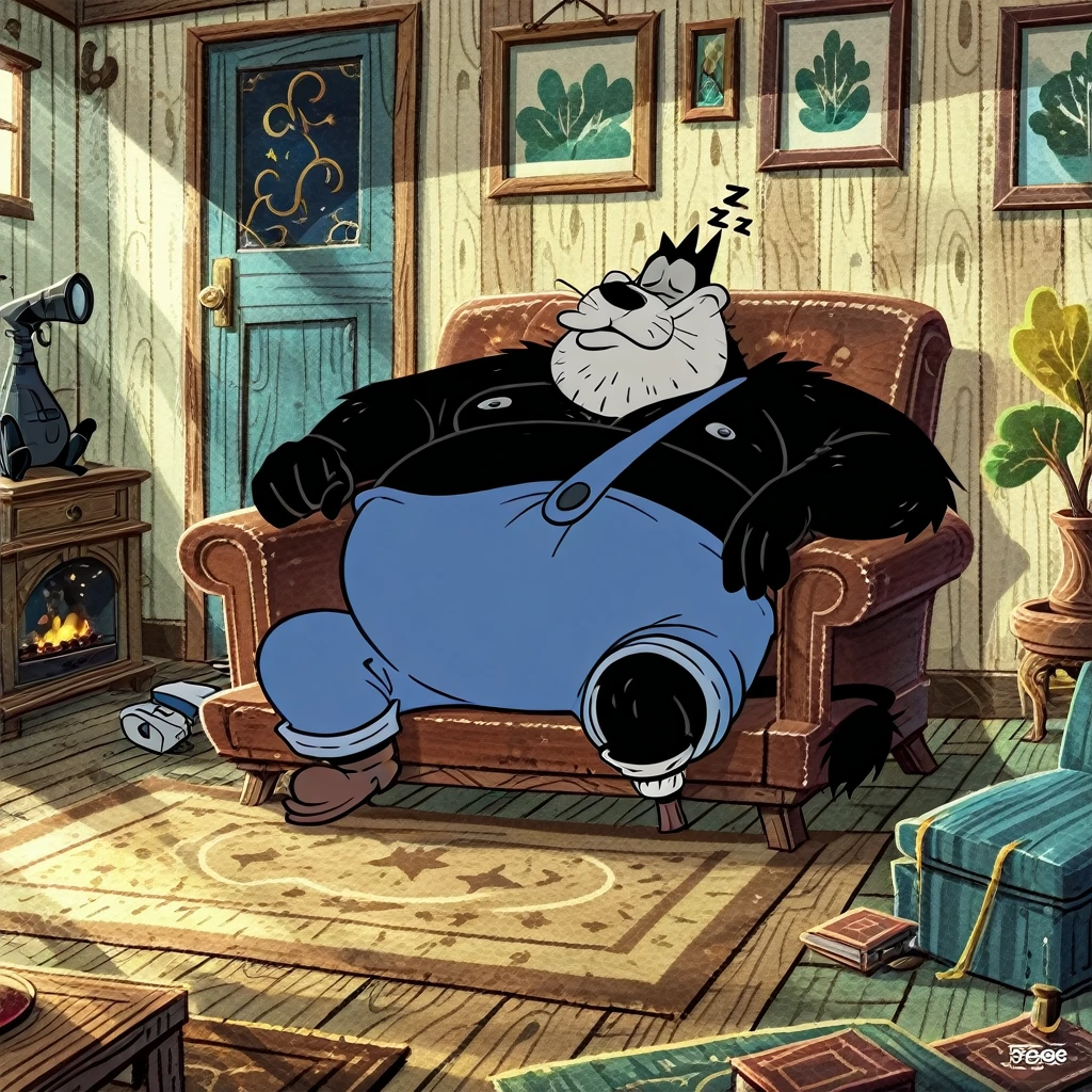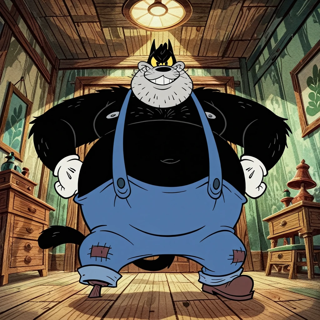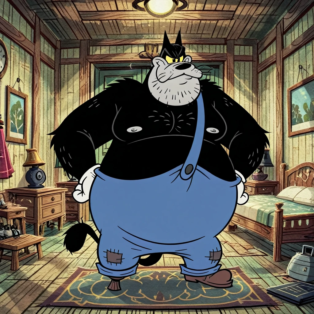 P3GL3G_P3T3, mature male, black eyes, yellow sclera, gray face, black nose, whiskers, tail, black fur, black body, pegleg, fat, shirtless, blue overalls,