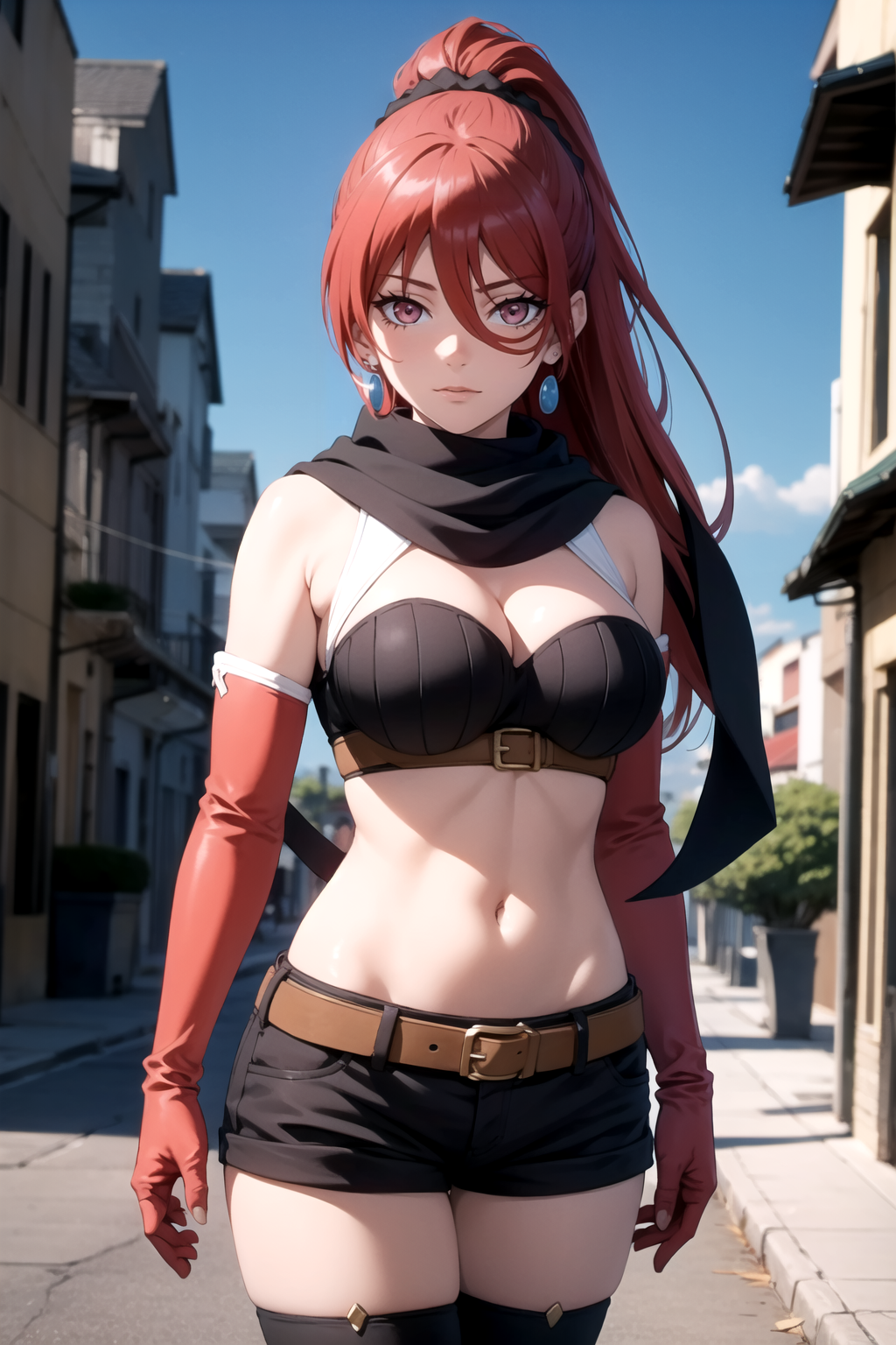Default/Original : cleavage, scarf, black scarf, midriff, navel, gloves, elbow gloves, belt, shorts, short shorts, black shorts, thighhighs, boots,