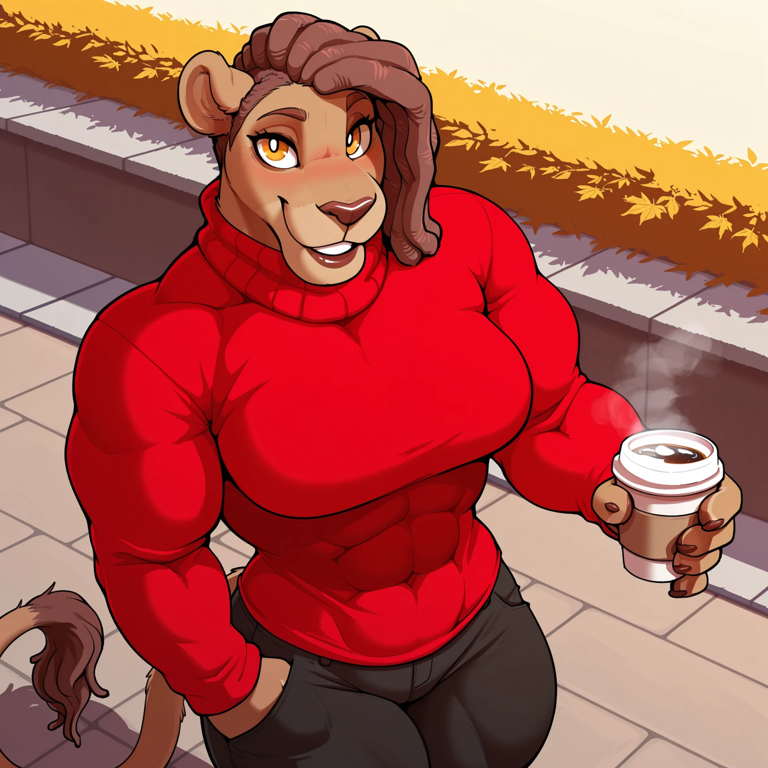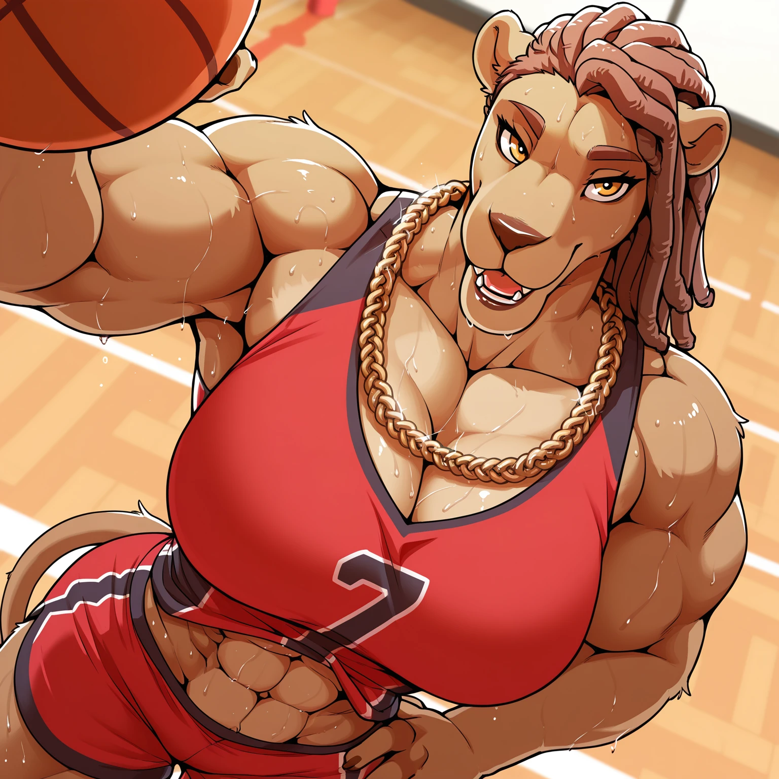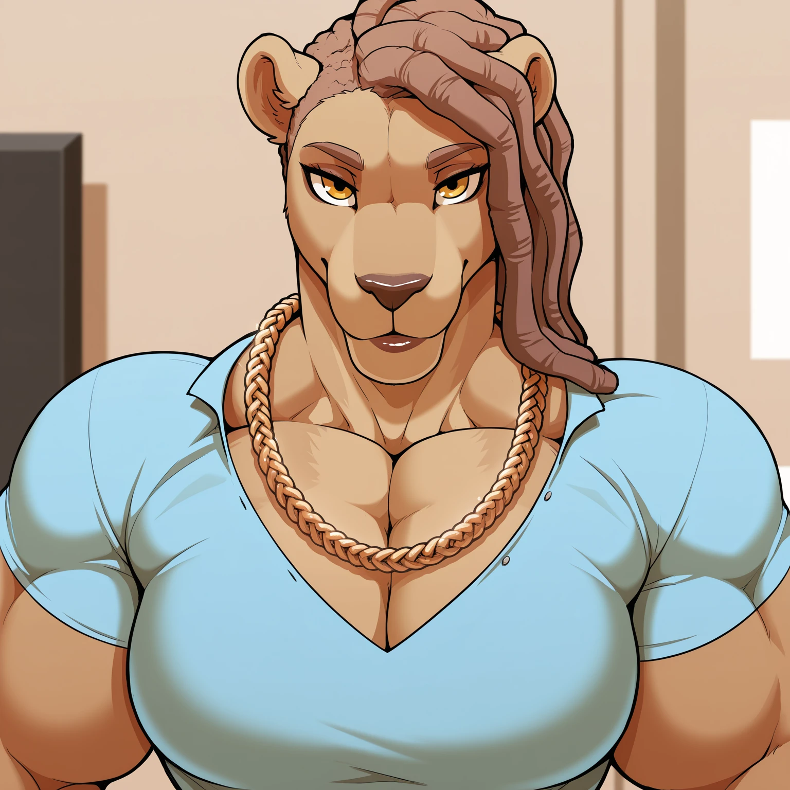 Positive Prompts: RochelleBT, furry female, anthro, felid, lion, pantherine, dreadlocks, medium hair, brown eyebrows, brown eyelids, yellow eyes, black pupils, dark-brown nose, brown bottom lip, brown body, brown tail, medium tail, dark-brown tail tuft, small breasts, muscular female, abs