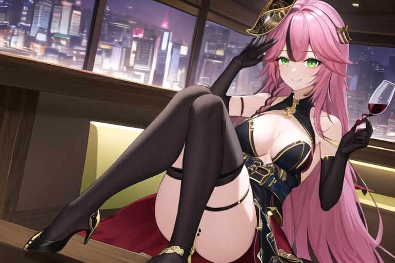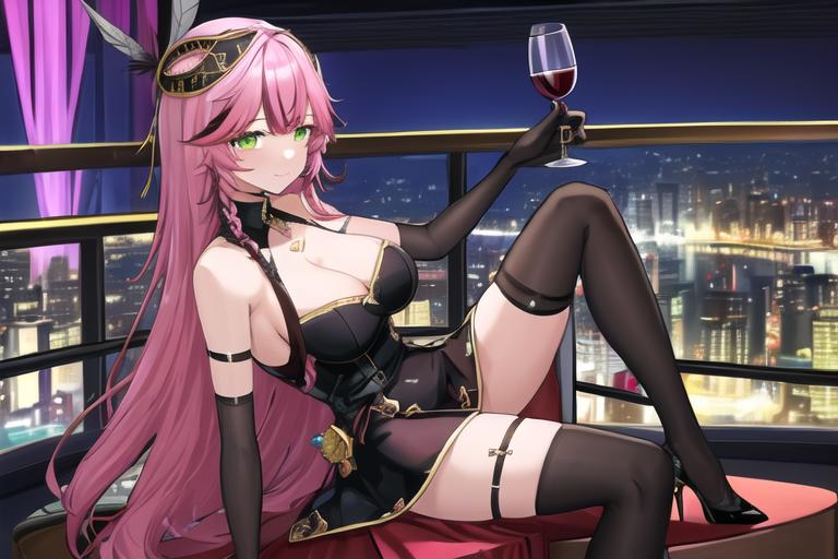 <lora:lan_2_(tower_of_fantasy):0.4> (best quality:1.1), (high resolution:1.1), lan_2_\(tower_of_fantasy\), long pink hair, multicolored_hair, braid, feather_hair_ornament, mask_on_head, green eyes, black_dress, black_gloves, asymmetrical_knee_socks, high_heelsDescription