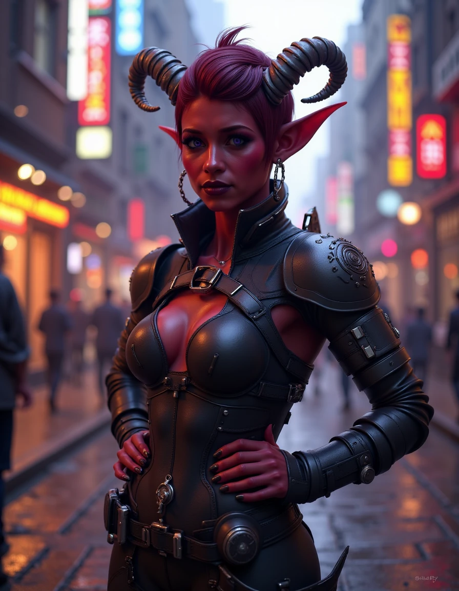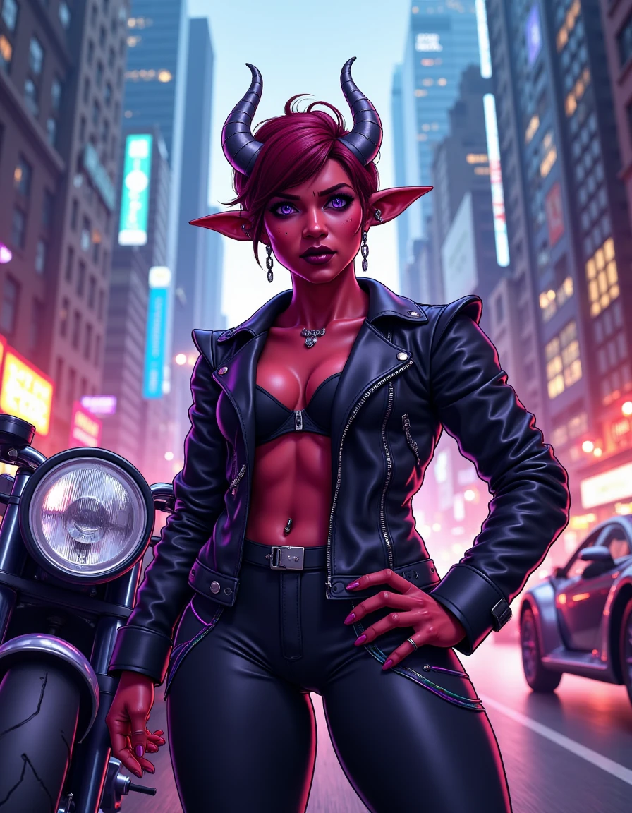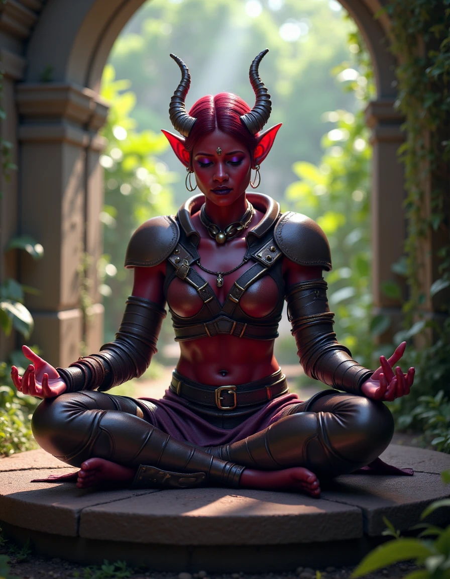 Xarathis, a beautiful orc woman with deep red skin, long pointy ears, athletic body type, and pixie cut dark red hair, a pair of light grey twisted horns emerge from her hair, and expressive glowing lavender purple eyes, she is wearing dark brown lipstick and dark purple shadow, she has a silver septum ring,