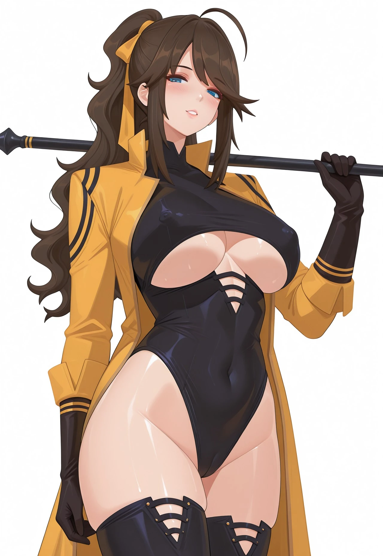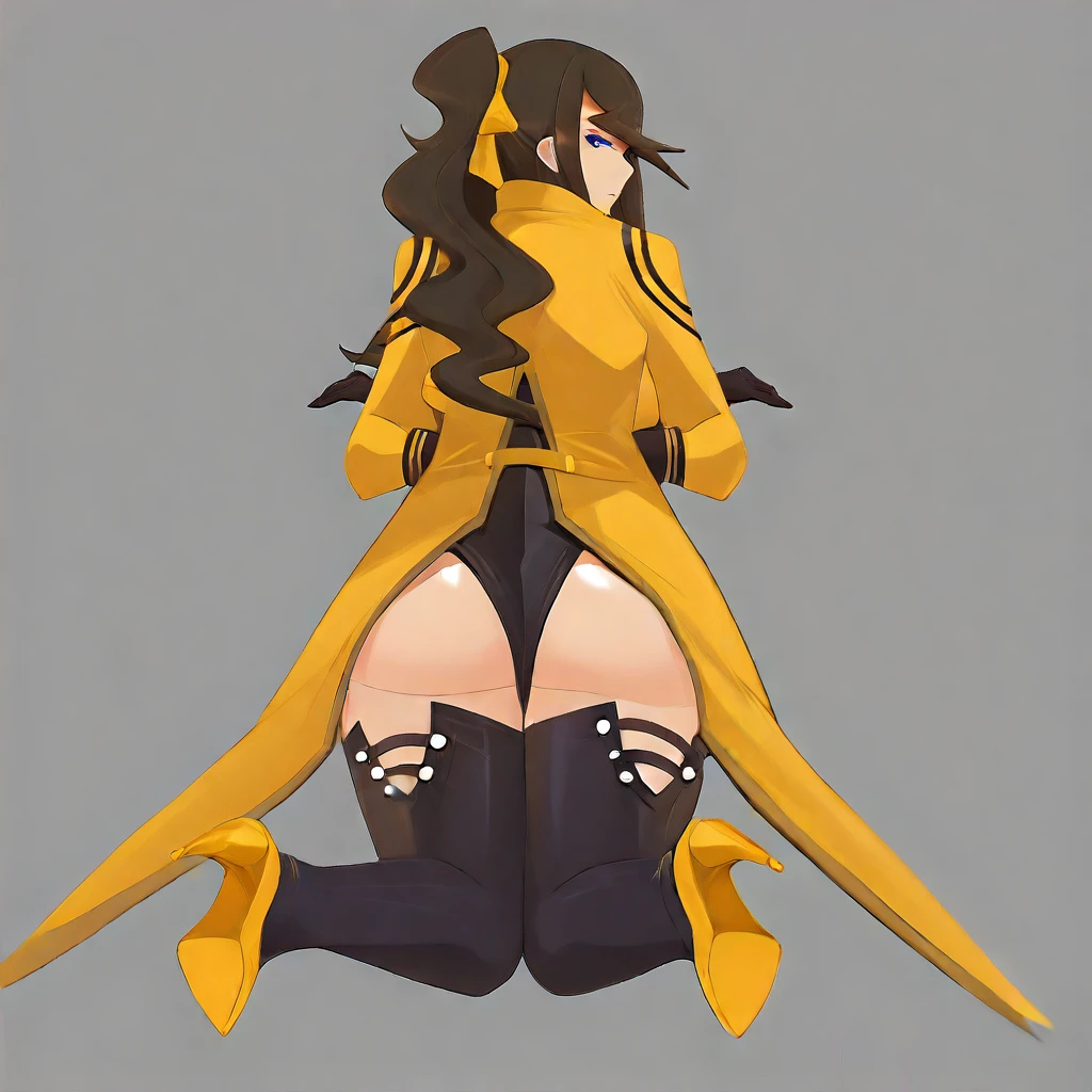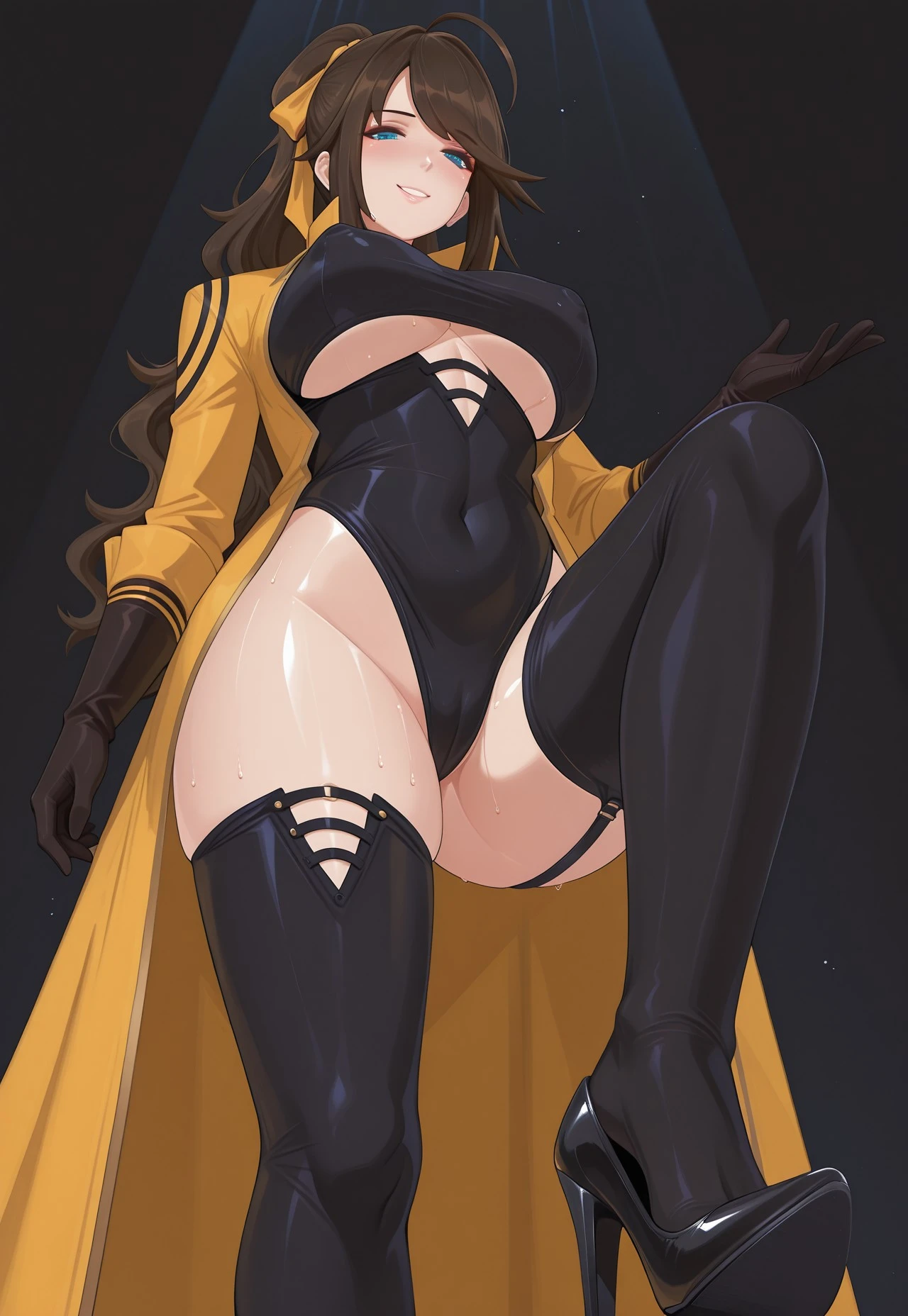 yellow_coat, long_coat, black_leotard, breast_cutout, strappy_leotard, highleg, black_gloves, thighhighs, garter_straps, high_heels, yellow_and_black_footwear