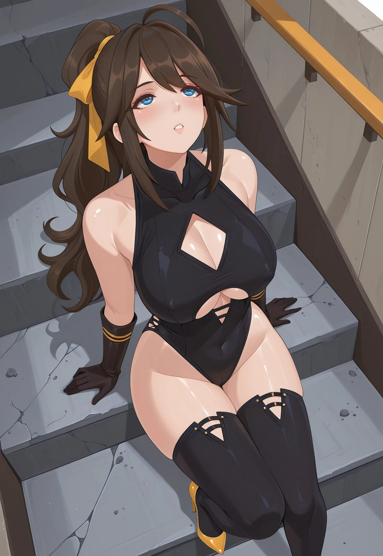 ves, 1girl, long_hair, brown_hair, blue_eyes, pale_skin, large_breasts, hair_bow, ahoge