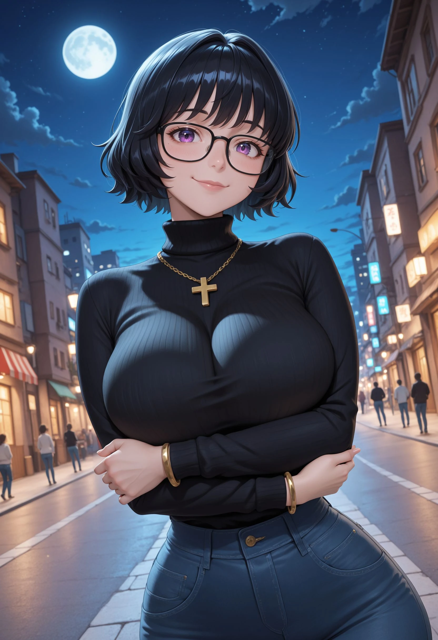 Main Prompt: 1girl, solo, mature female, voluptuous, short hair, black hair, bangs, black-framed eyewear, glasses, purple eyes, large breasts, narrow waist, wide hips,