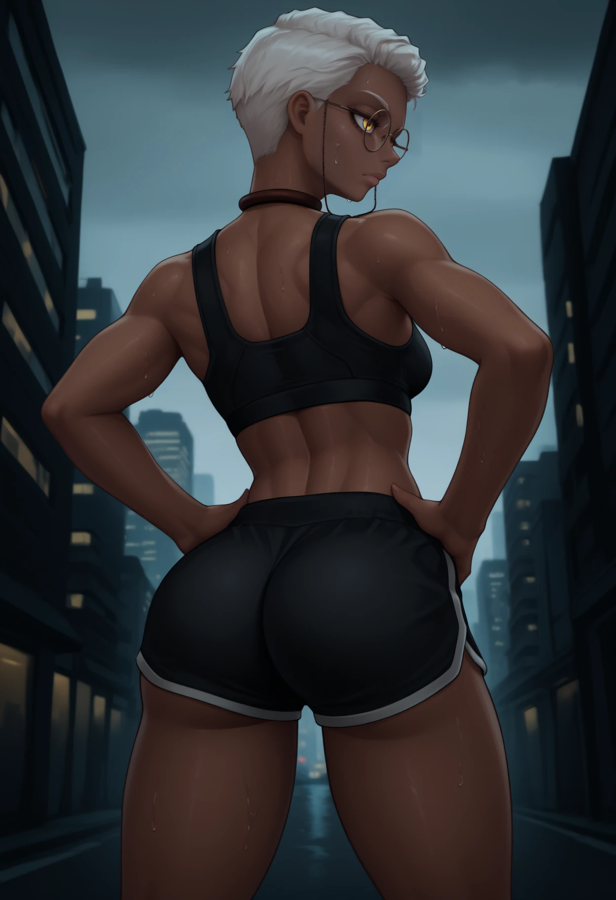 Appearance: dark-skinned female, short hair, blonde hair, yellow eyes, large breasts