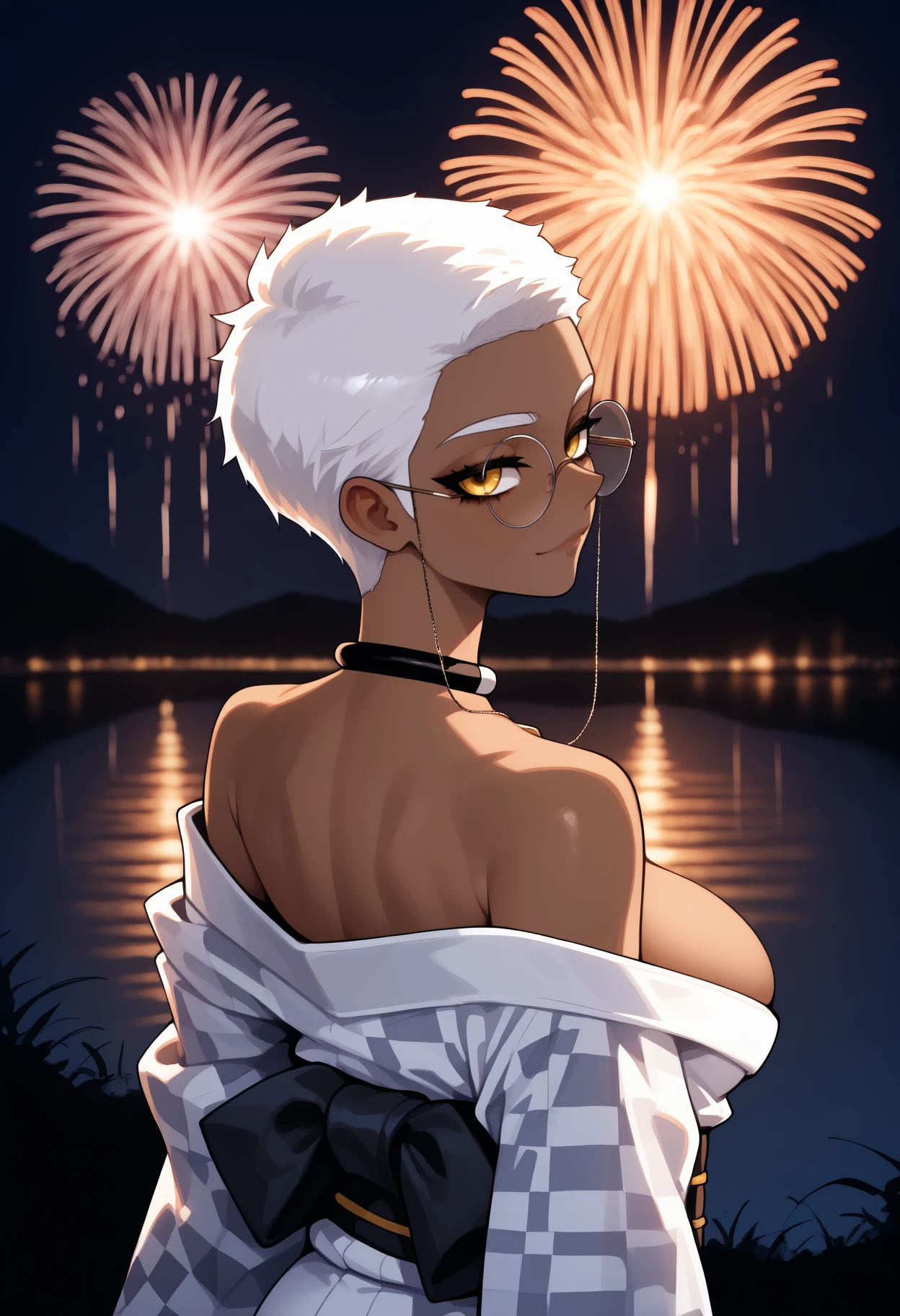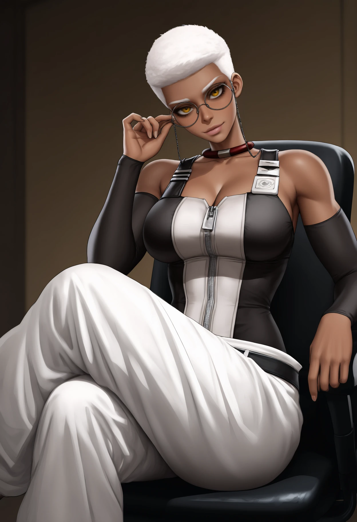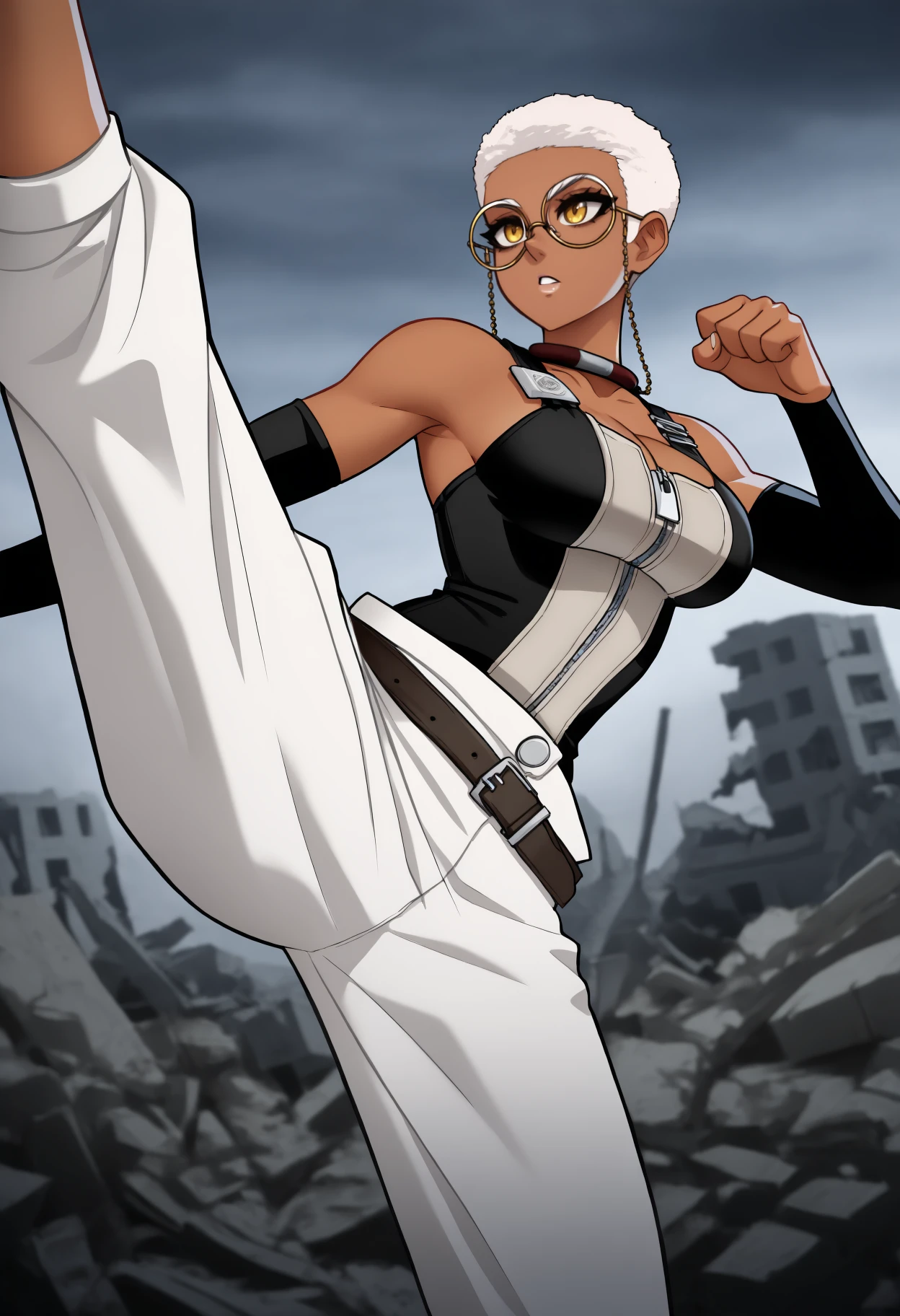 Default Outfit: glasses, round eyewear, eyewear strap, choker, two-tone shirt, black tank top, white tank top, zipper, detached sleeves, white pants, baggy pants, black belt, bare shoulders, cleavage
