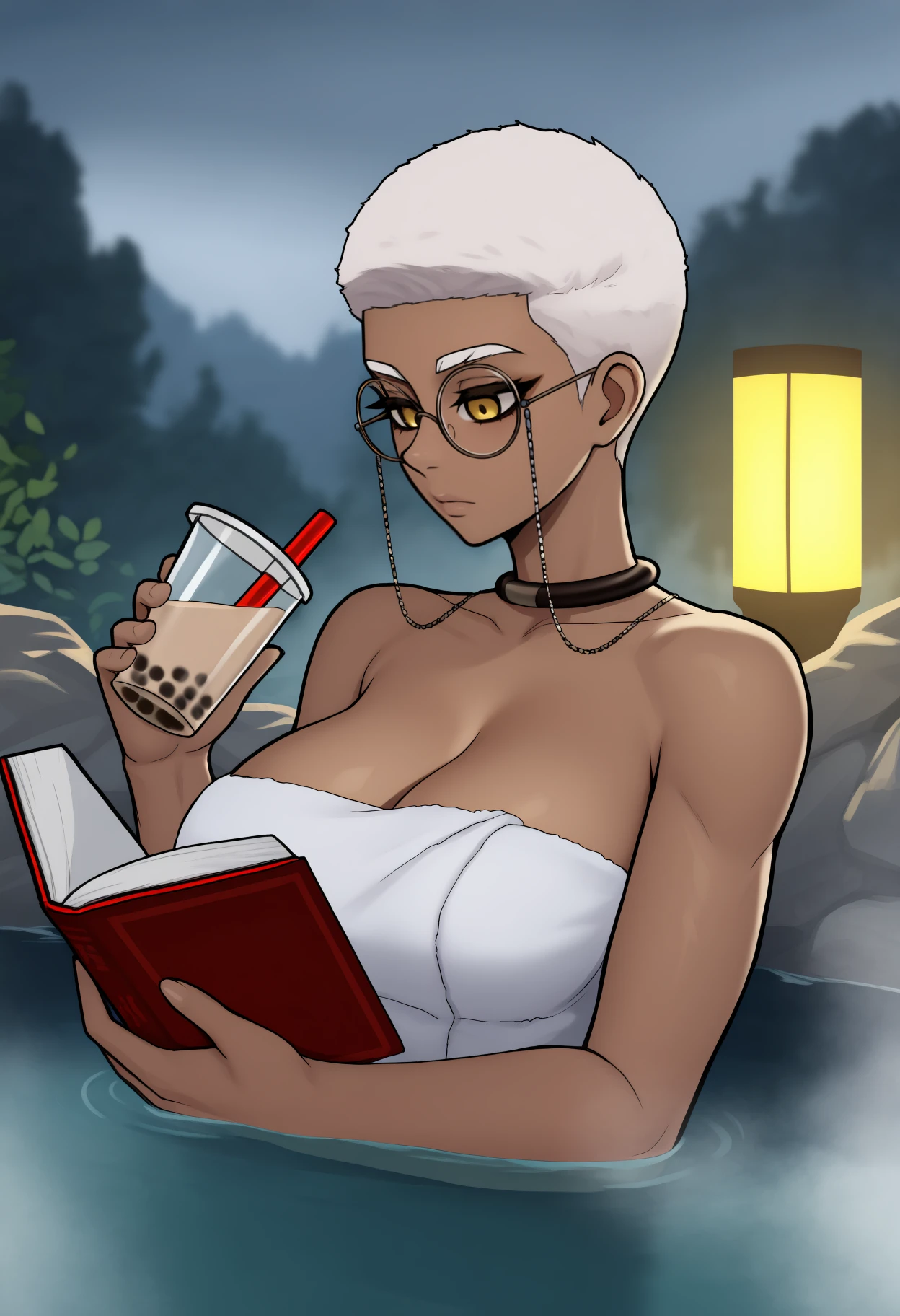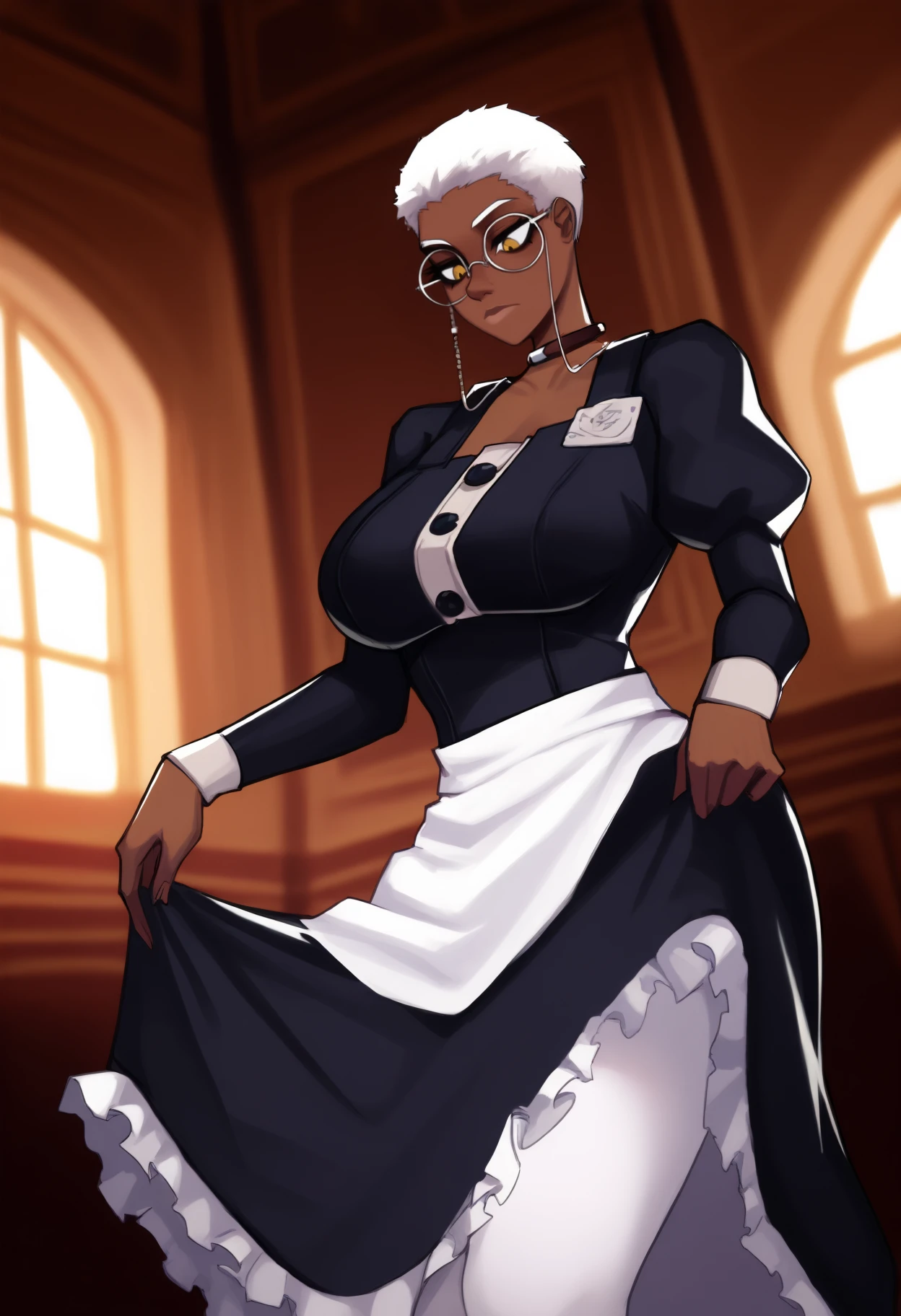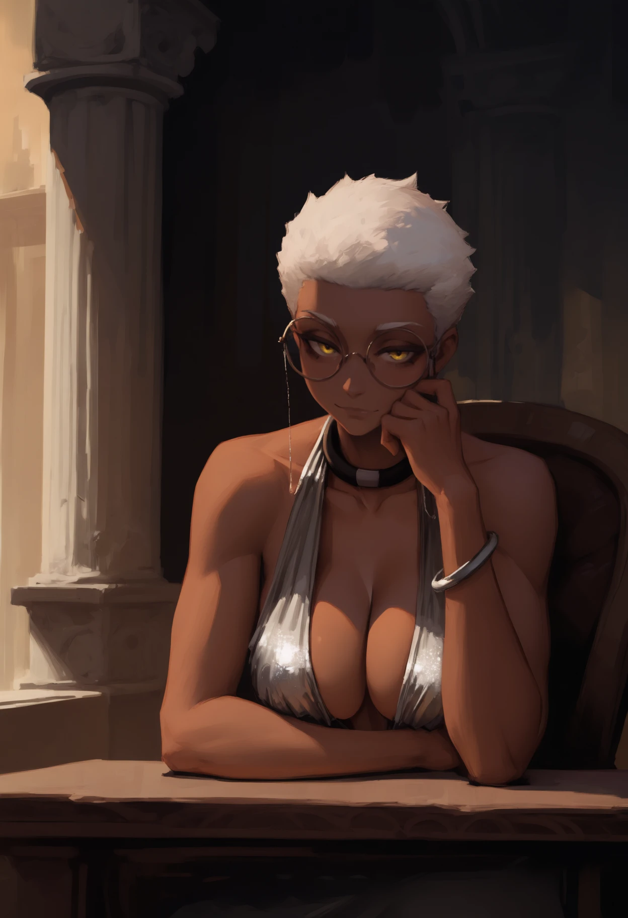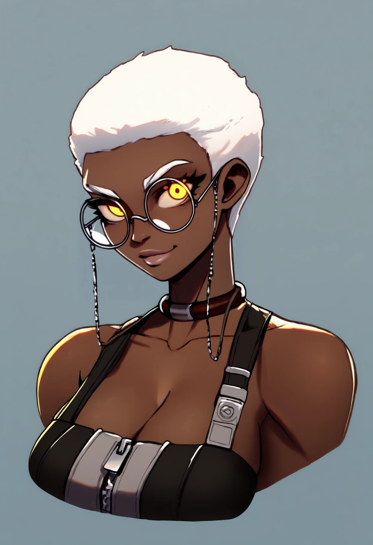 dark-skinned female, short hair, blonde hair, yellow eyes, large breasts