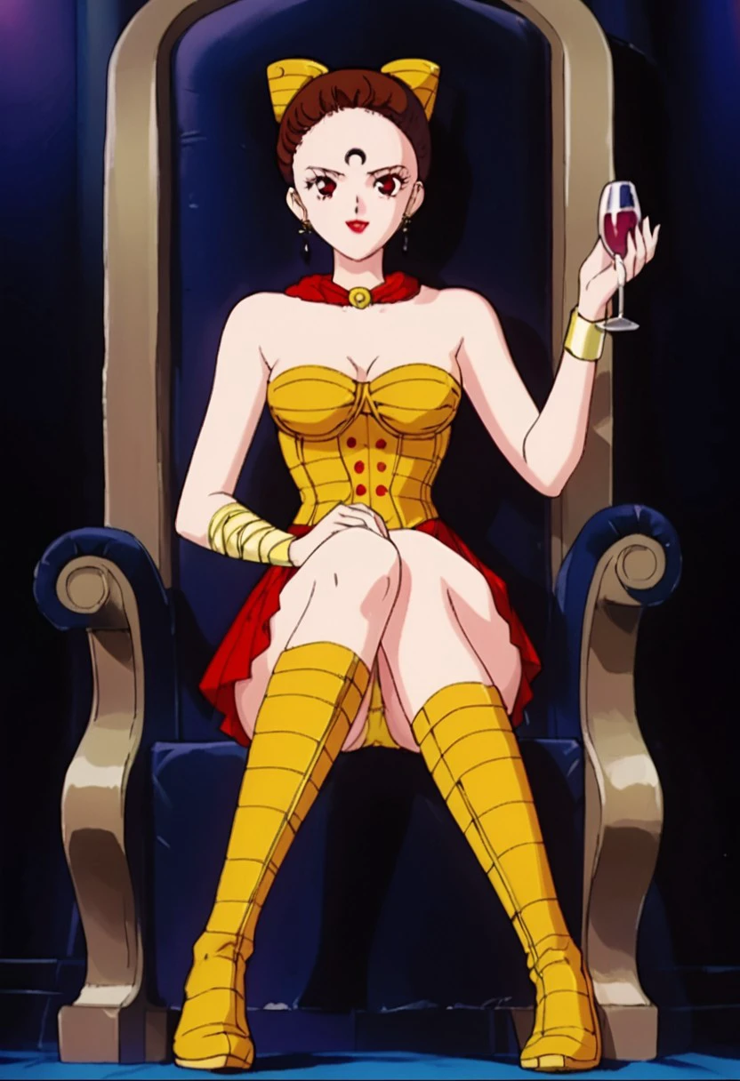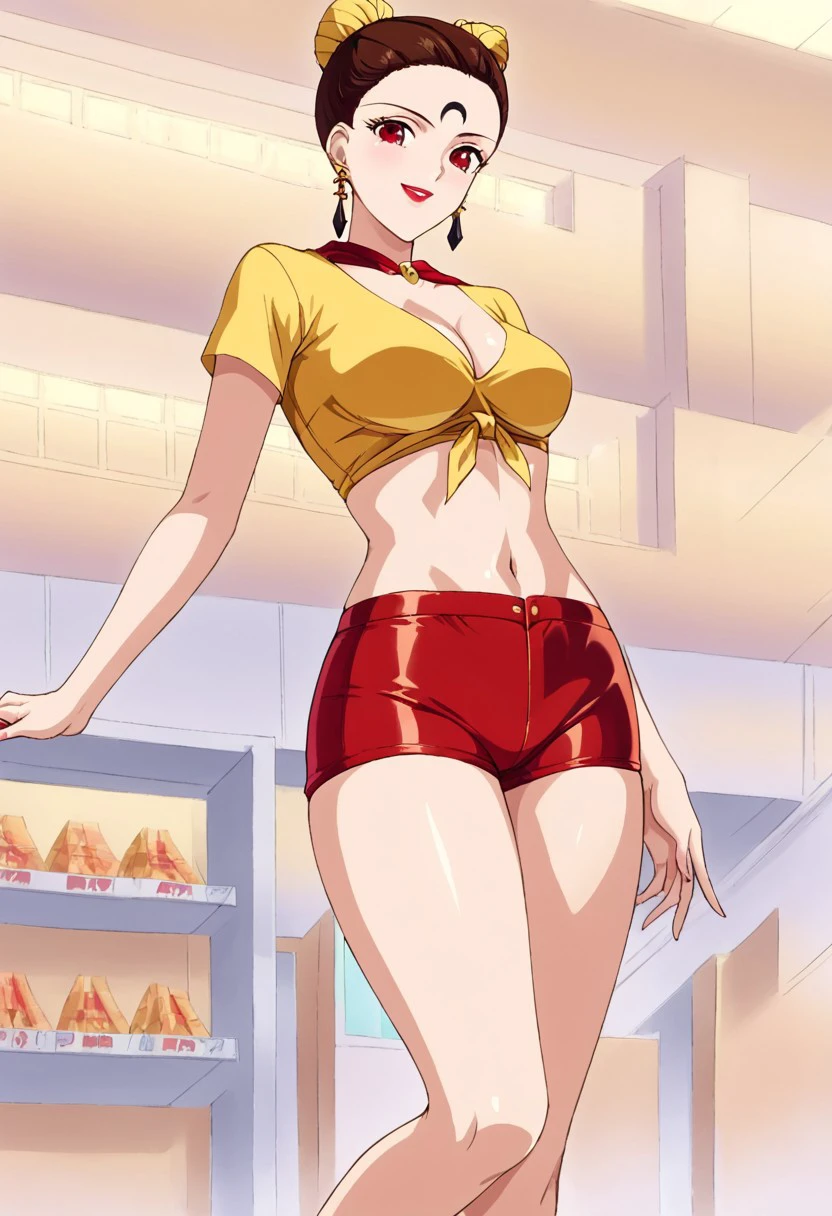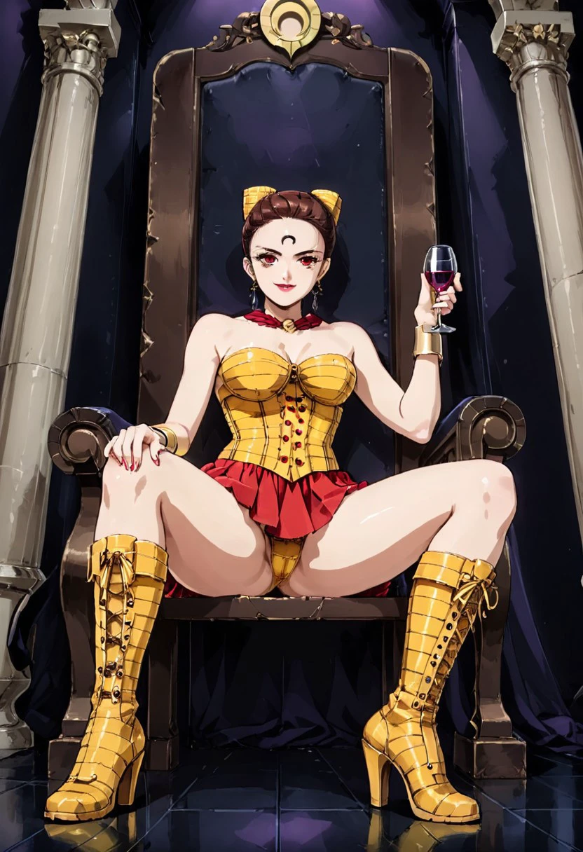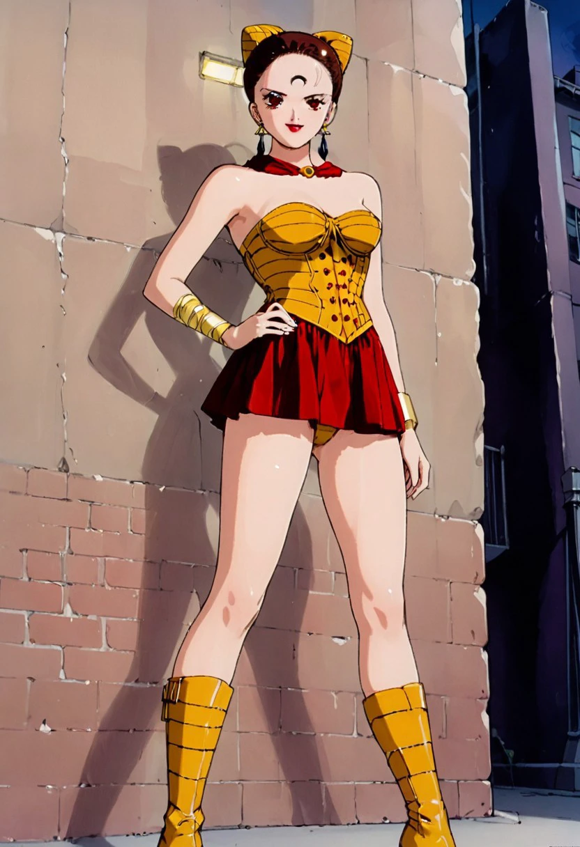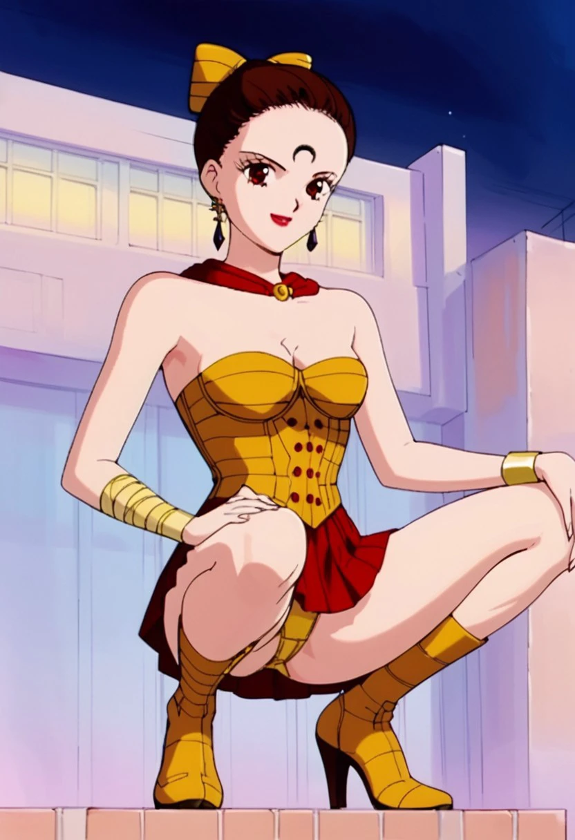 1 girl, feminine, cute face, makeup, red lipstick, smile, skirt, red eyes, detailed pupils, mark on forehead, facial mark, inverted crescent moon, black moon, brown hair, short hair, bun, bun, bun in hair, yellow bun, breasts, breasts, medium size, choker, jewelry, earrings, black crystal earrings