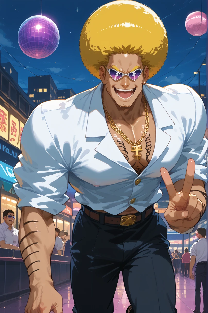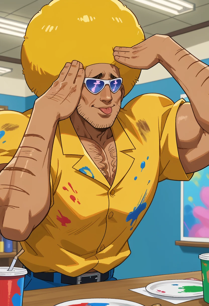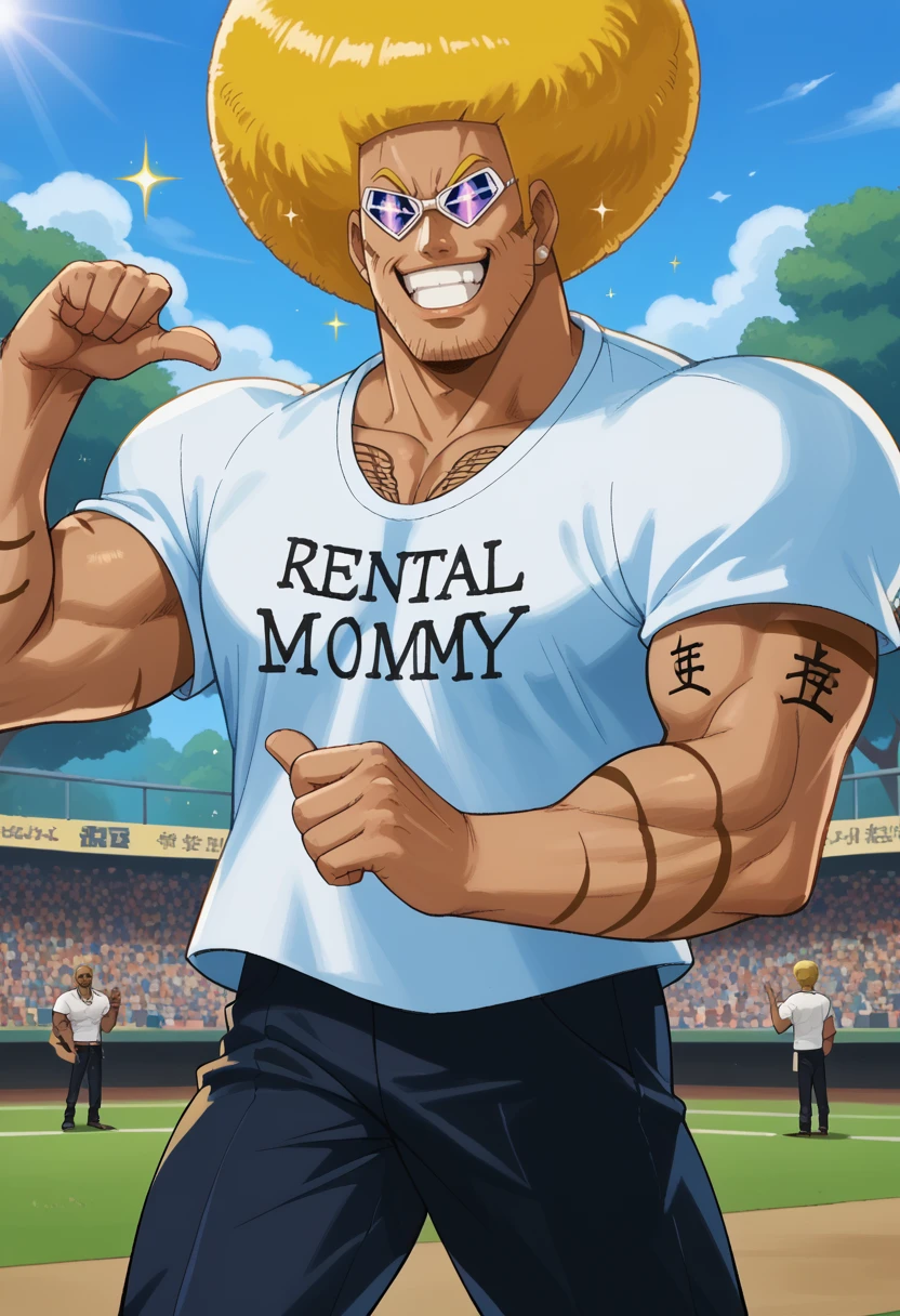 bobobo-bo bo-bobo, afro, blonde hair, muscular, blue shirt, sunglasses, chest hair, arm hair, dark-skinned male, manly