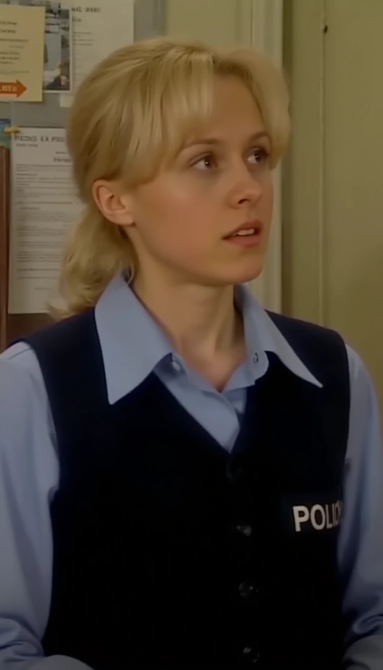 "The image is a photograph of a young woman with a fair skin tone and short, indicated by the beige walls and the cluttered bulletin board behind her. Revealing her legs. Her blonde hair is styled in a short, sitting on the edge of a wooden desk in what appears to be an office. This is a photograph showing a scene from what appears to be an interrogation room or a similar setting with institutional walls and a utilitarian atmosphere. The subject is a young woman with fair skin and blonde hair styled in a neat. She is wearing black short sleeveless dress with a white patch on the front that reads "POLICJA" in bold, pantyhose and black high-heeled shoes."