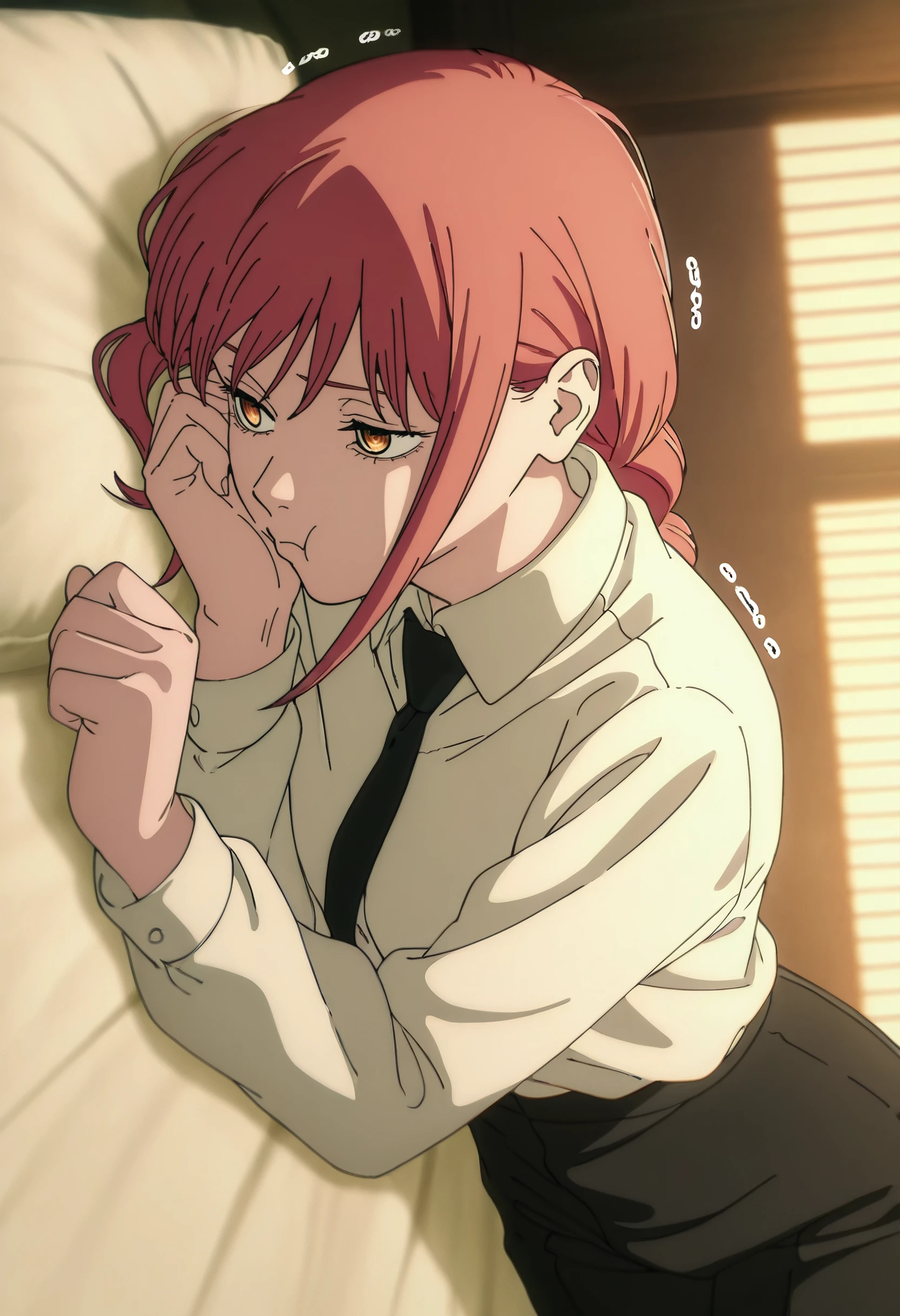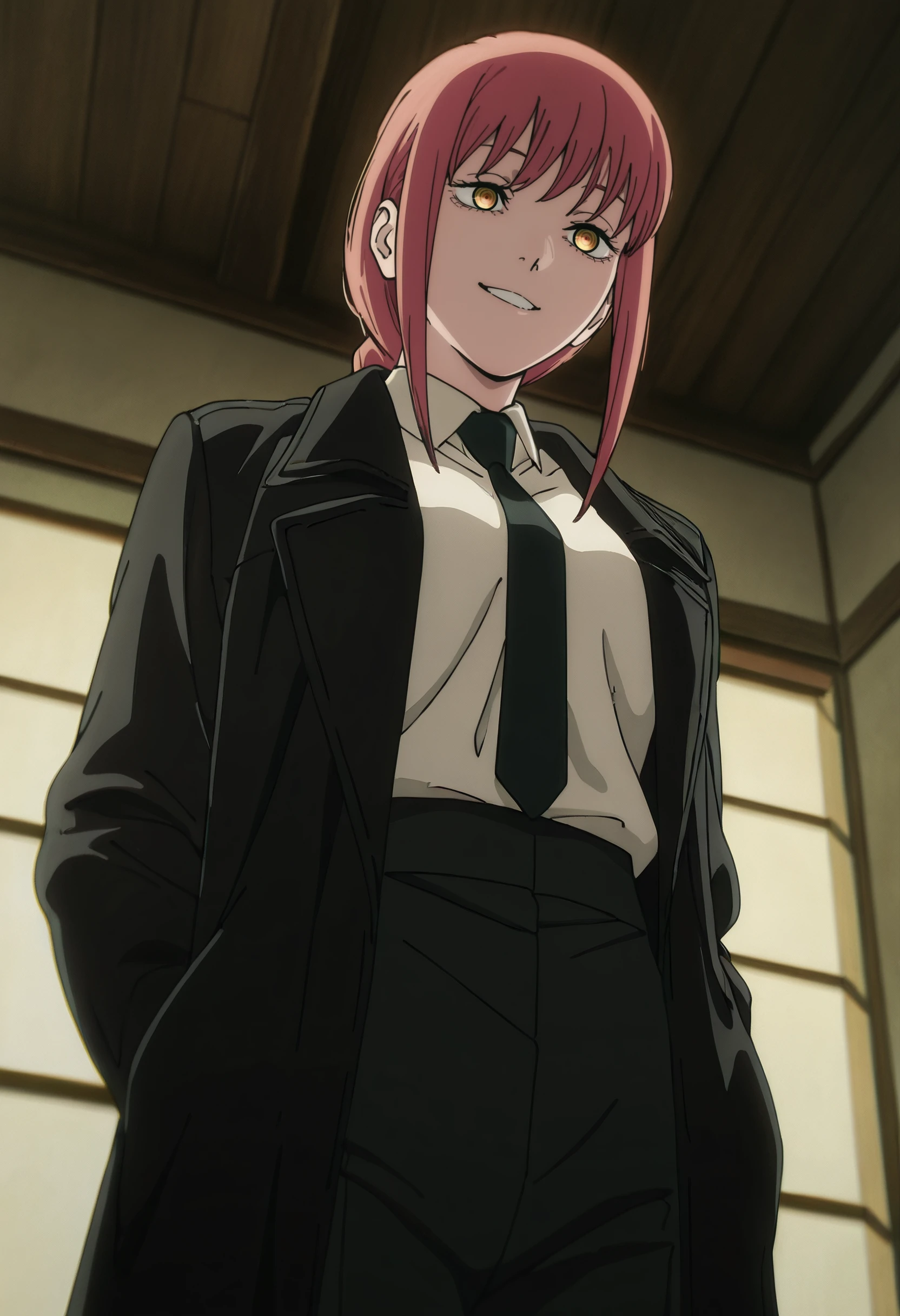MakimaShirt, white shirt, collared shirt, black necktie, long sleeves, black pants, shirt tucked in, high-waist pants, dress shirt,