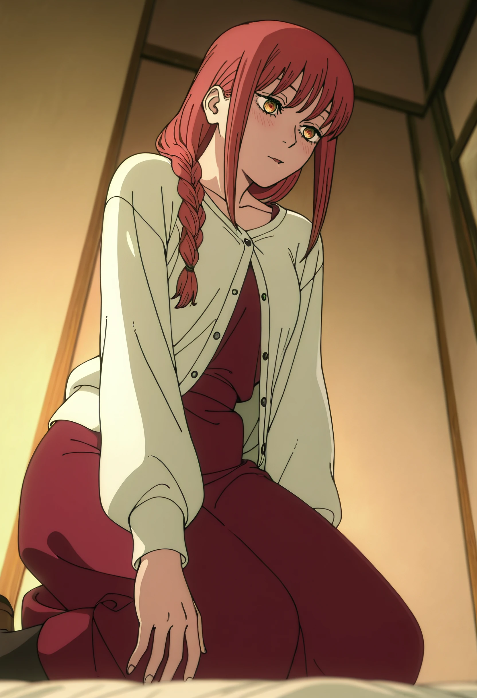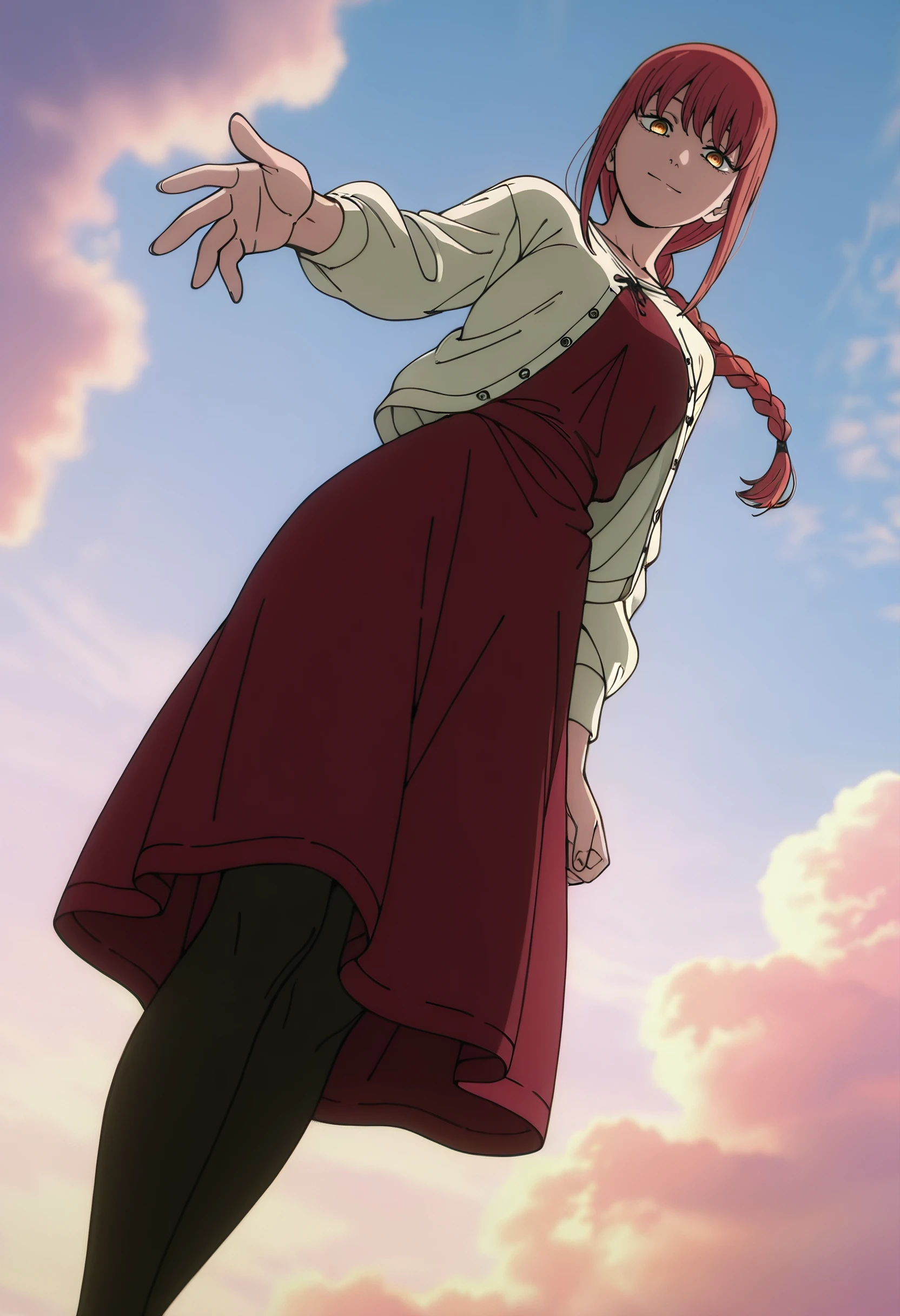 MakimaOutfit, white cardigan, long sleeves, red dress, casual, straight hair, black pantyhose,