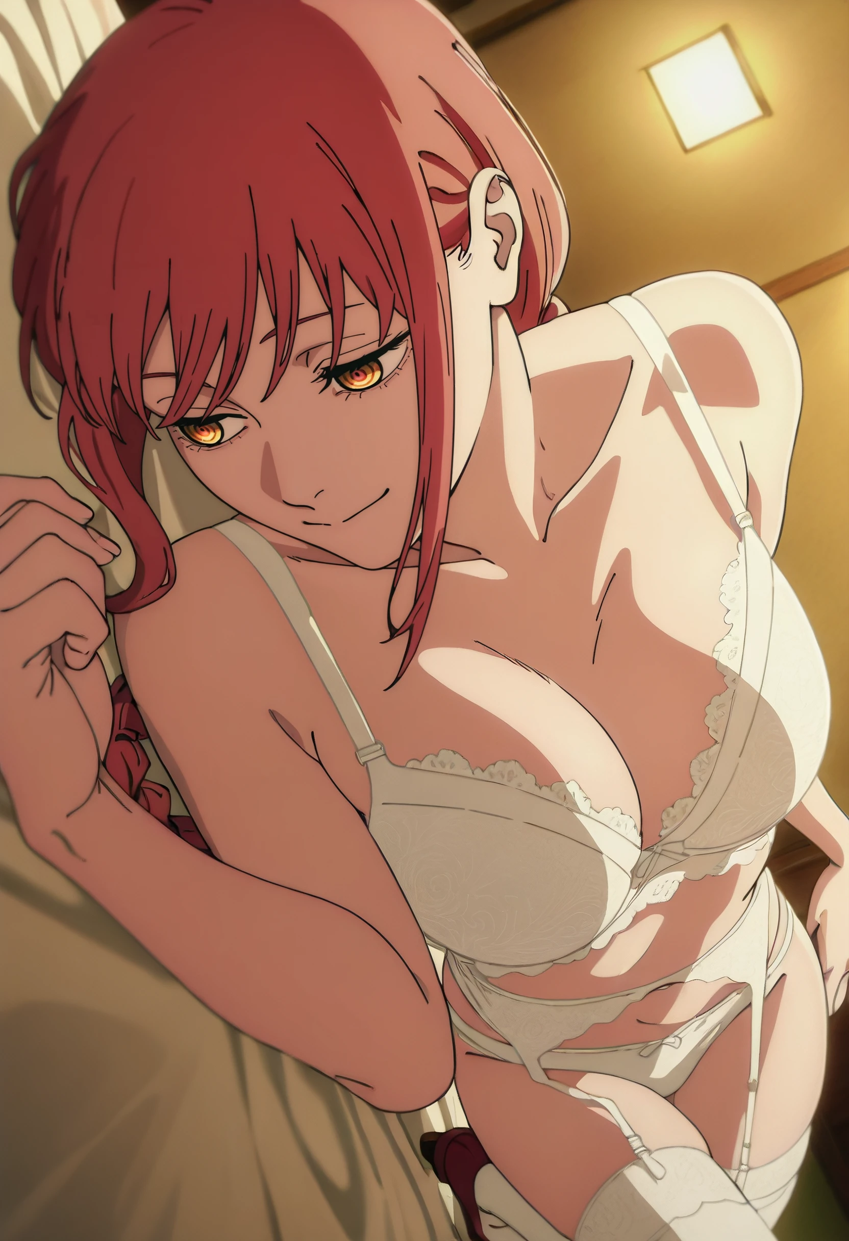 MakimaLingerie, white bra, lingerie, white thighhighs, white panties, lace, lace-trimmed bra, lace trim, garter belt, lace-trimmed legwear, high heels, bridal lingerie, white garter belt, shoes, red footwear,