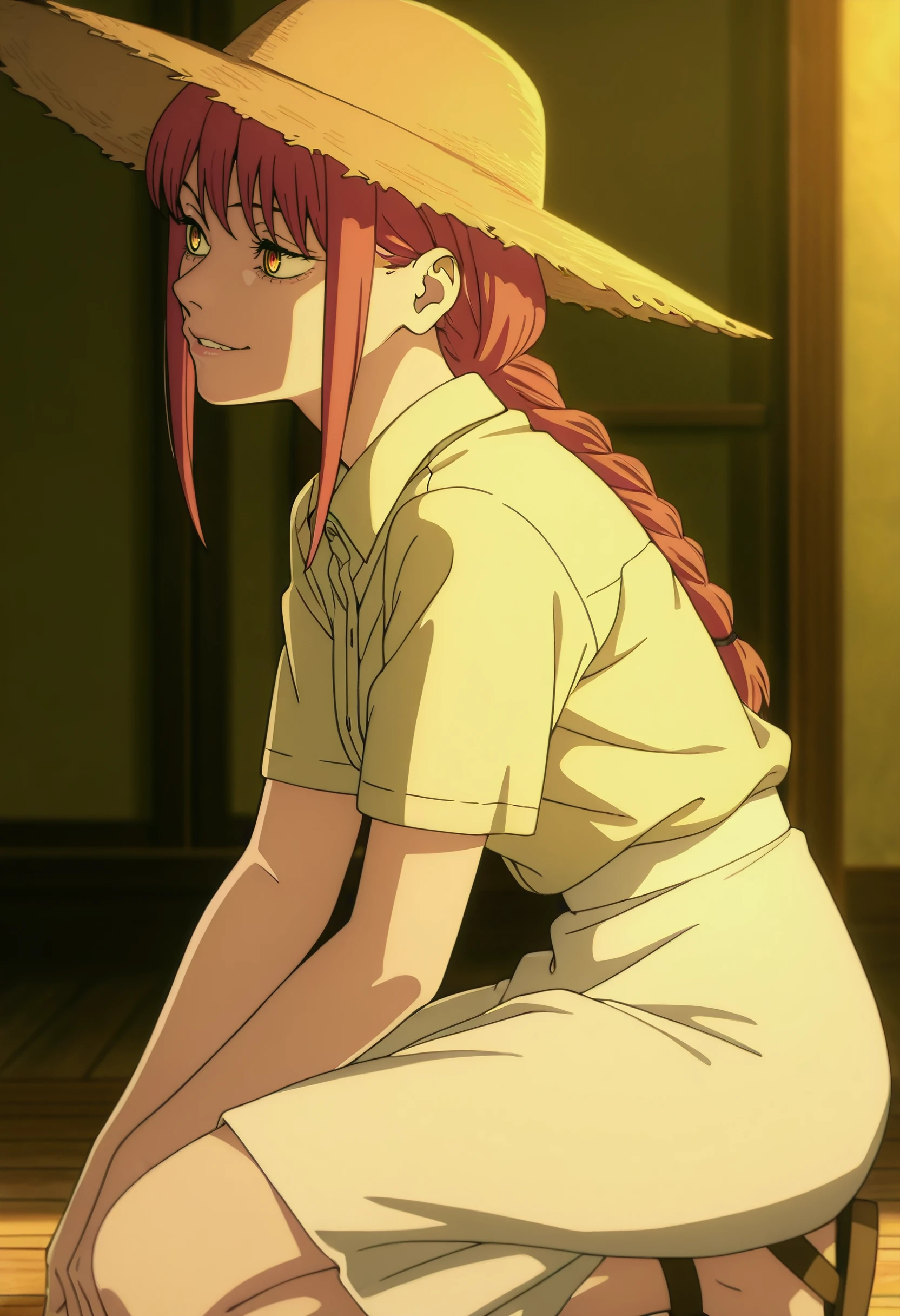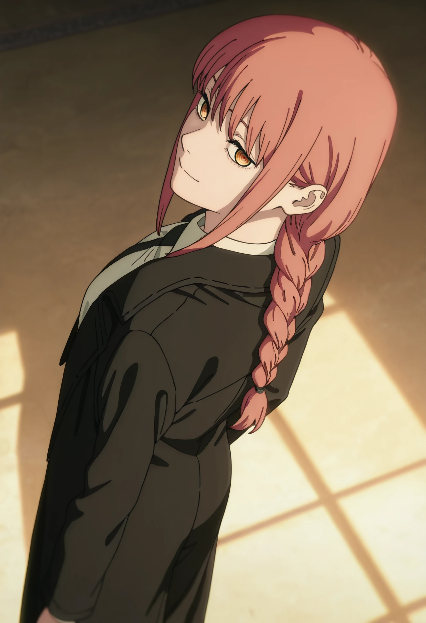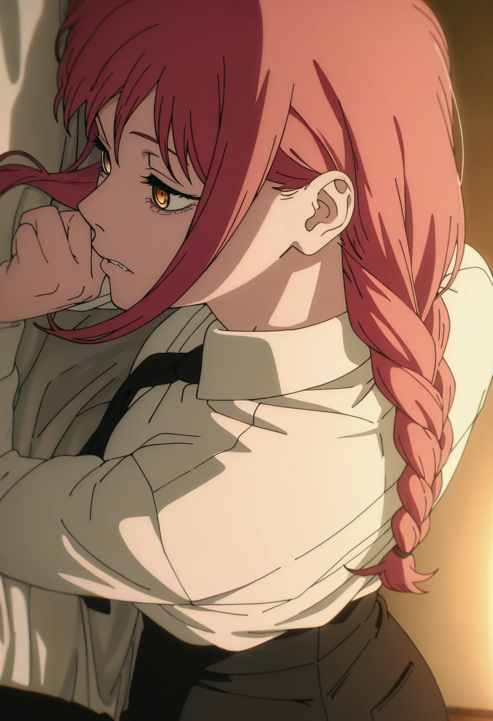 CMaMakima, long hair, red hair, ringed eyes, yellow eyes, braided ponytail, braid, sidelocks, single braid, ponytail,