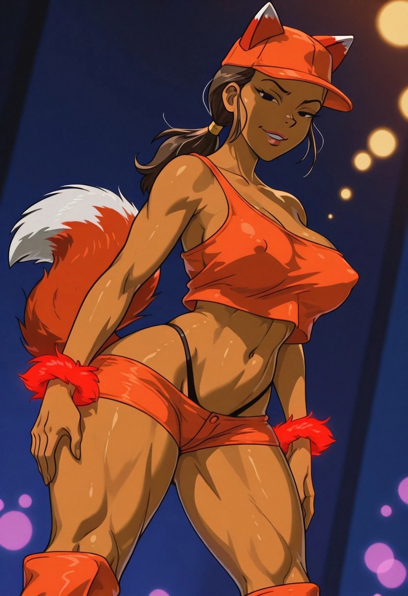 FoxxyLoveDT, 1girl, solo, dark skin, dark-skinned female, brown hair, long hair, low ponytail, black eyes, full lips, orange hat with fox ears, large breast, short orange one-shoulder crop top, cleavage, navel, midriff, groin, black thong, orange short shorts, thick thighs, high heel, knee-length orange boots, fluffy fox tail, orange fur bracelets, hourglass figure body, yellow hair tie, covered nipples,