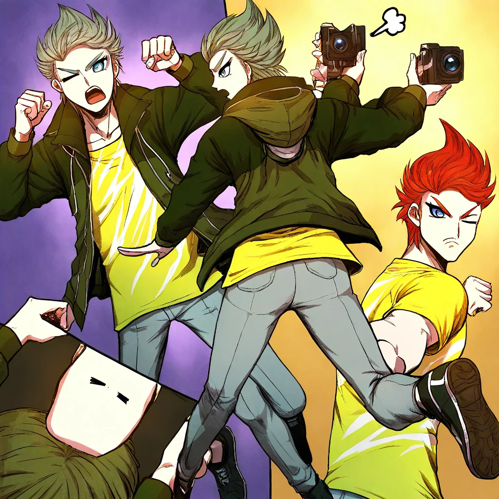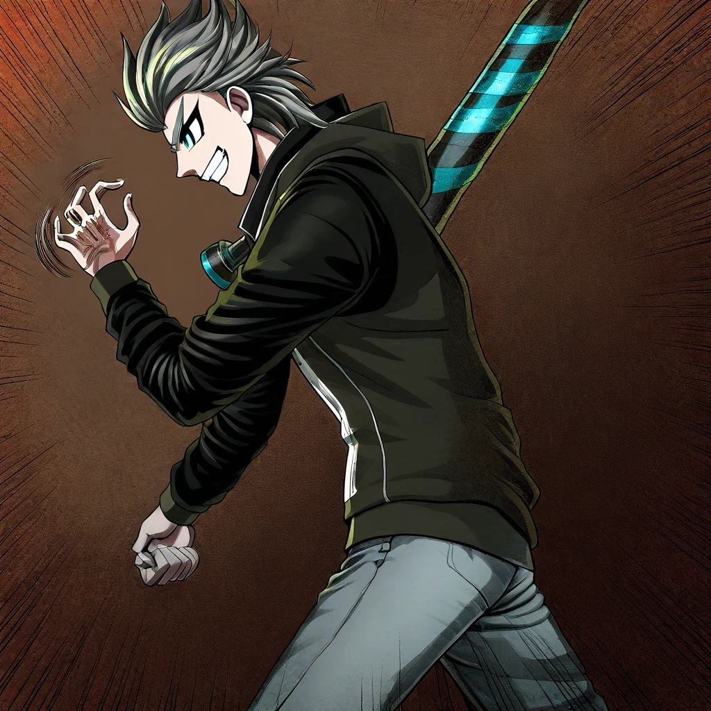 Trigger words for clothes are Dark green jacket, Yellow shirt, Necklace, grey jeans, black shoes and grey and blue baseball bat