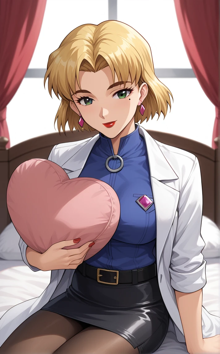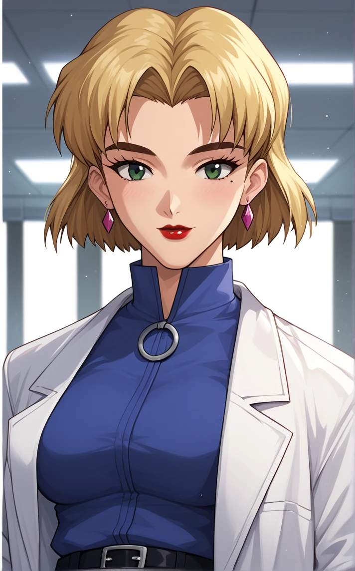 MainOutfit_RitsukoAkagi_ownwaifu, 1girl, blonde hair, breasts, green eyes, mole under eye, short hair, jewelry, lab coat, labcoat, earrings, lipstick, makeup, red lips, long sleeves, jacket, white coat, turtleneck, blue shirt, parted bangs, pencil skirt, belt, sleeves rolled up, black skirt, pantyhose, black belt, open clothes, black pantyhose, miniskirt, white jacket, bangs, open coat, stud earrings, medium breasts, nail polish, large breasts, necklace, belt buckle, collared shirt, gem, hair behind ear, thick eyebrows, eyelashes, mature female,