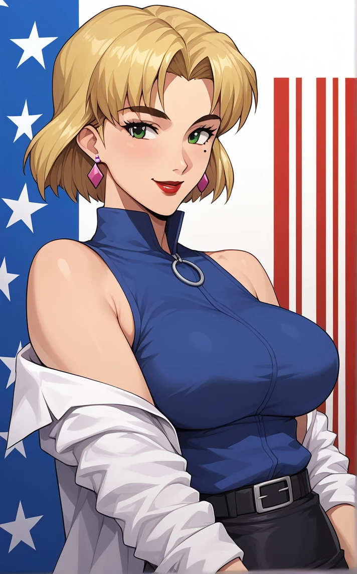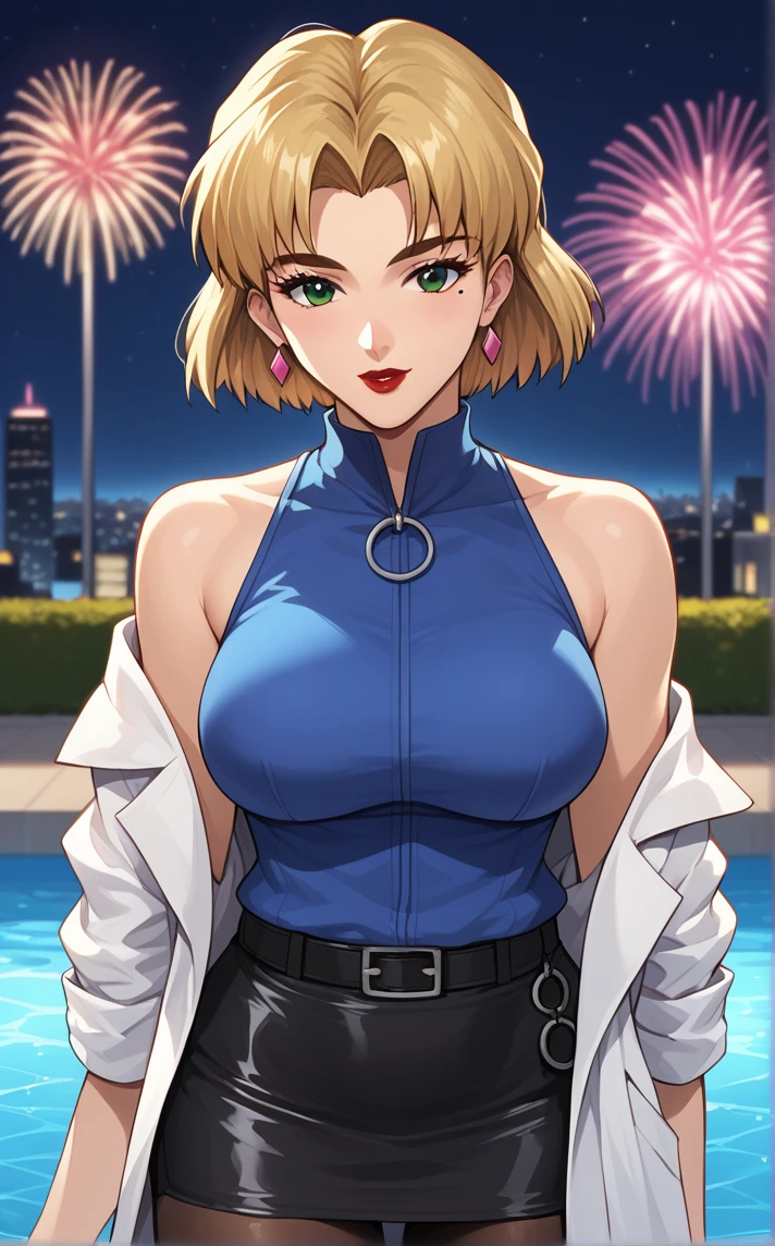 BlueVest_RitsukoAkagi_ownwaifu, 1girl, blonde hair, breasts, green eyes, mole under eye, short hair, lipstick, makeup, earrings, jewelry, red lips, bare shoulders, sleeveless, blue shirt, parted bangs, pencil skirt, sleeveless shirt, medium breasts, zipper, large breasts, black skirt, lab coat, labcoat, pantyhose, belt, miniskirt, off shoulder, turtleneck, mature female, black pantyhose, hair intakes, open coat, white coat, collared shirt, eyebrows visible through hair, eyelashes, thick eyebrows,