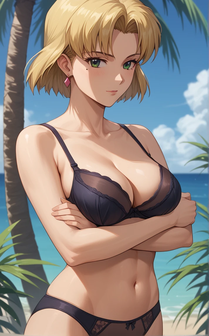 Bra_RitsukoAkagi_ownwaifu, 1girl, black bra, blonde hair, breasts, cleavage, collarbone, earrings, green eyes, jewelry, lingerie, medium breasts, mole under eye, short hair, underwear only, bare shoulders, underwear,