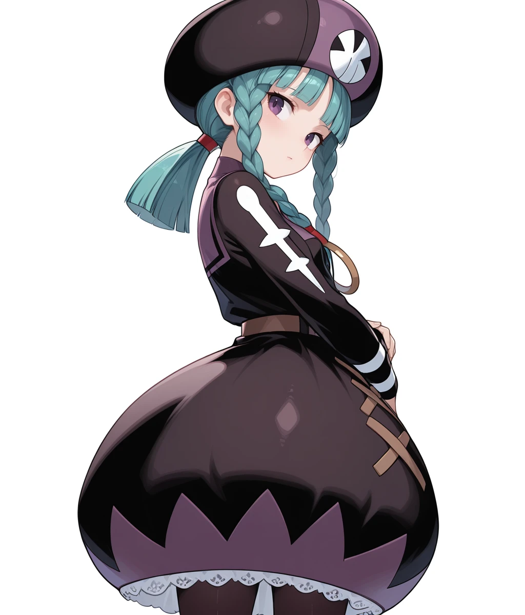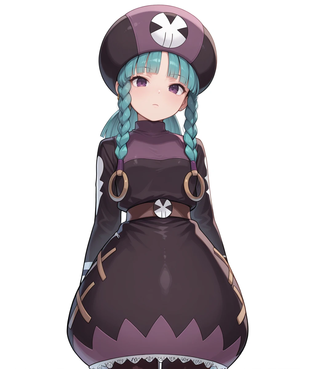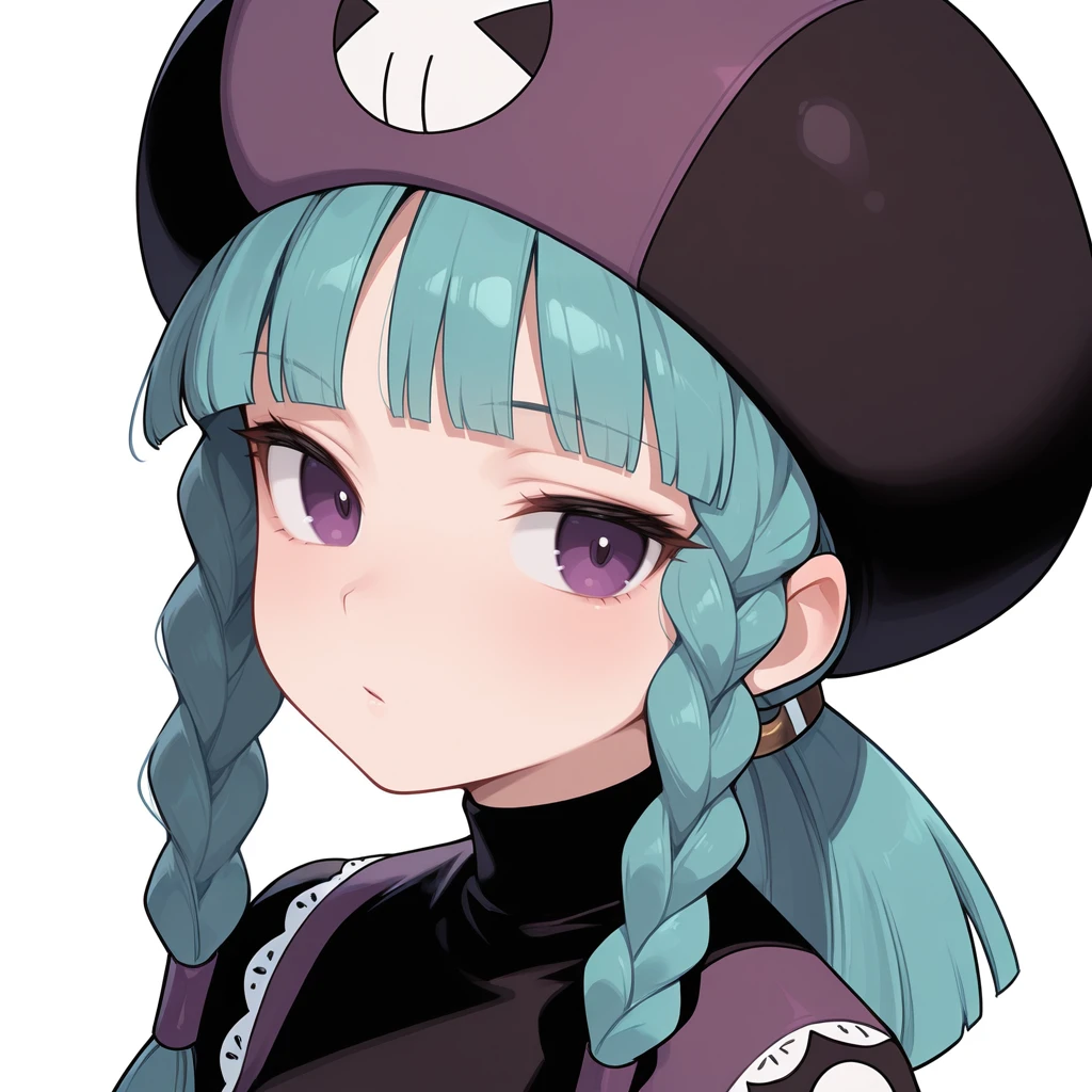 purple eyes, round hat, symbol on hat, aqua hair, hoop hair ornament, twin braids, blunt bangs