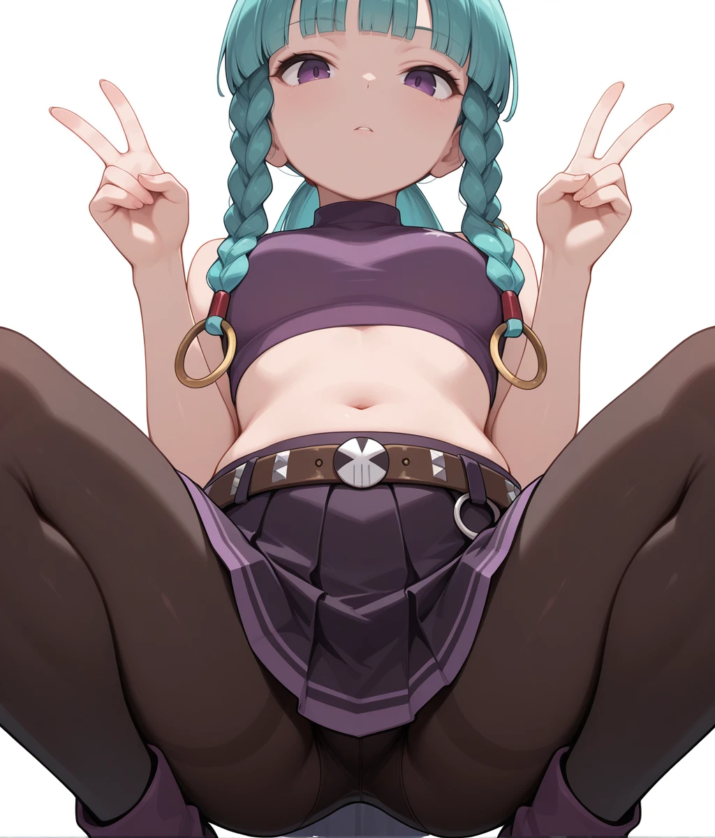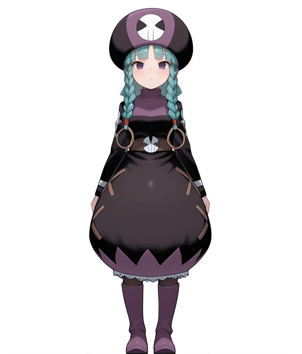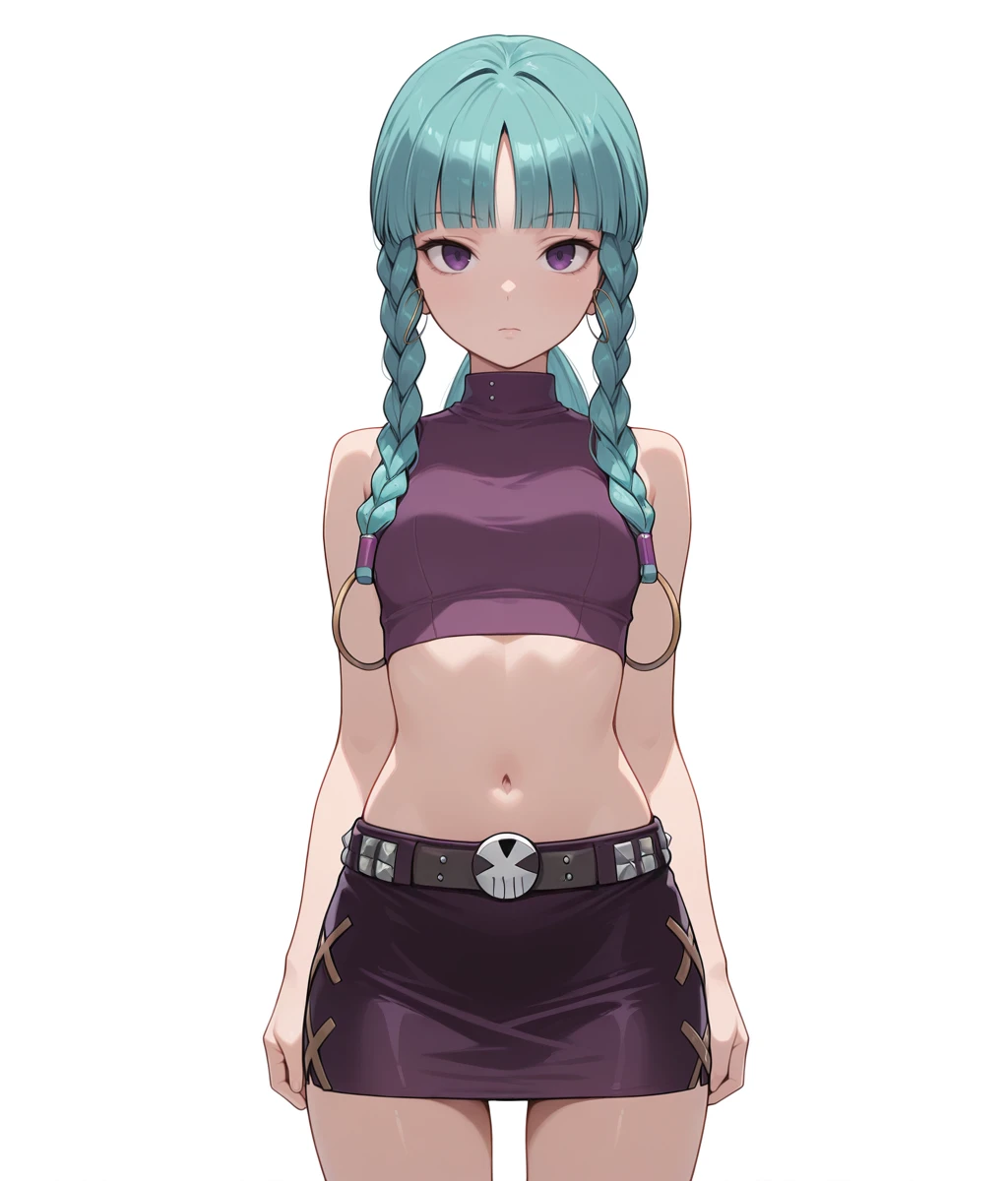 purple eyes, round hat, symbol on hat, aqua hair, hoop hair ornament, twin braids, blunt bangs