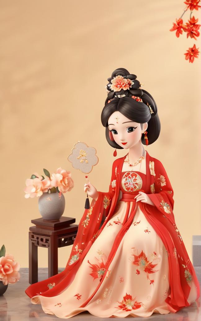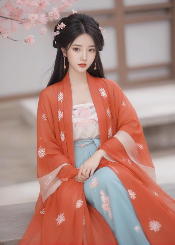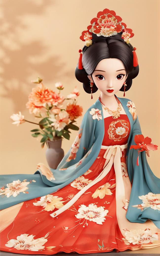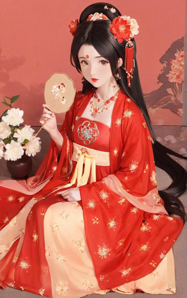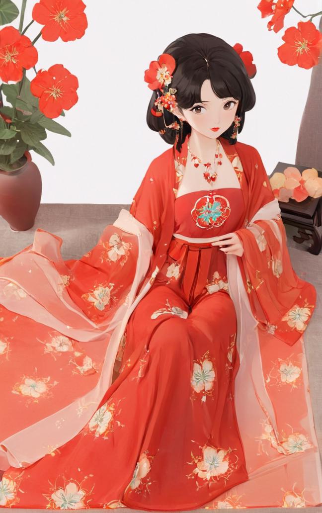 1girl, black hair, daxiushan, chinese clothes, daxiushan style, flower, front view, jewelry, solo, hair ornament, sitting, hanfu, holding, necklace, red lips, sit