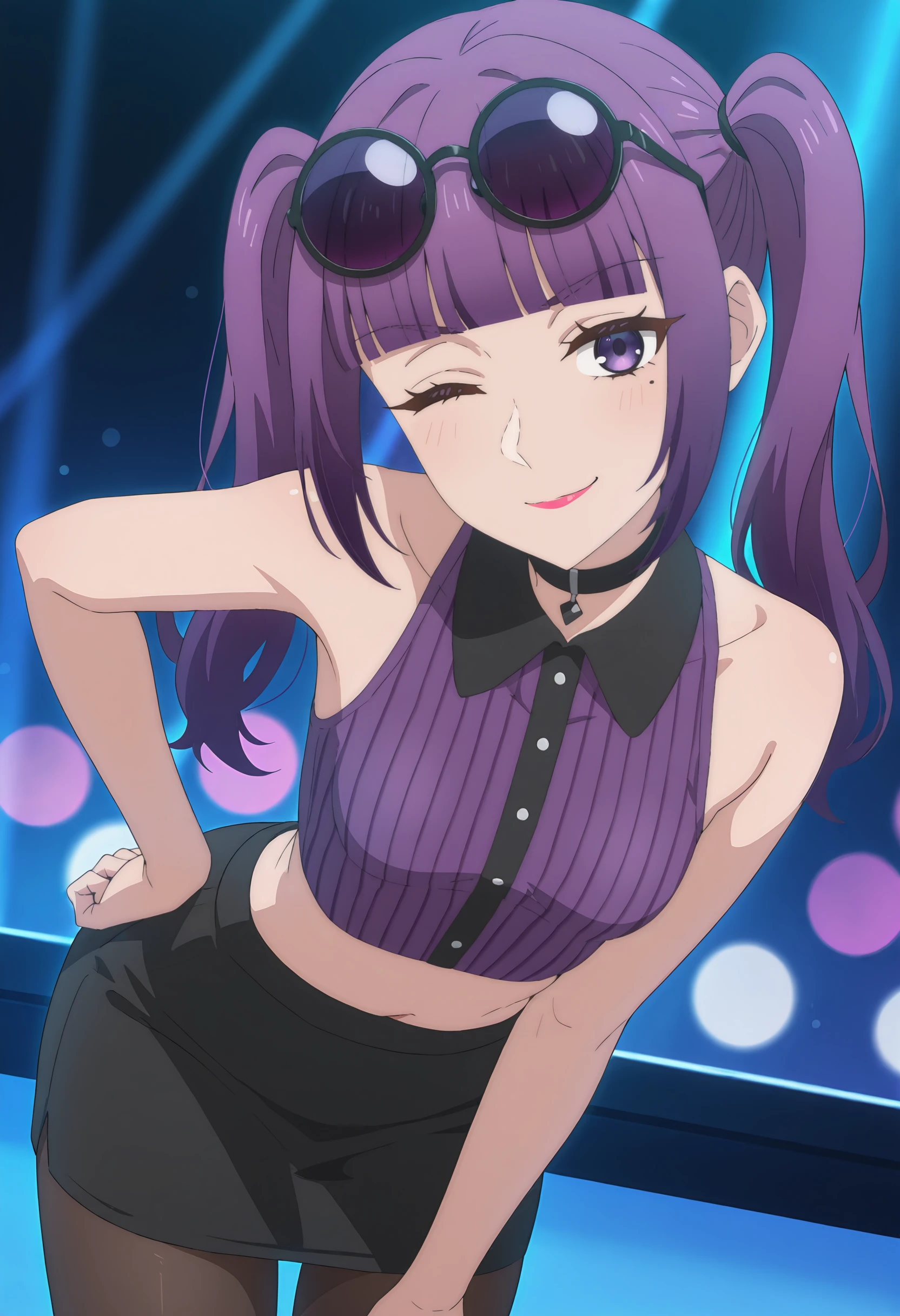 ZutaboroHannah, mole under eye, purple eyes, purple hair, long hair, single hair bun, sidelocks, blunt bangs, pink lipstick