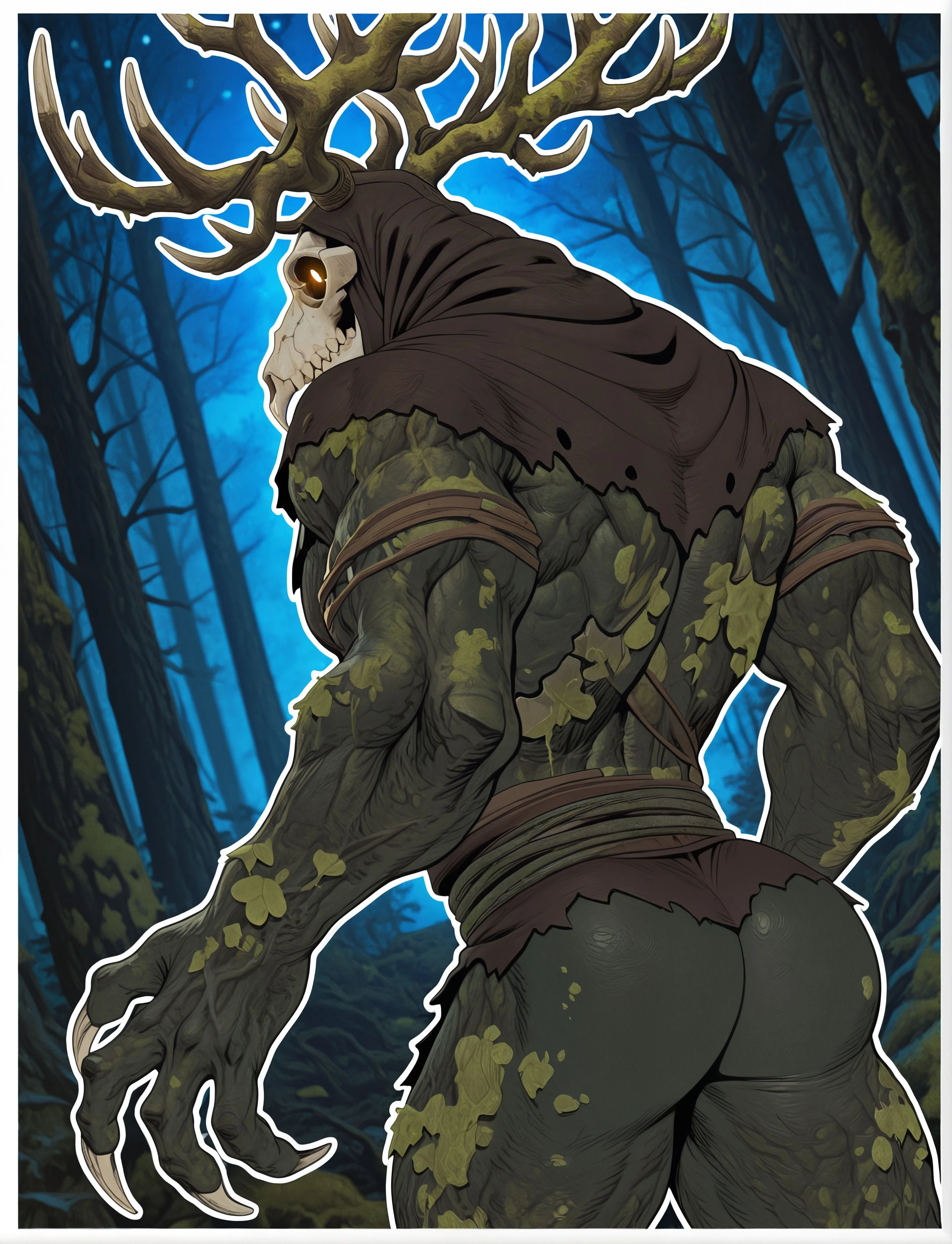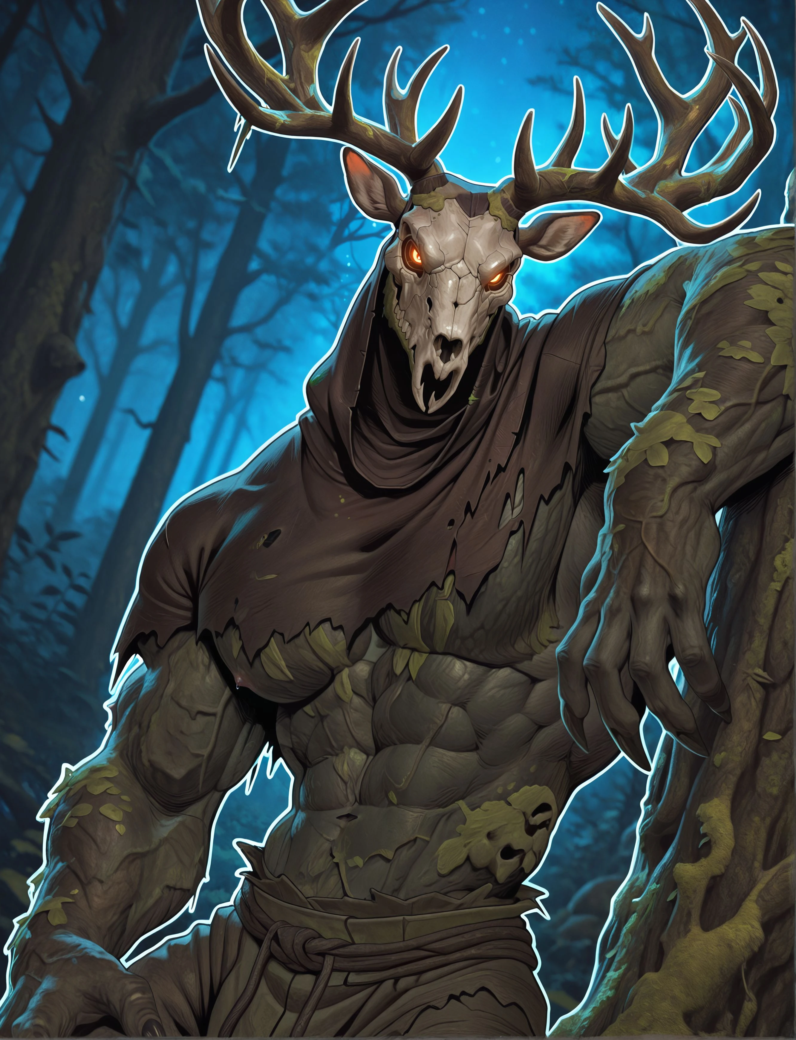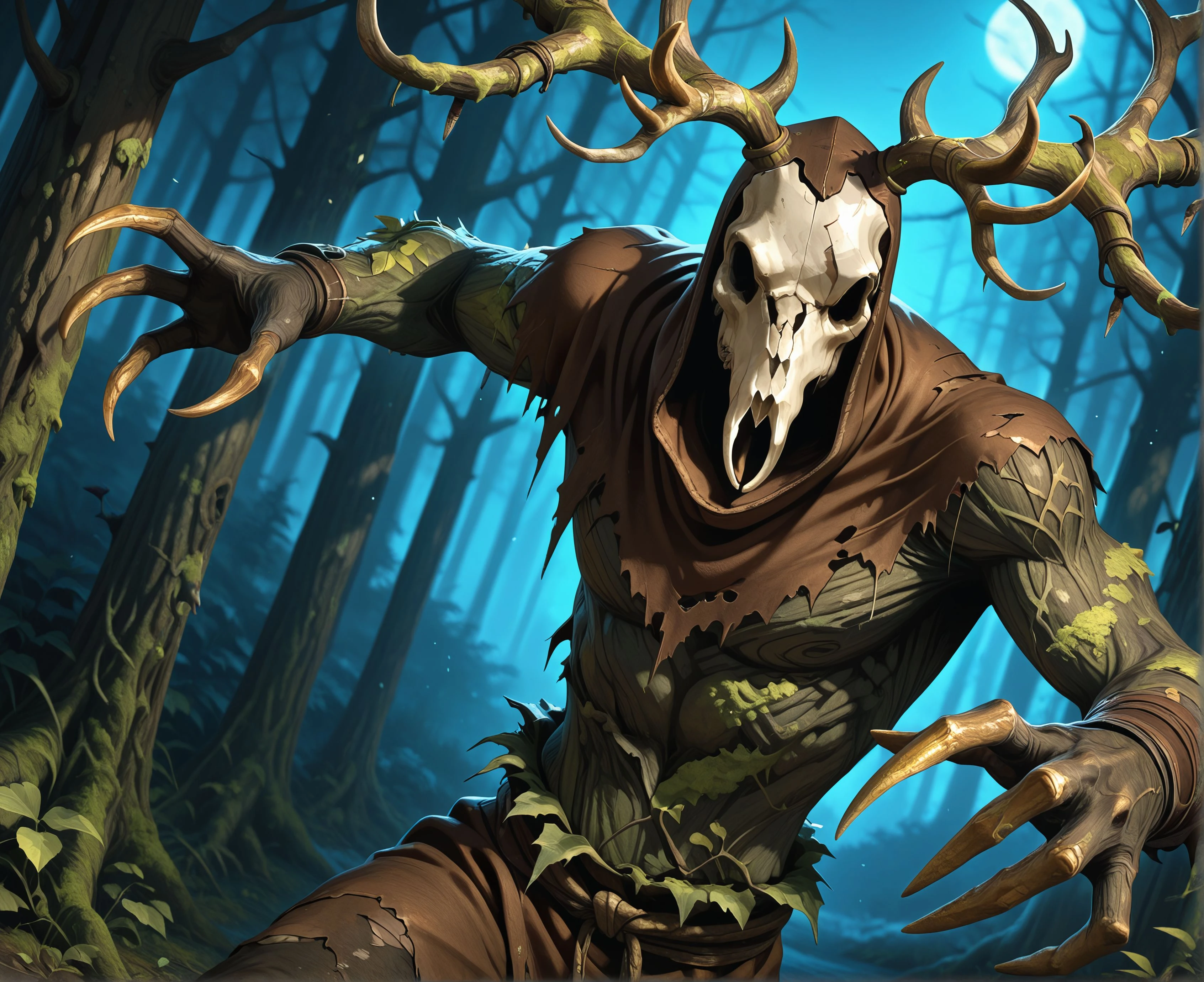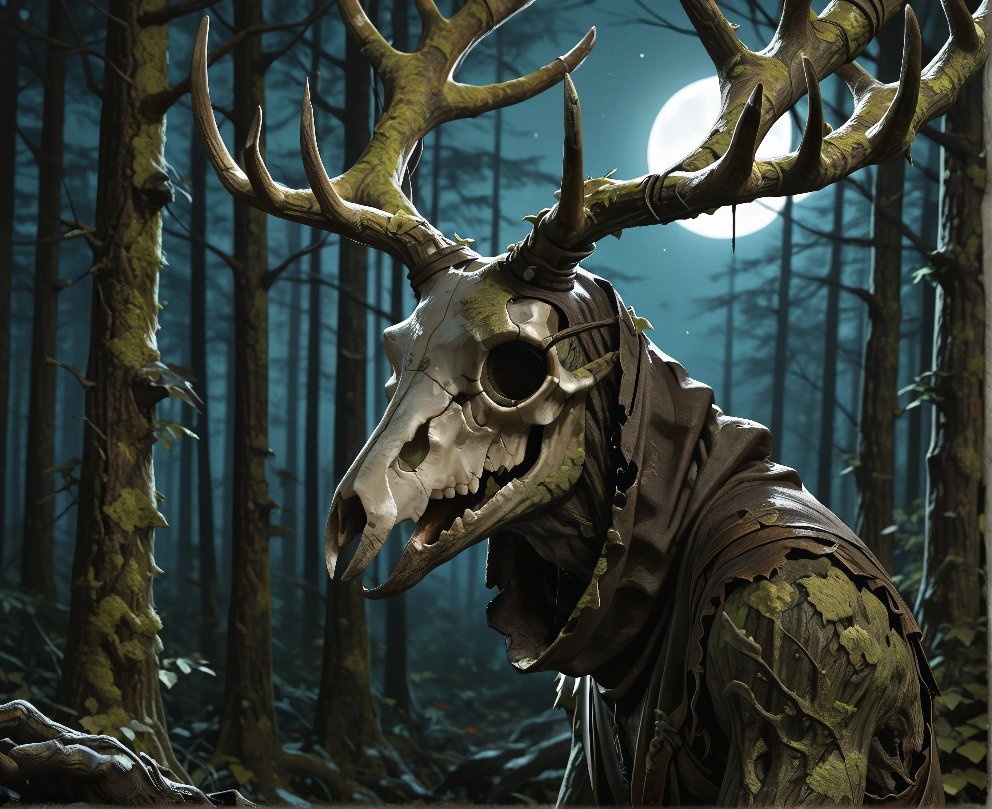Tags: l3sh3n, skull face, antlers, monster, creature, claws, long fingers, bark skin, tattered clothes, tall, deer skull, leafs, moss, cowl, skirt, torn clothes, branches