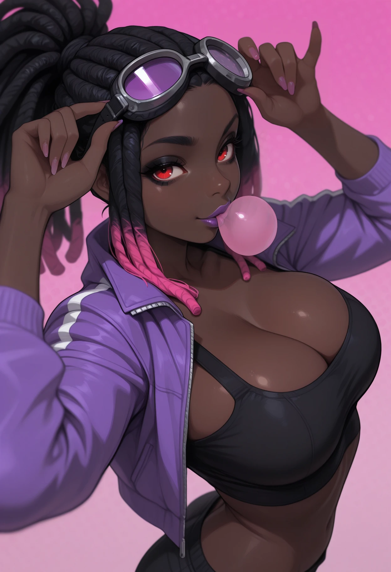 Riri_OC, Very Dark Skin, Red Eyes, Black Hair, Pink Tips, Dreadlocks, Large Breasts,