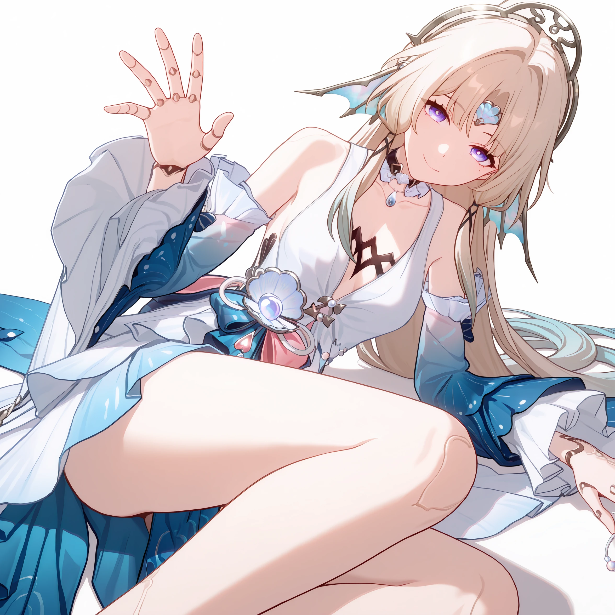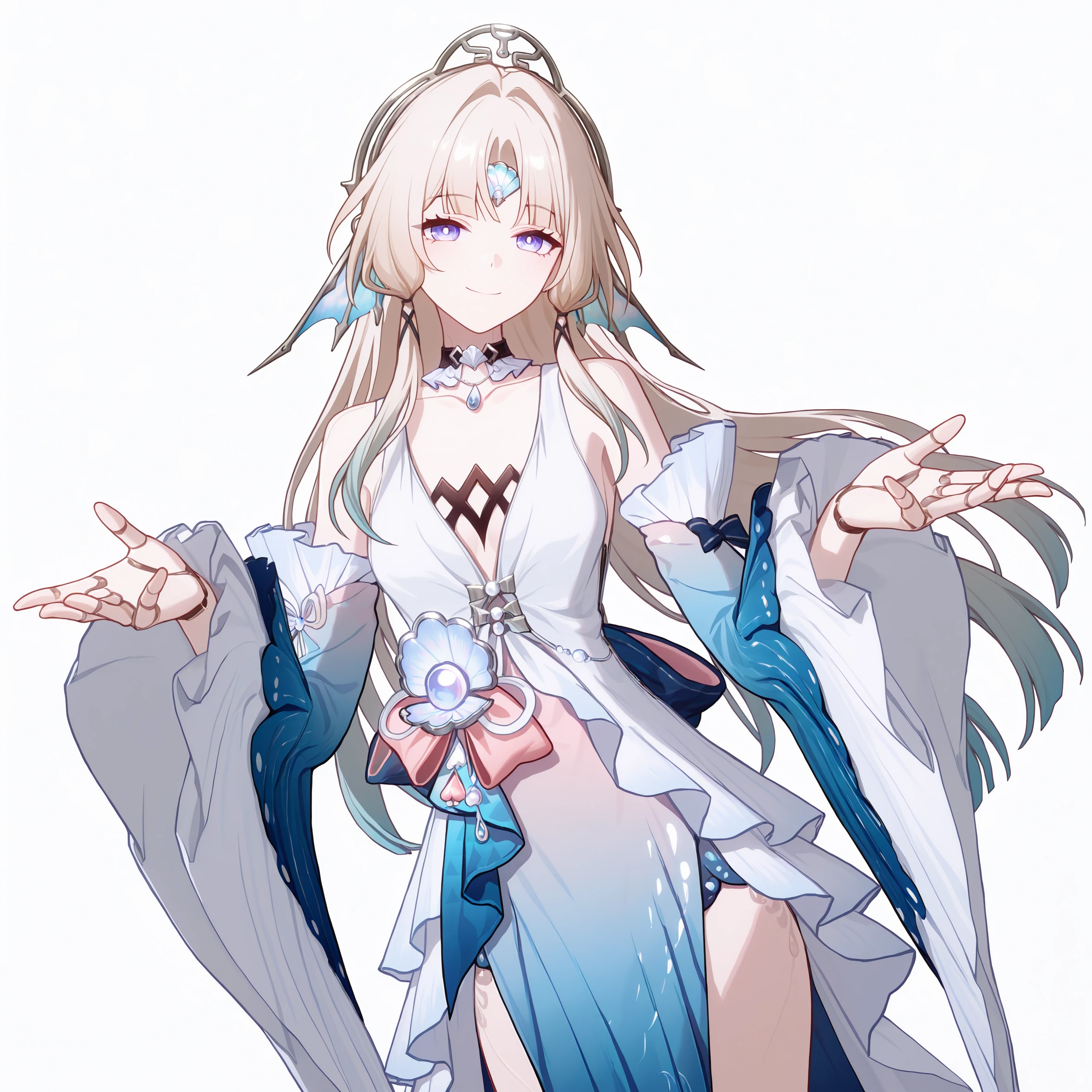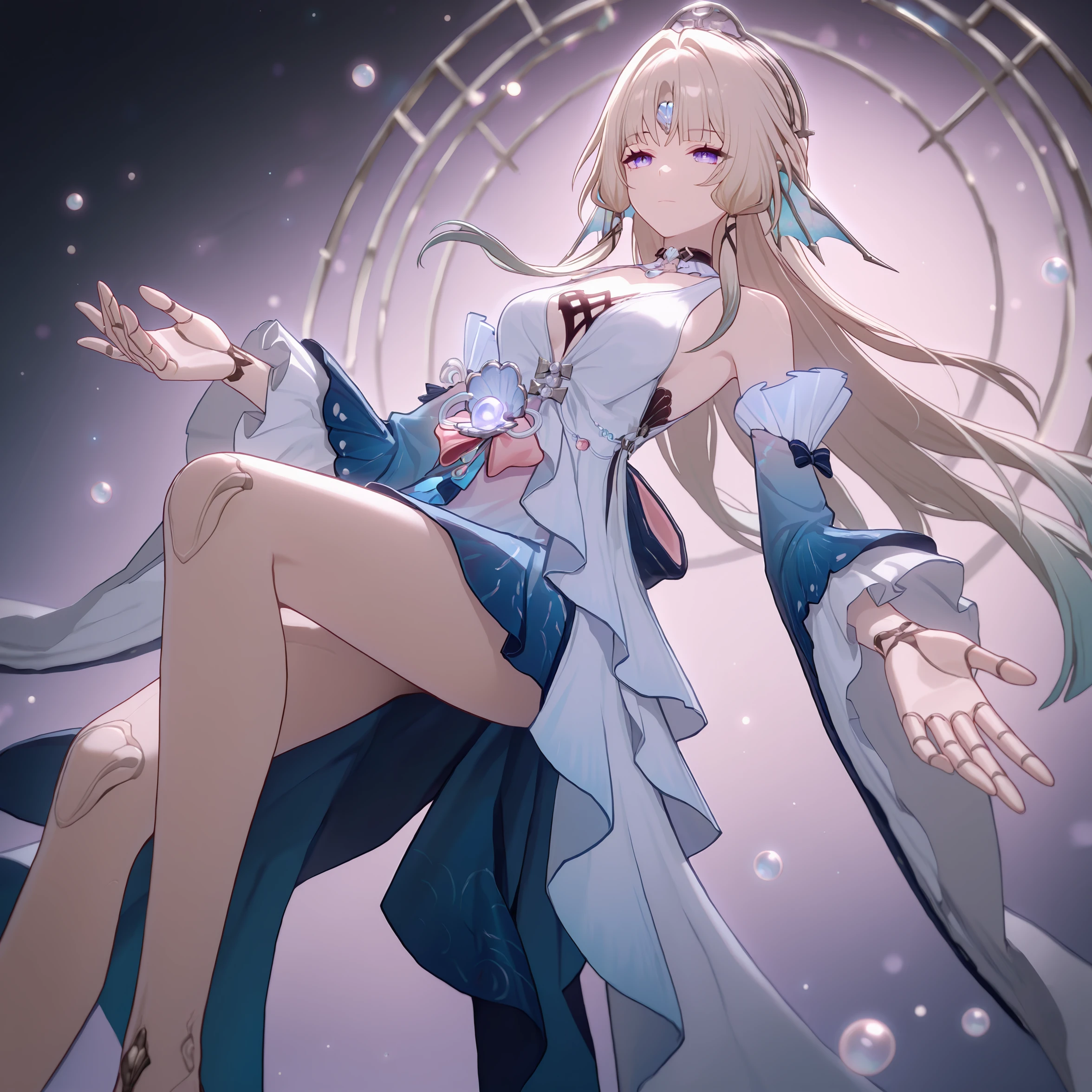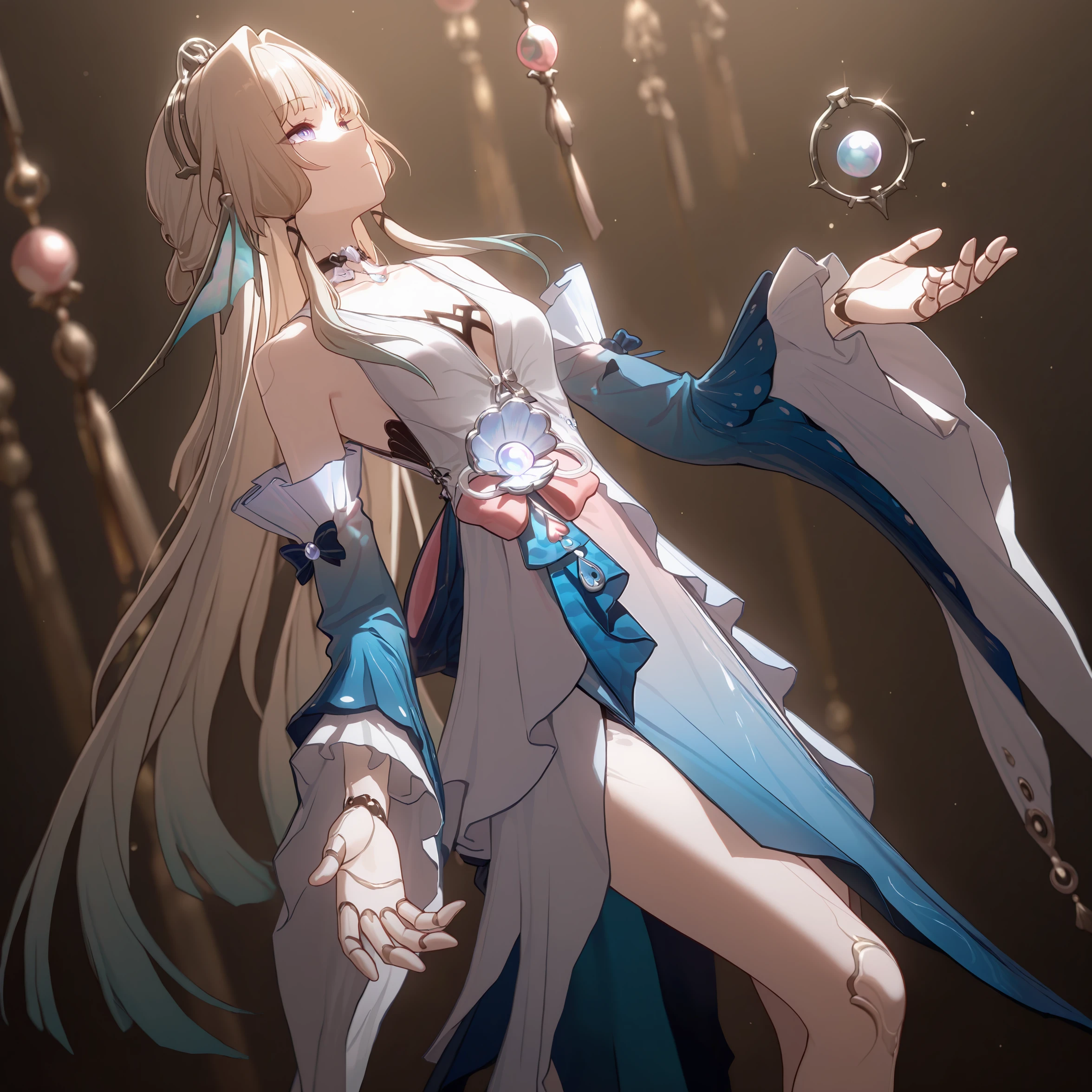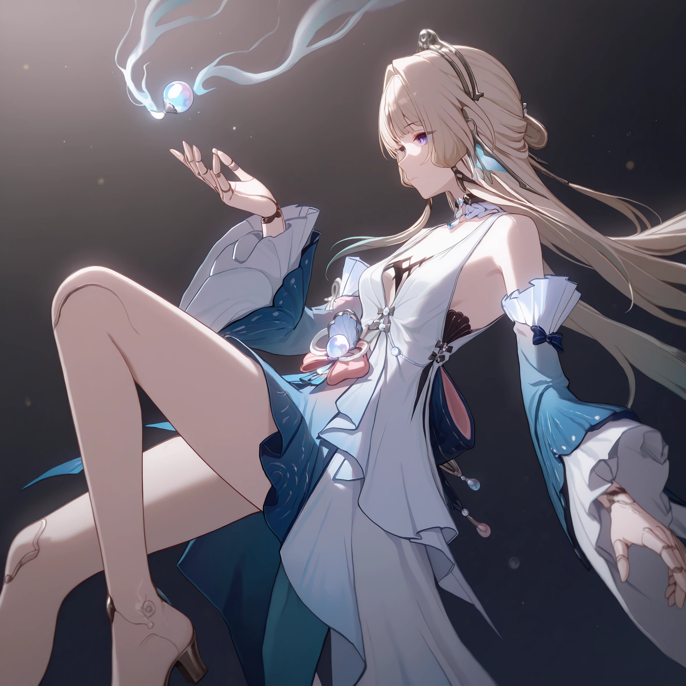 masterpiece, best quality, very aesthetic, newest, hires, Pearl, 1girl, solo, dress, detailed light, body floating, floating, dynamic angle, full body, depth of field, blurry background, ethereal scene, simple background,Others