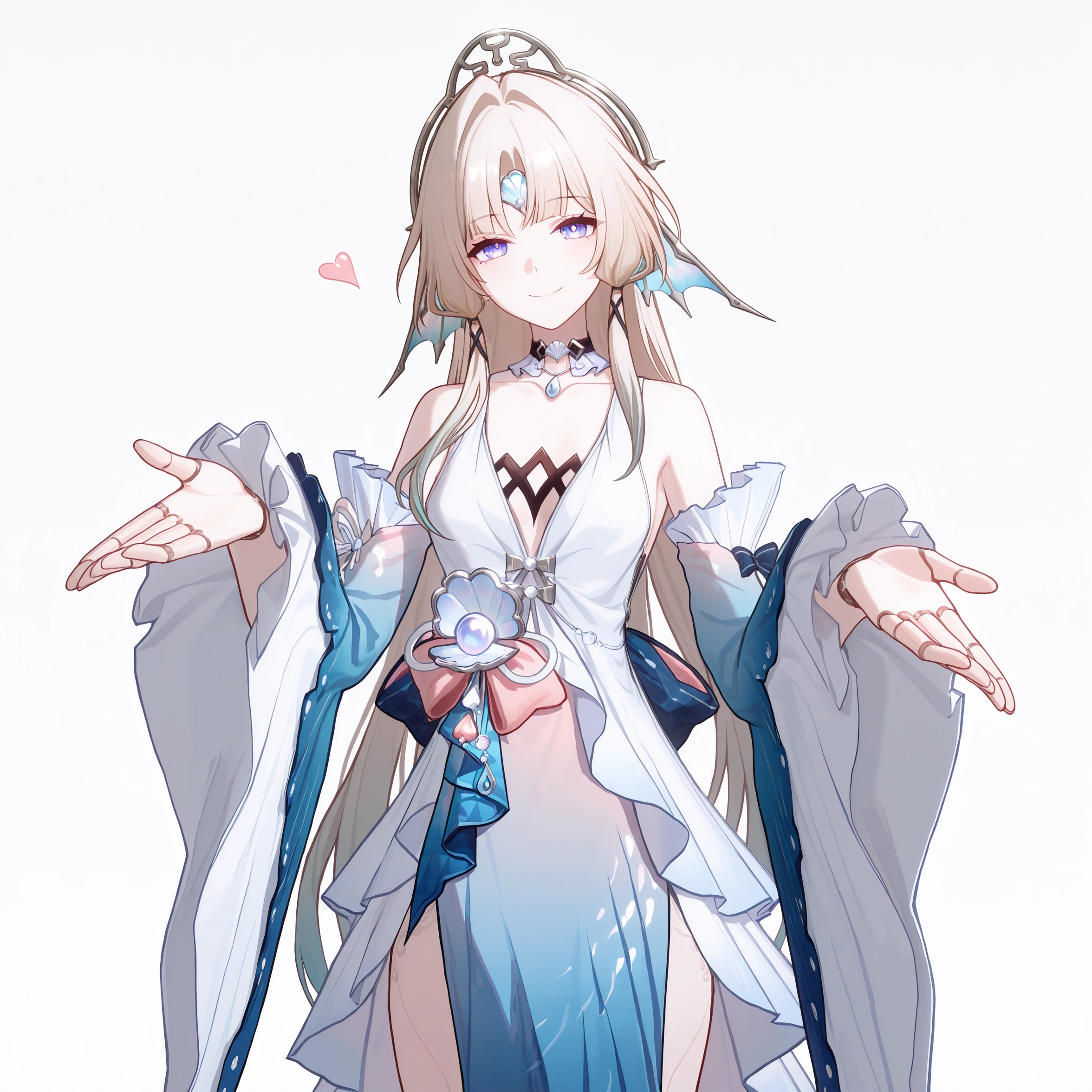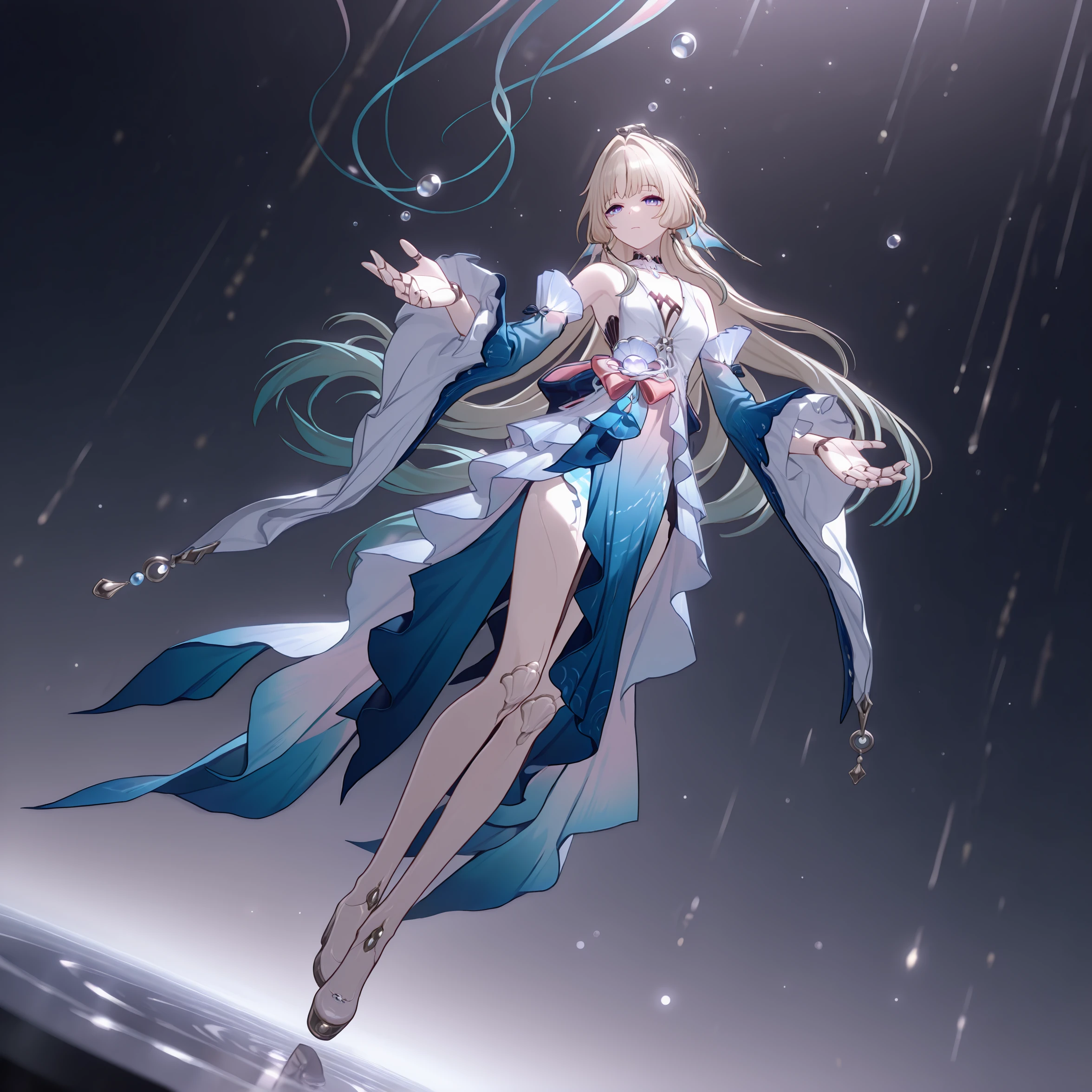 masterpiece, best quality, very aesthetic, newest, hires, Pearl, 1girl, solo, dress, detailed light, body floating, floating, dynamic angle, full body, depth of field, blurry background, ethereal scene, simple background,小记