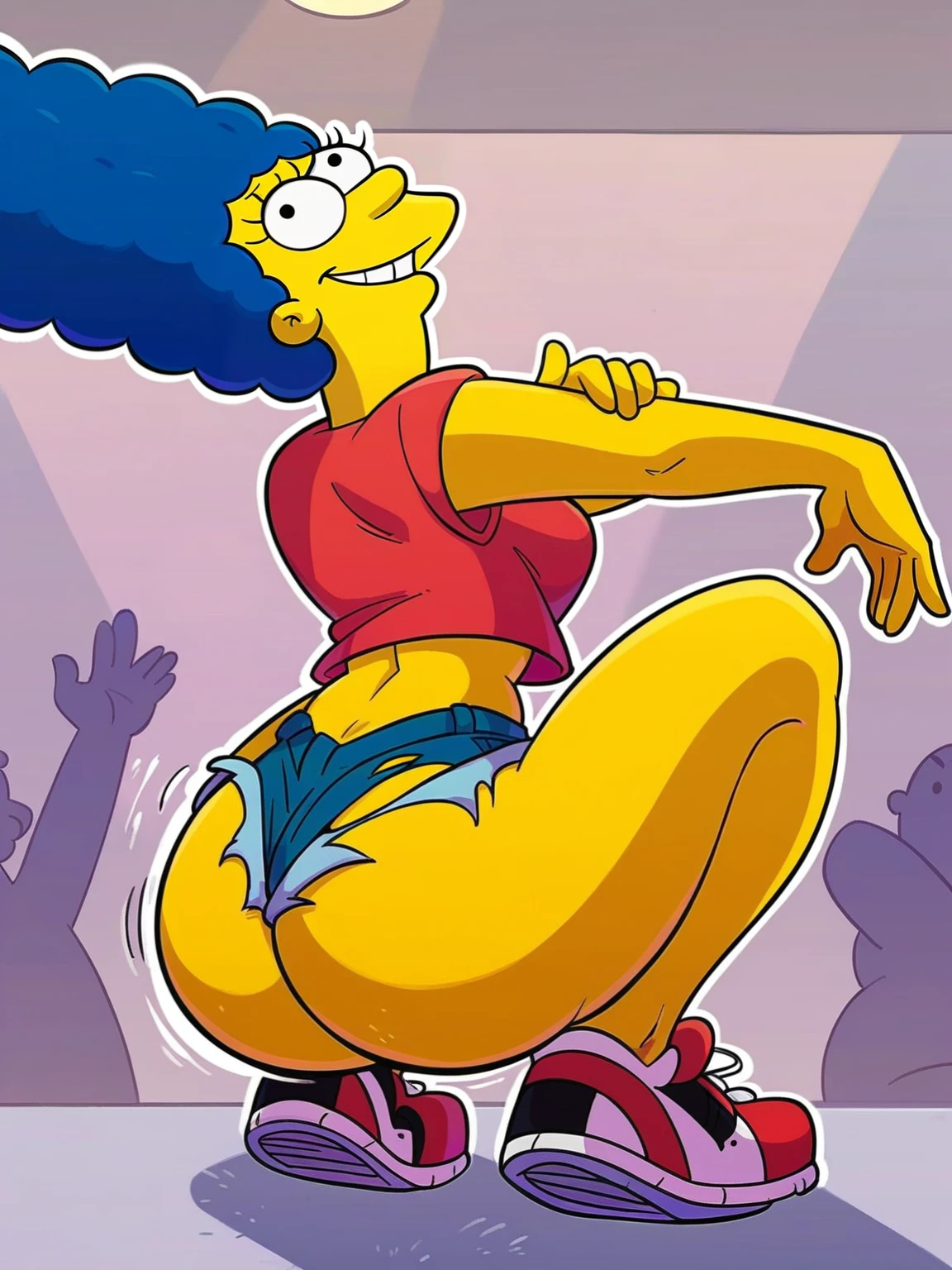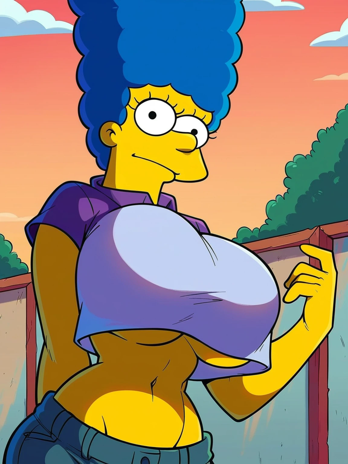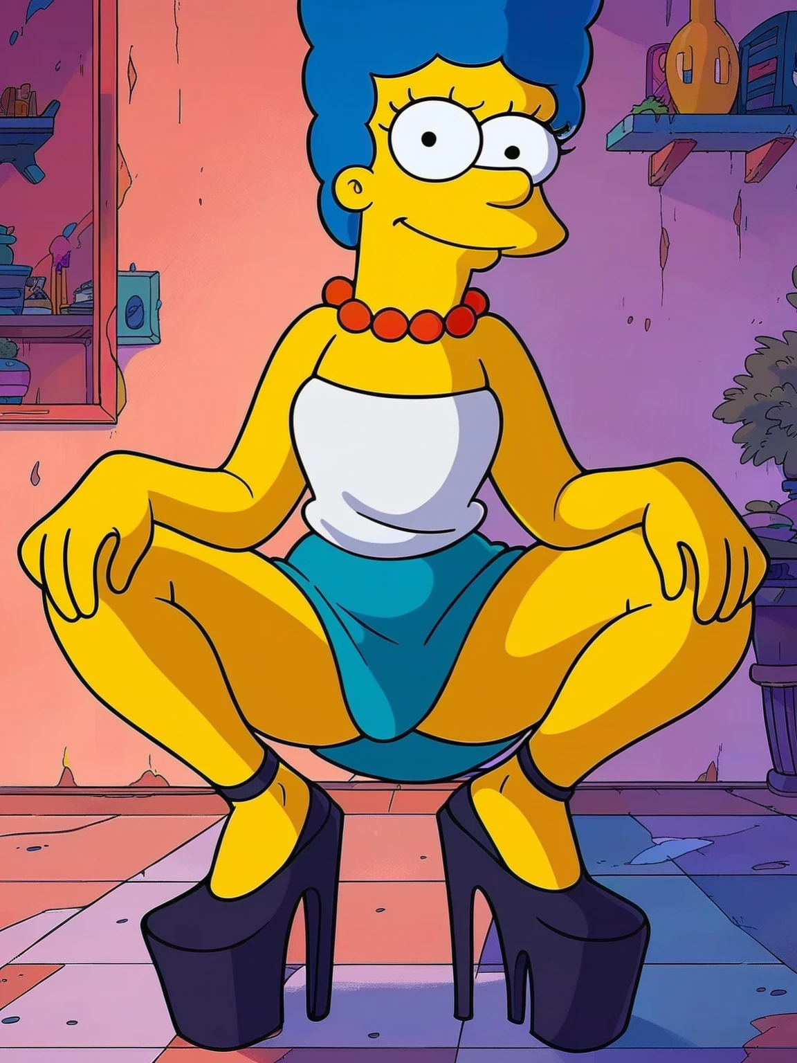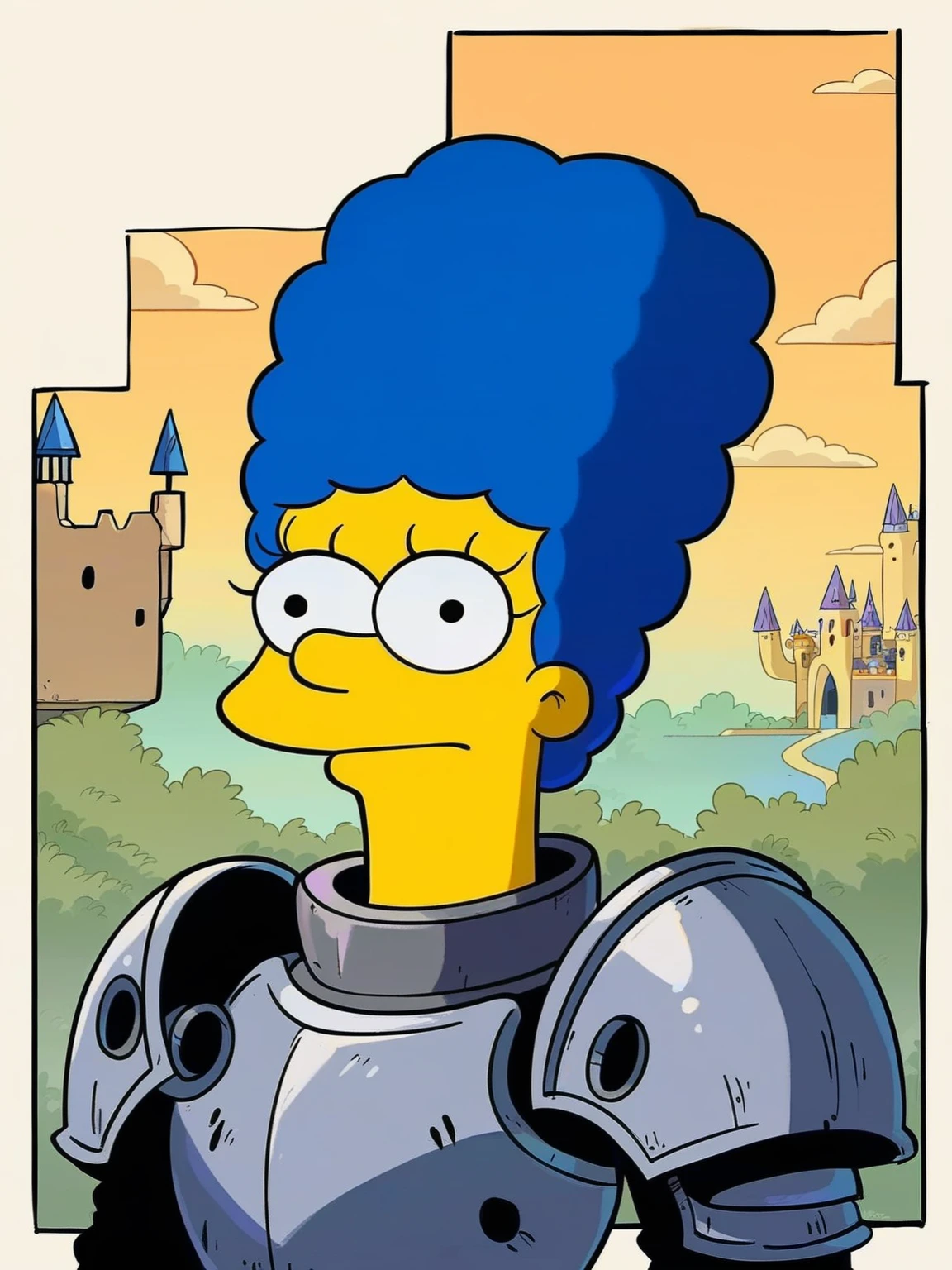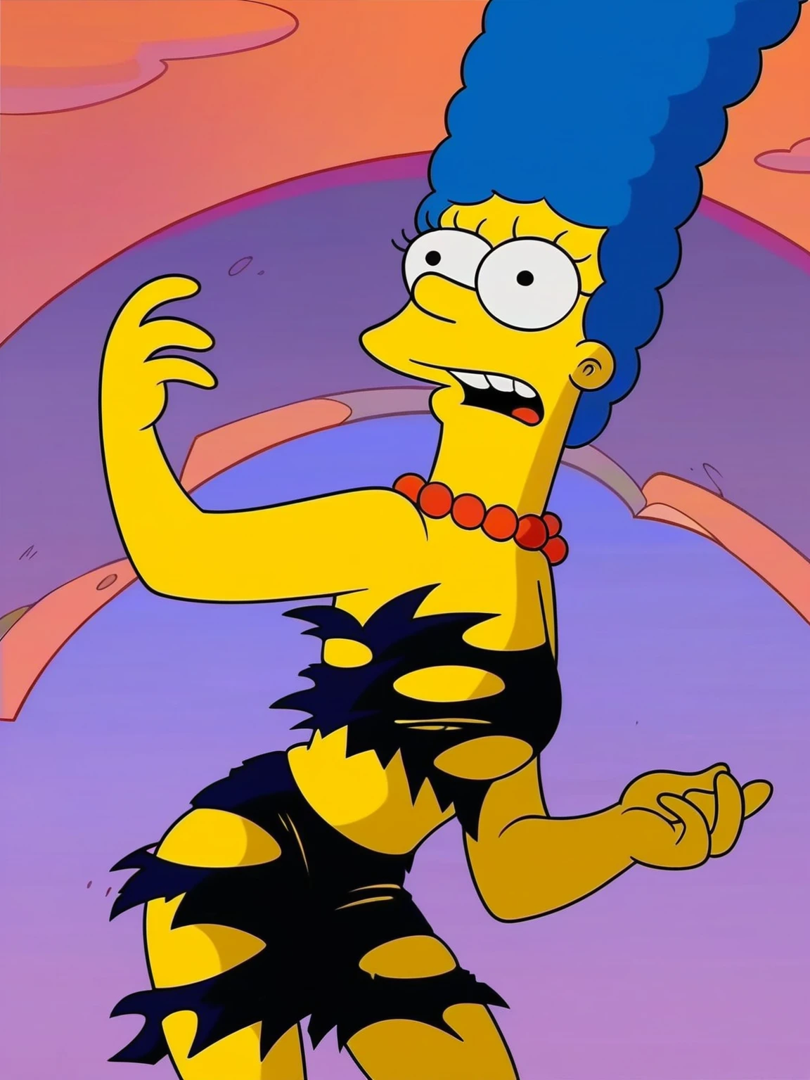 Recommend prompt: "m_s, 1girl, yellow skin, long lashes, long nose, blue hair, tall beehive hairstyle, round eyes with black pupils, black eyes"