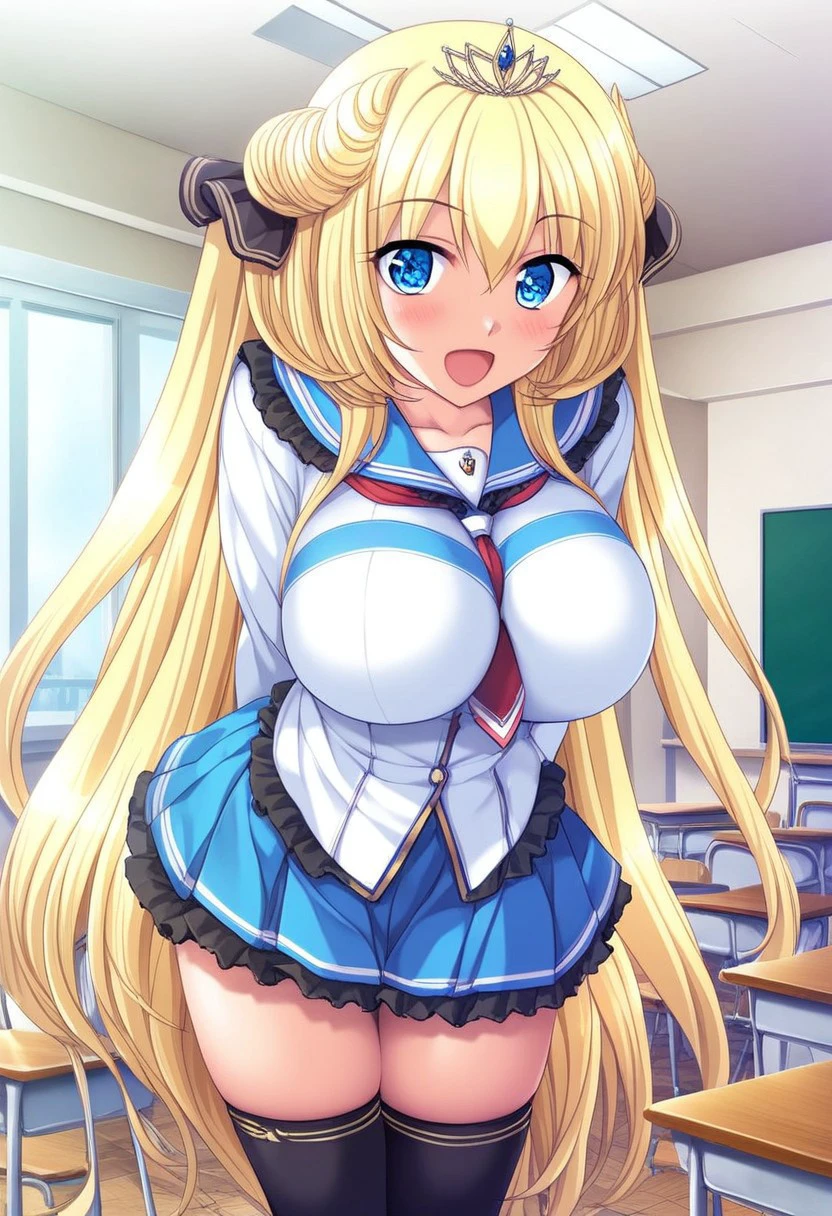 school uniform, white blouse, blue trimmings on blouse, red necktie, long sleeves, pleated blue skirt, thigh-high black stockings